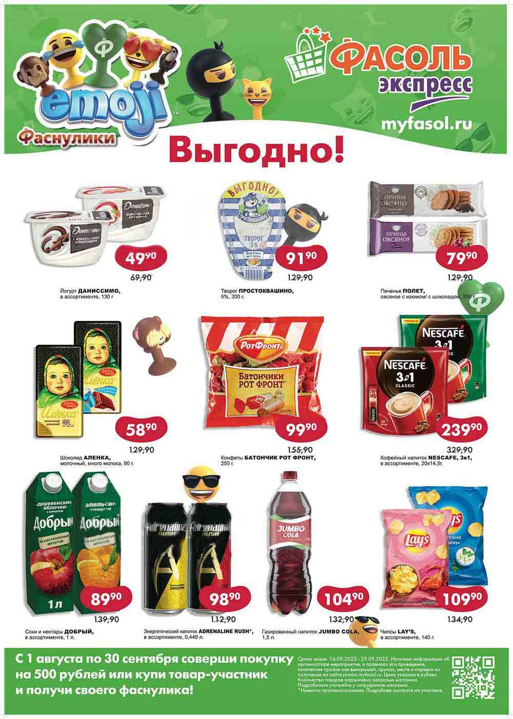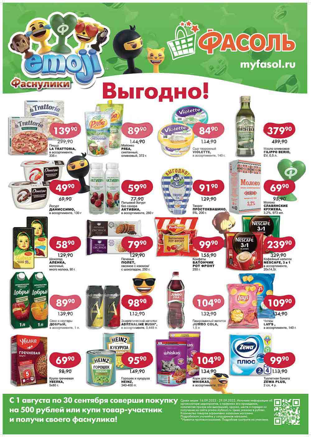 На страницах каталога Фасоль вы найдете все свои любимые товары, которые сейчас предлагаются в супермаркете. Кроме того скидки на этой неделе действуют на колбасную, молочную и замороженную продукцию. Компания ценит своих покупателей, поэтому экономит не только деньги, но и время. Не пропустите последние специальные предложения и сэкономьте на покупках. Цены по акции Фасоль действуют в городах: Москва, Балашиха, Химки, Подольск, Королев, Мытищи, Люберцы, Электросталь, Коломна, Одинцово, Железнодорожный, Серпухов, Орехово-Зуево, Красногорск, Щелково, Сергиев Посад, Пушкино, Воскресенск, Домодедово и многих других населенных пунктах Московского региона.