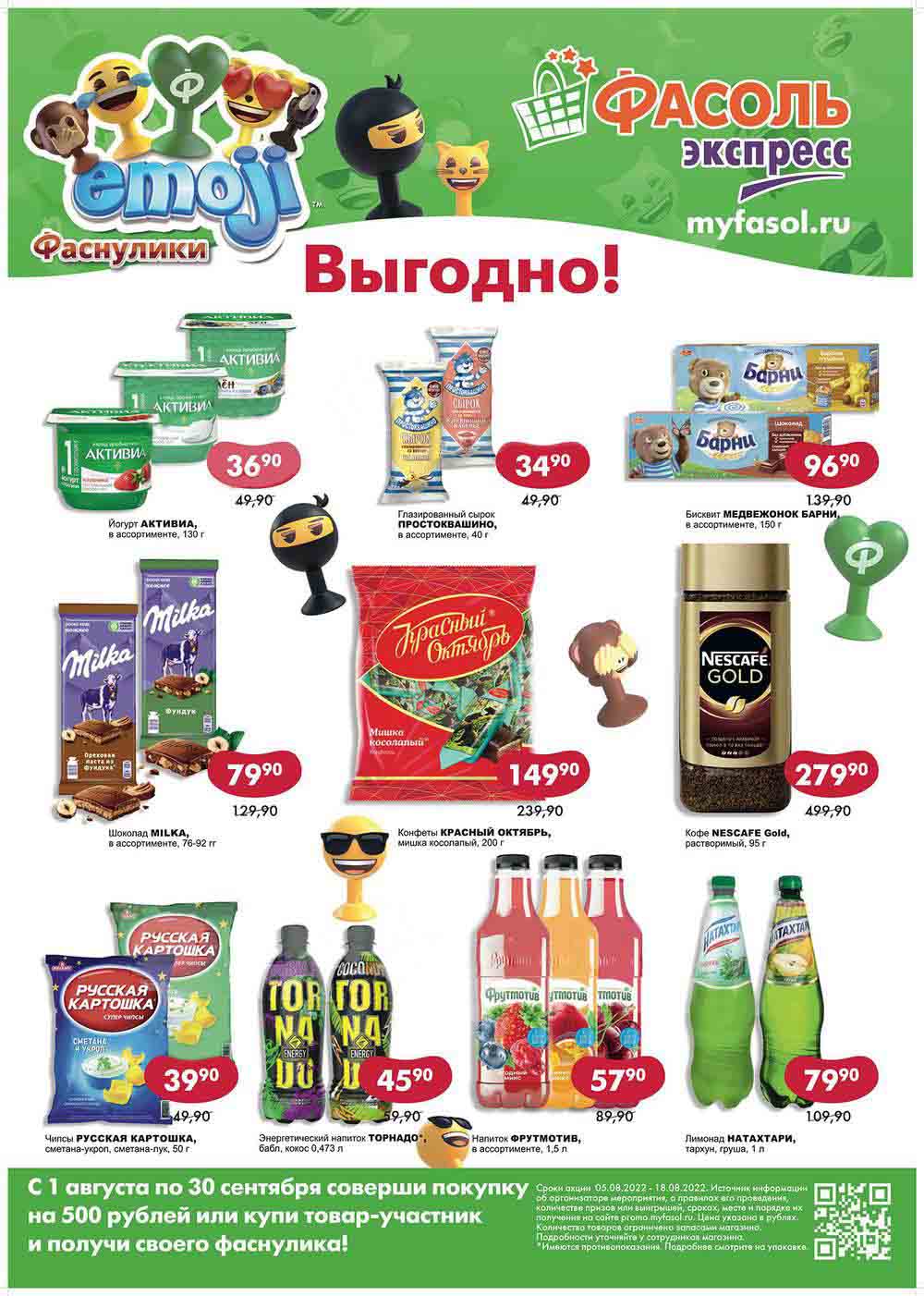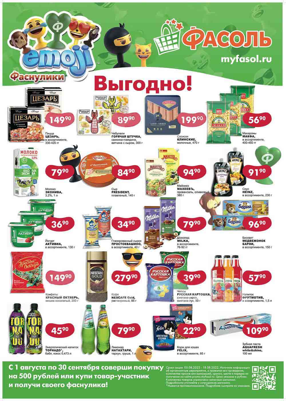 На страницах каталога Фасоль вы найдете все свои любимые товары, которые сейчас предлагаются в супермаркете. Кроме того скидки на этой неделе действуют на колбасную, молочную и замороженную продукцию. Компания ценит своих покупателей, поэтому экономит не только деньги, но и время. Не пропустите последние специальные предложения и сэкономьте на покупках. Цены по акции Фасоль действуют в городах: Москва, Балашиха, Химки, Подольск, Королев, Мытищи, Люберцы, Электросталь, Коломна, Одинцово, Железнодорожный, Серпухов, Орехово-Зуево, Красногорск, Щелково, Сергиев Посад, Пушкино, Воскресенск, Домодедово и многих других населенных пунктах Московского региона.