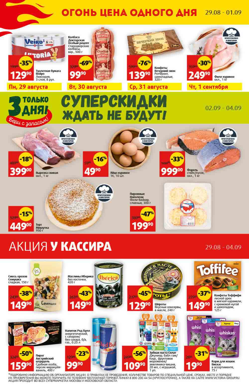 На сегодня 31.12.2025 магазины Виктория в городах: Москва, Химки, Люберцы, Железнодорожный, Красногорск, Долгопрудный, Лыткарино, Реутов и многих других населенных пунктах Московского региона ЗАКРЫТЫ. Действующих каталогов акций "Виктория" в этих городах нет. Компания X5 Group выкупила сеть и весной 2024 года закрылась последняя «Виктория» в Москве.