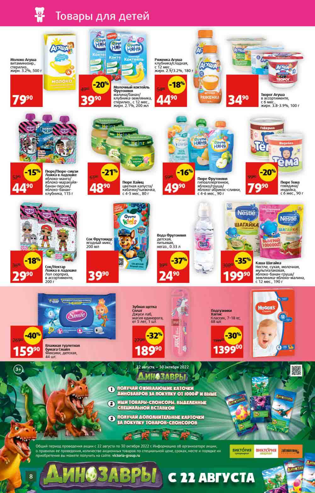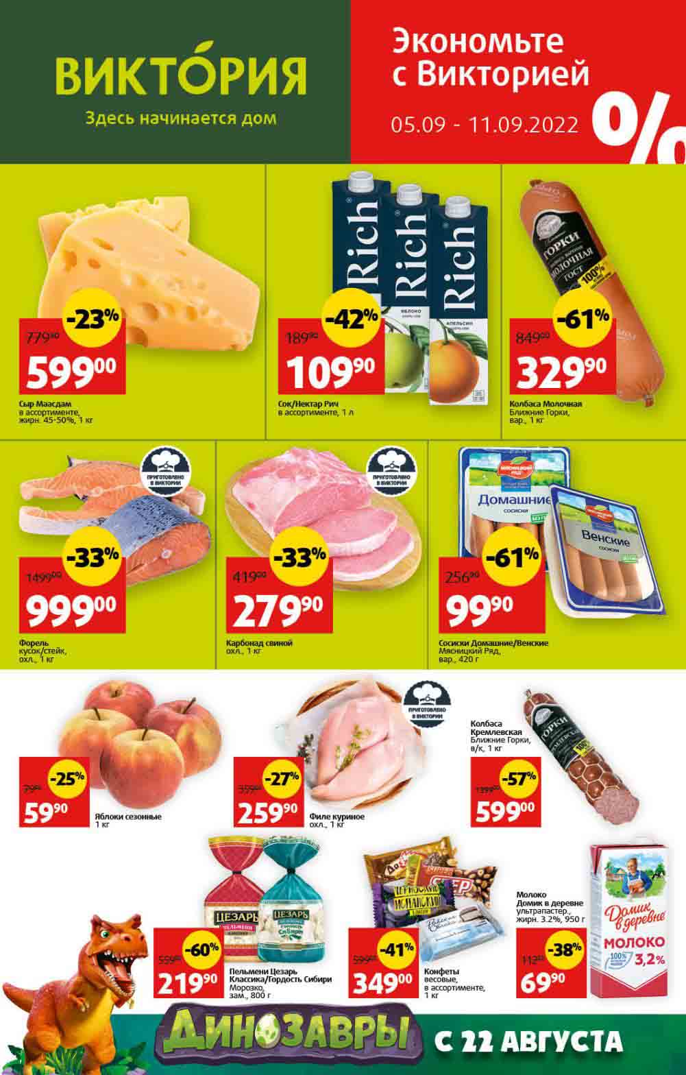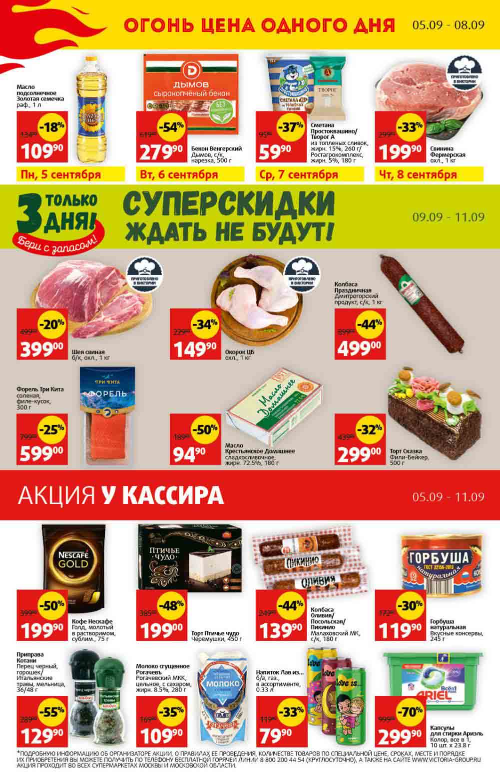 На сегодня 08.11.2025 магазины Виктория в городах: Москва, Химки, Люберцы, Железнодорожный, Красногорск, Долгопрудный, Лыткарино, Реутов и многих других населенных пунктах Московского региона ЗАКРЫТЫ. Действующих каталогов акций "Виктория" в этих городах нет. Компания X5 Group выкупила сеть и весной 2024 года закрылась последняя «Виктория» в Москве.