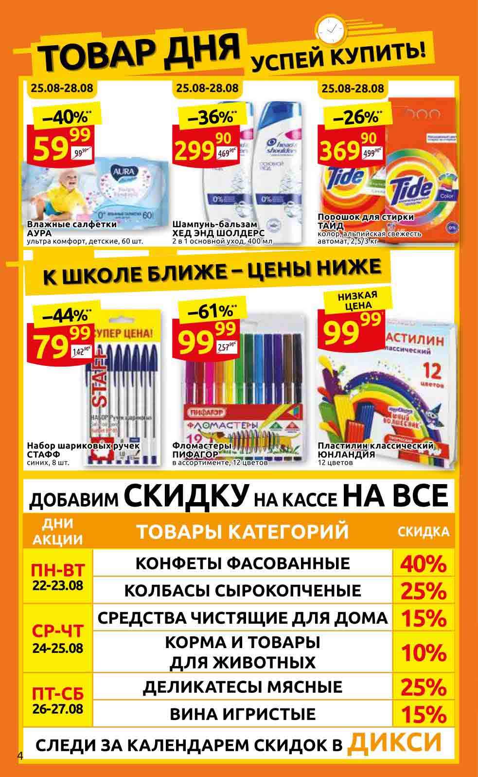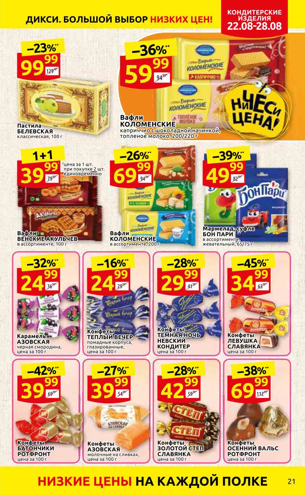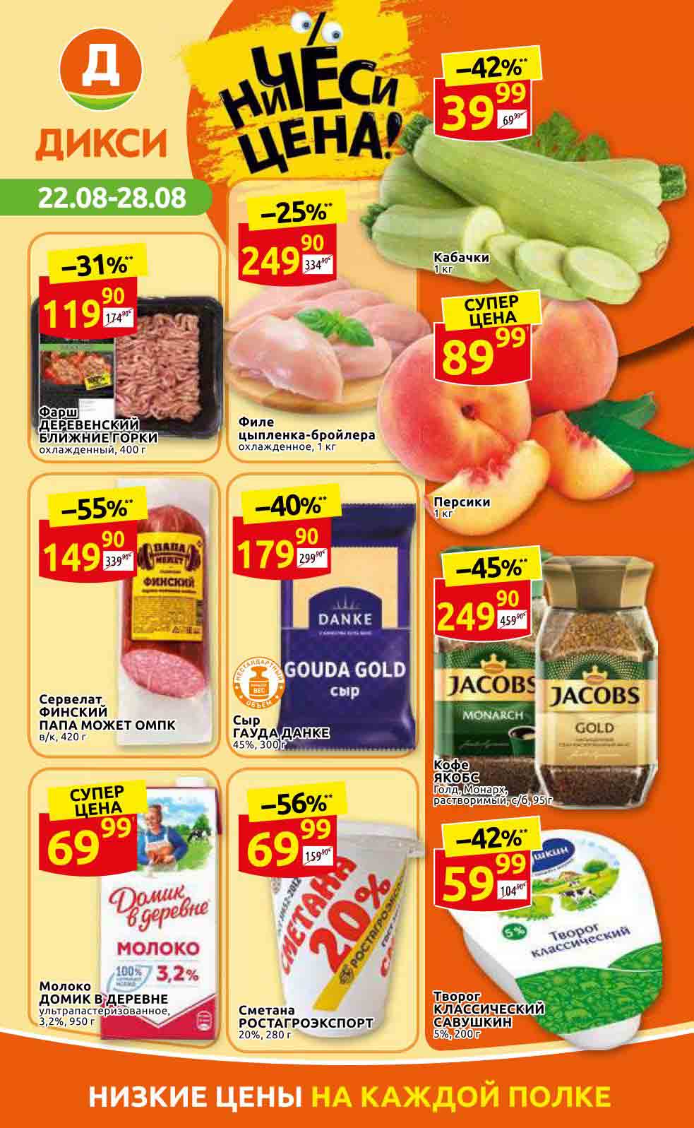 Смотрите еженедельный, новый каталог Дикси и не переплачивайте уже сегодня вас ждут ряд интересных акций и привлекательных скидок. Обо всем этом вы сможете узнать посмотрев новый каталог Дикси на нашем сайте. На страницах каталога Дикси вы найдете все свои любимые продукты, которые сейчас предлагаются в супермаркете. Предложения, представленные в настоящем буклете, действительны в указанный срок проведения. Стоимость указана за единицу товара (за исключением весового, цена которого определена за конкретный вес, указанный в настоящем буклете). В акции участвуют позиции, изображение которых размещено в каталоге. Цены в супермаркетах могут быть дополнительно снижены по решению руководства сети. Цены помеченные «*», обозначают среднюю цену данной позиции по сети. Количество товара ограничено и может не везде присутствовать. Цены по акции Дикси действуют в городах: Москва, Балашиха, Химки, Подольск, Королев, Мытищи, Люберцы, Электросталь, Коломна, Одинцово, Железнодорожный, Серпухов, Орехово-Зуево, Красногорск, Щелково, Сергиев Посад, Пушкино, Жуковский, Ногинск, Раменское, Клин, Воскресенск, Домодедово и многих других населенных пунктах Московского региона.