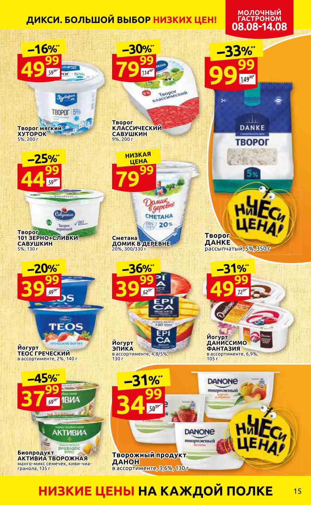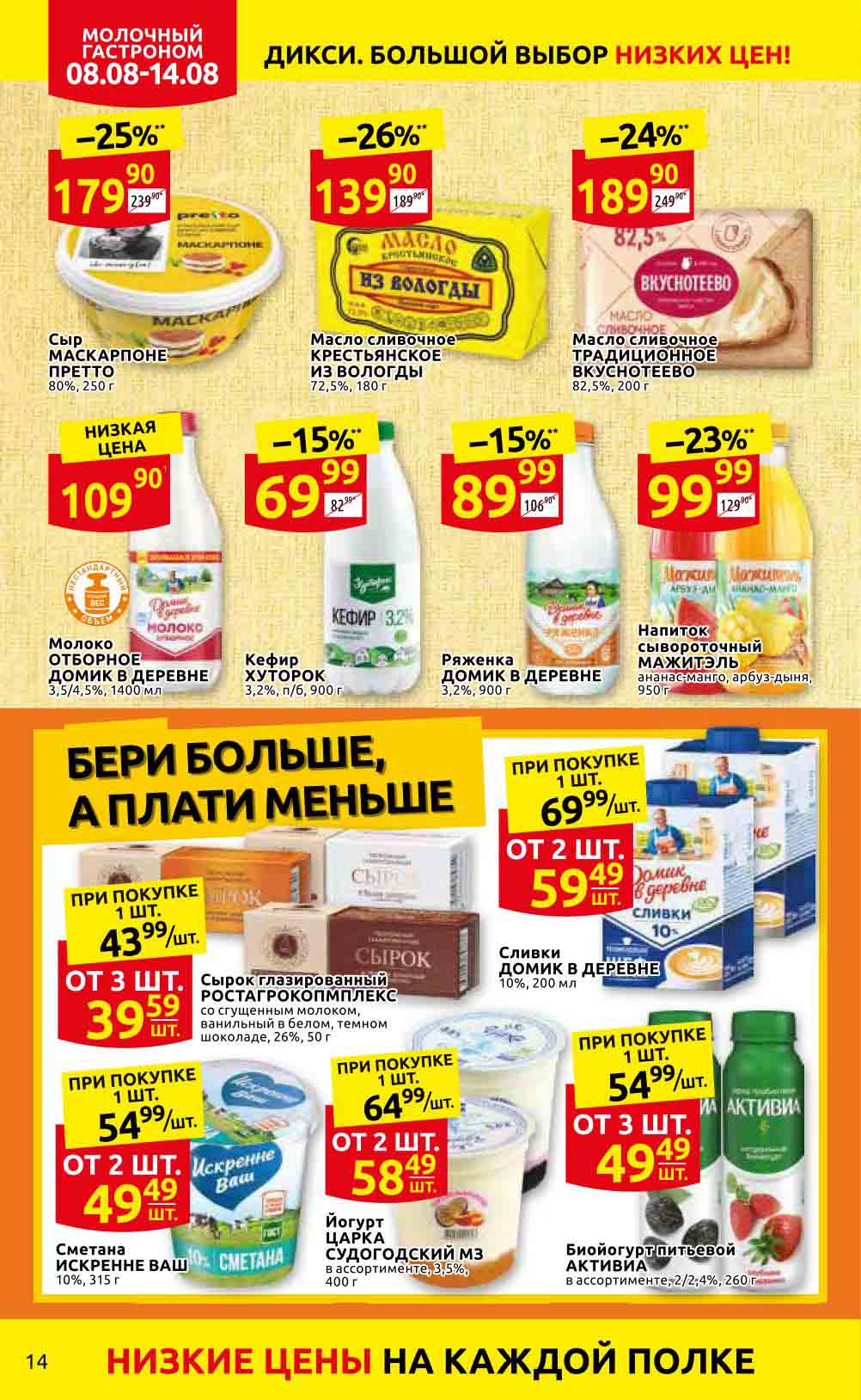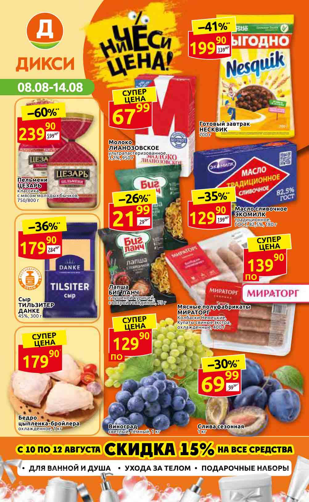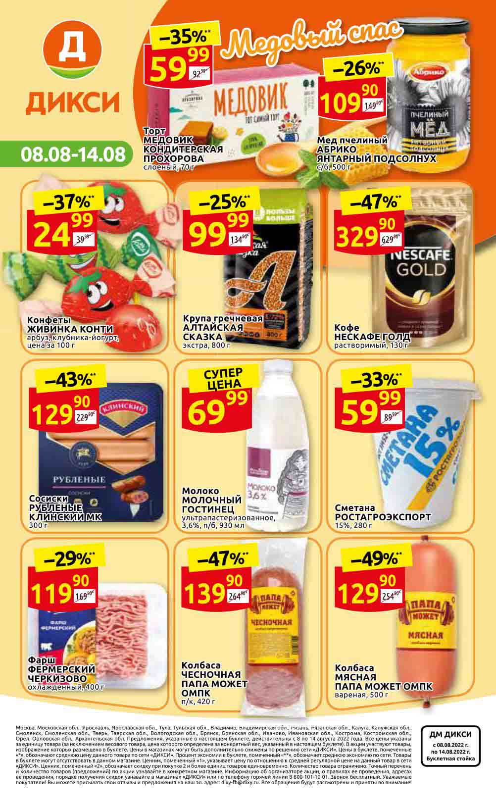 Смотрите еженедельный, новый каталог Дикси и не переплачивайте уже сегодня вас ждут ряд интересных акций и привлекательных скидок. Обо всем этом вы сможете узнать посмотрев новый каталог Дикси на нашем сайте. На страницах каталога Дикси вы найдете все свои любимые продукты, которые сейчас предлагаются в супермаркете. Предложения, представленные в настоящем буклете, действительны в указанный срок проведения. Стоимость указана за единицу товара (за исключением весового, цена которого определена за конкретный вес, указанный в настоящем буклете). В акции участвуют позиции, изображение которых размещено в каталоге. Цены в супермаркетах могут быть дополнительно снижены по решению руководства сети. Цены помеченные «*», обозначают среднюю цену данной позиции по сети. Количество товара ограничено и может не везде присутствовать. Цены по акции Дикси действуют в городах: Москва, Балашиха, Химки, Подольск, Королев, Мытищи, Люберцы, Электросталь, Коломна, Одинцово, Железнодорожный, Серпухов, Орехово-Зуево, Красногорск, Щелково, Сергиев Посад, Пушкино, Жуковский, Ногинск, Раменское, Клин, Воскресенск, Домодедово и многих других населенных пунктах Московского региона.