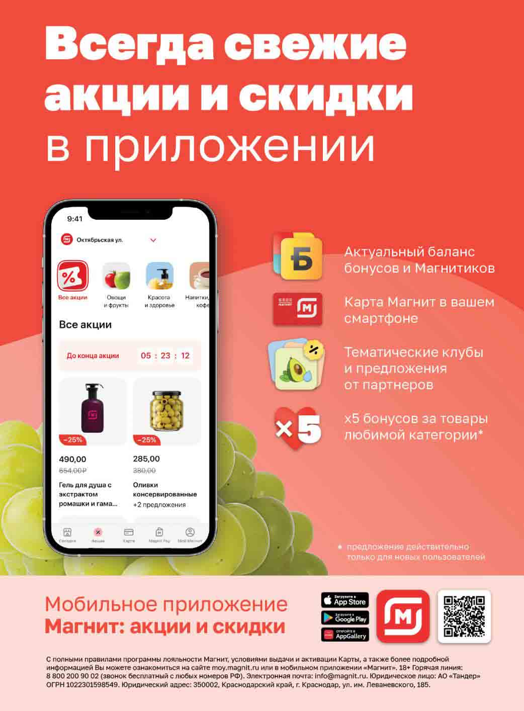 Подробную информацию об правилах, наличии товаров, адресах и скидках узнавайте в магазинах или по тел.: 8 800 200-90-02 и на сайте: cosmetic.magnit.ru