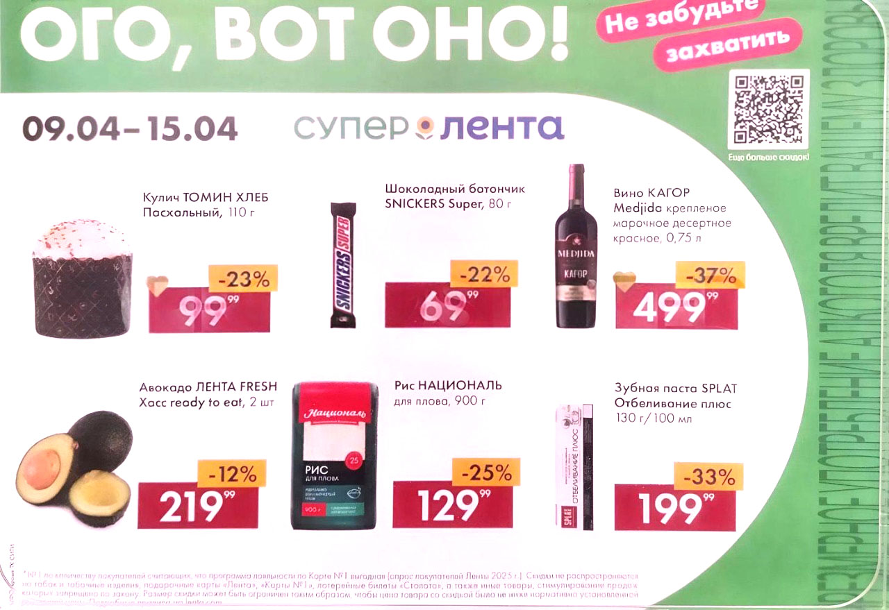 На этой неделе Супер Лента сделала акцент на бакалее и выпечке. Рис Националь по 129 ₽ — выгодное предложение. Обычно пачка 900 г стоит около 170 ₽. Если готовите плов на семью, стоит взять 2 упаковки. Кулич Томин Хлеб по 99 ₽ порадует близких. Вес 110 г — это одна порция. Берите свежие экземпляры в начале недели. Авокадо Хасс (2 шт. за 219 ₽) спелое и мягкое. Обычно цена составляет 250-270 ₽. Удобно для завтраков и салатов.