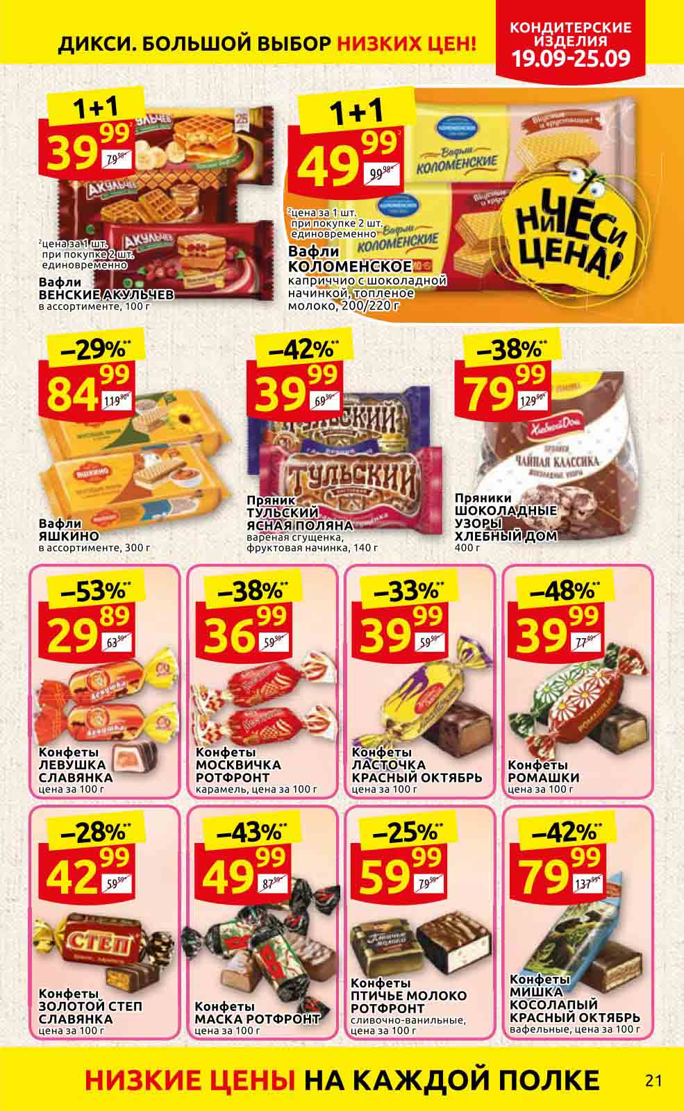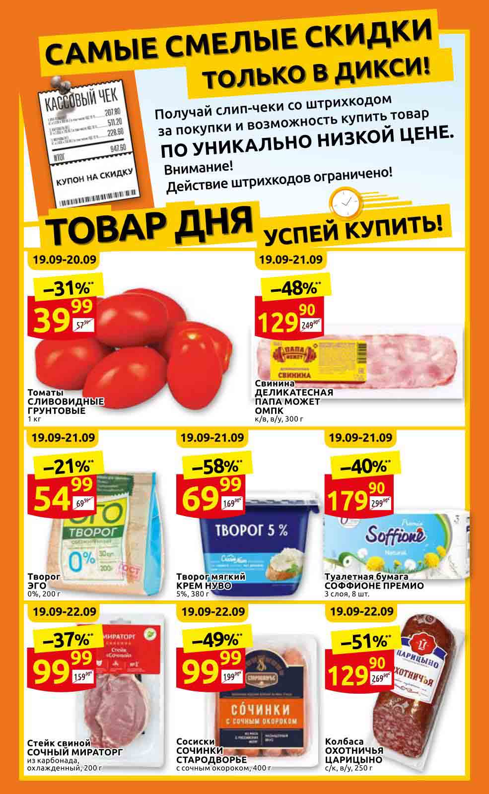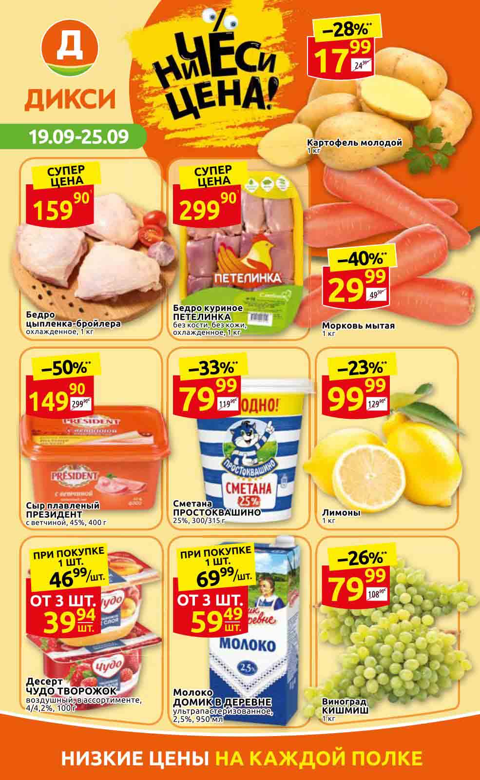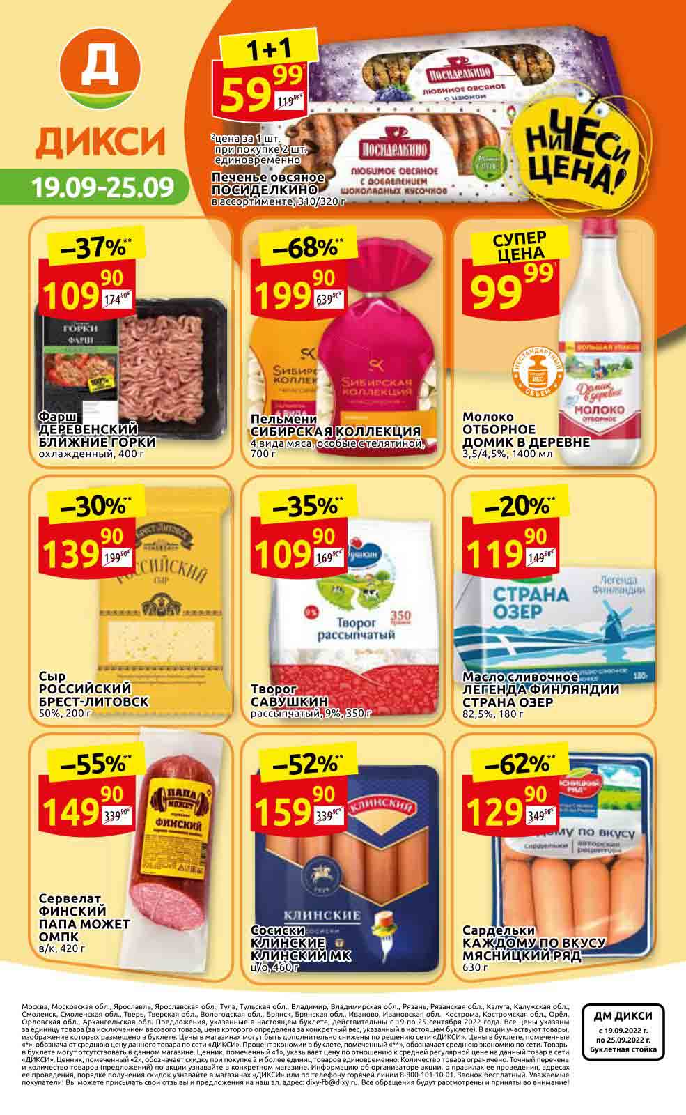 Смотрите еженедельный, новый каталог Дикси и не переплачивайте уже сегодня вас ждут ряд интересных акций и привлекательных скидок. Обо всем этом вы сможете узнать посмотрев новый каталог Дикси на нашем сайте. На страницах каталога Дикси вы найдете все свои любимые продукты, которые сейчас предлагаются в супермаркете. Предложения, представленные в настоящем буклете, действительны в указанный срок проведения. Стоимость указана за единицу товара (за исключением весового, цена которого определена за конкретный вес, указанный в настоящем буклете). В акции участвуют позиции, изображение которых размещено в каталоге. Цены в супермаркетах могут быть дополнительно снижены по решению руководства сети. Цены помеченные «*», обозначают среднюю цену данной позиции по сети. Количество товара ограничено и может не везде присутствовать. Цены по акции Дикси действуют в городах: Москва, Балашиха, Химки, Подольск, Королев, Мытищи, Люберцы, Электросталь, Коломна, Одинцово, Железнодорожный, Серпухов, Орехово-Зуево, Красногорск, Щелково, Сергиев Посад, Пушкино, Жуковский, Ногинск, Раменское, Клин, Воскресенск, Домодедово и многих других населенных пунктах Московского региона.