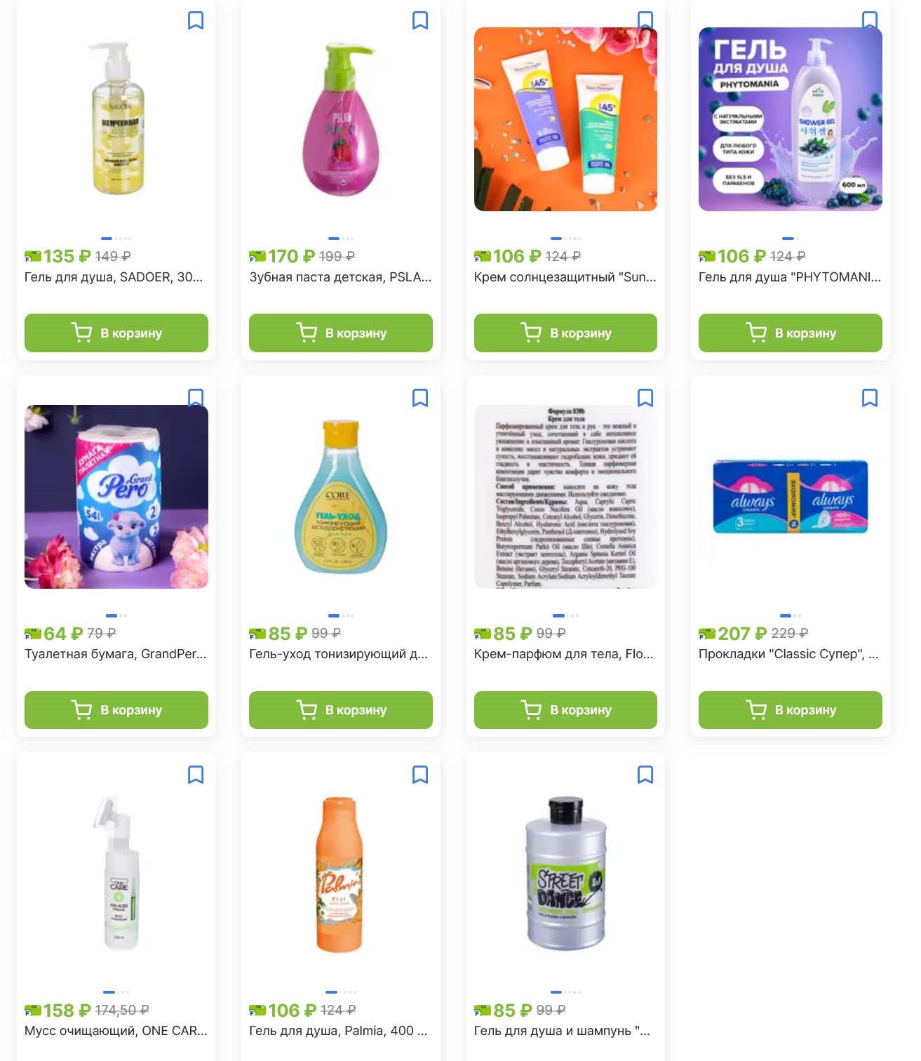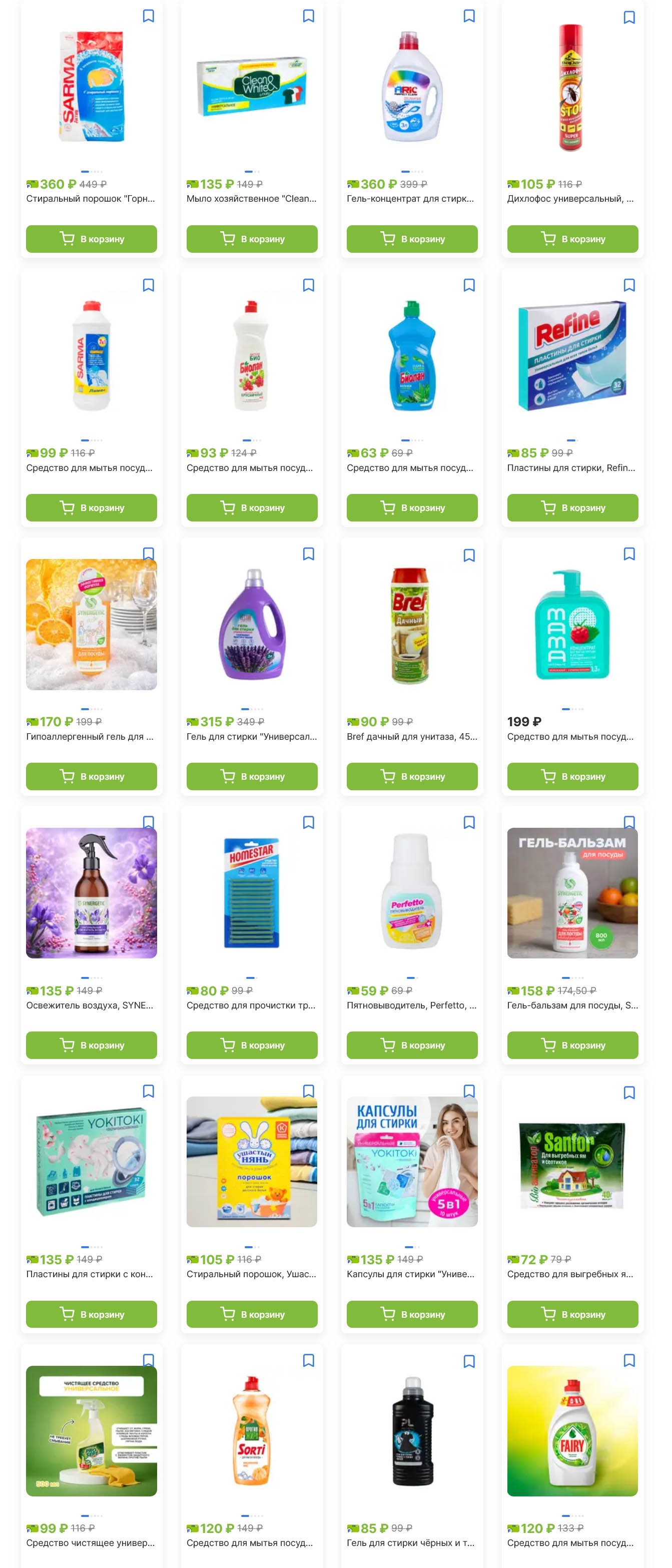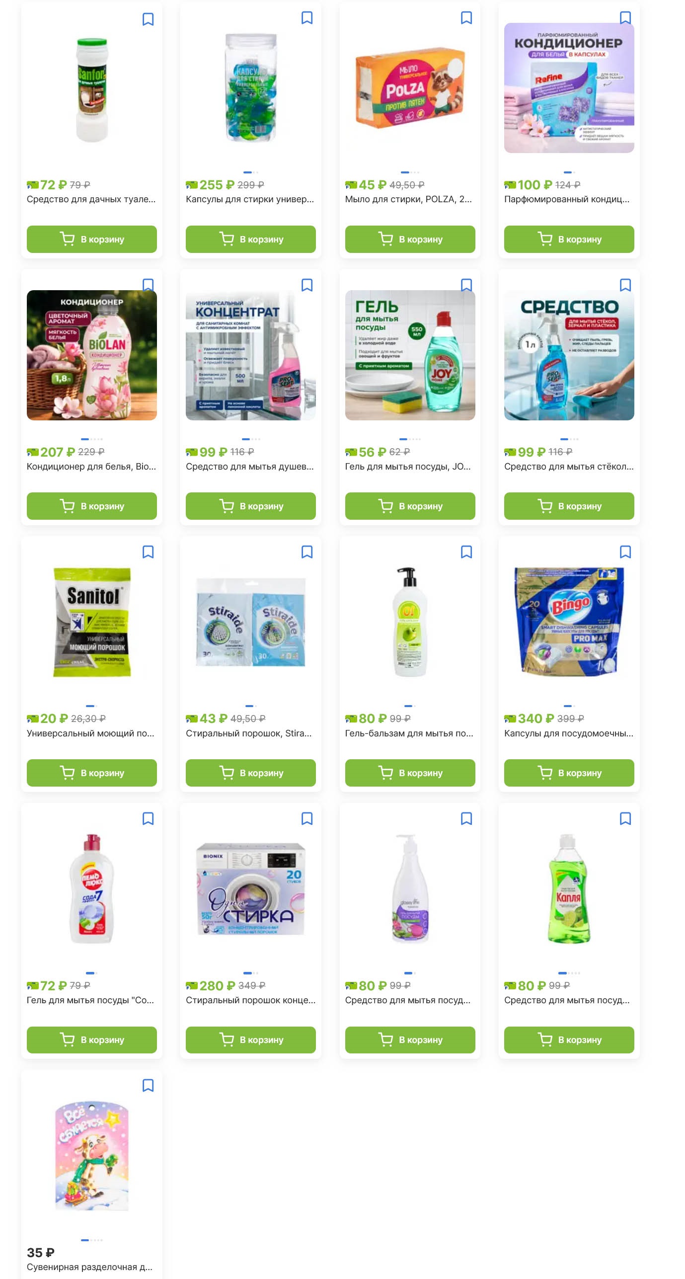 Из бытовой химии: стиральный порошок детский (425 ₽ вместо 499 ₽), кондиционер «Ушастый нянь» (297 ₽ вместо 349 ₽), гель для стирки универсальный (315 ₽ вместо 349 ₽), гипоаллергенный гель Refine (170 ₽ вместо 199 ₽), капсулы SI:LA BOOST (207 ₽ вместо 229 ₽). Средства для мытья посуды: SORTI (120 ₽ вместо 149 ₽), YOKITOKI (99 ₽ вместо 116 ₽), SANTA (99 ₽ вместо 116 ₽). Чистящие средства для стёкол, антижир, универсальные очистители — все со скидкой 10–15%.
