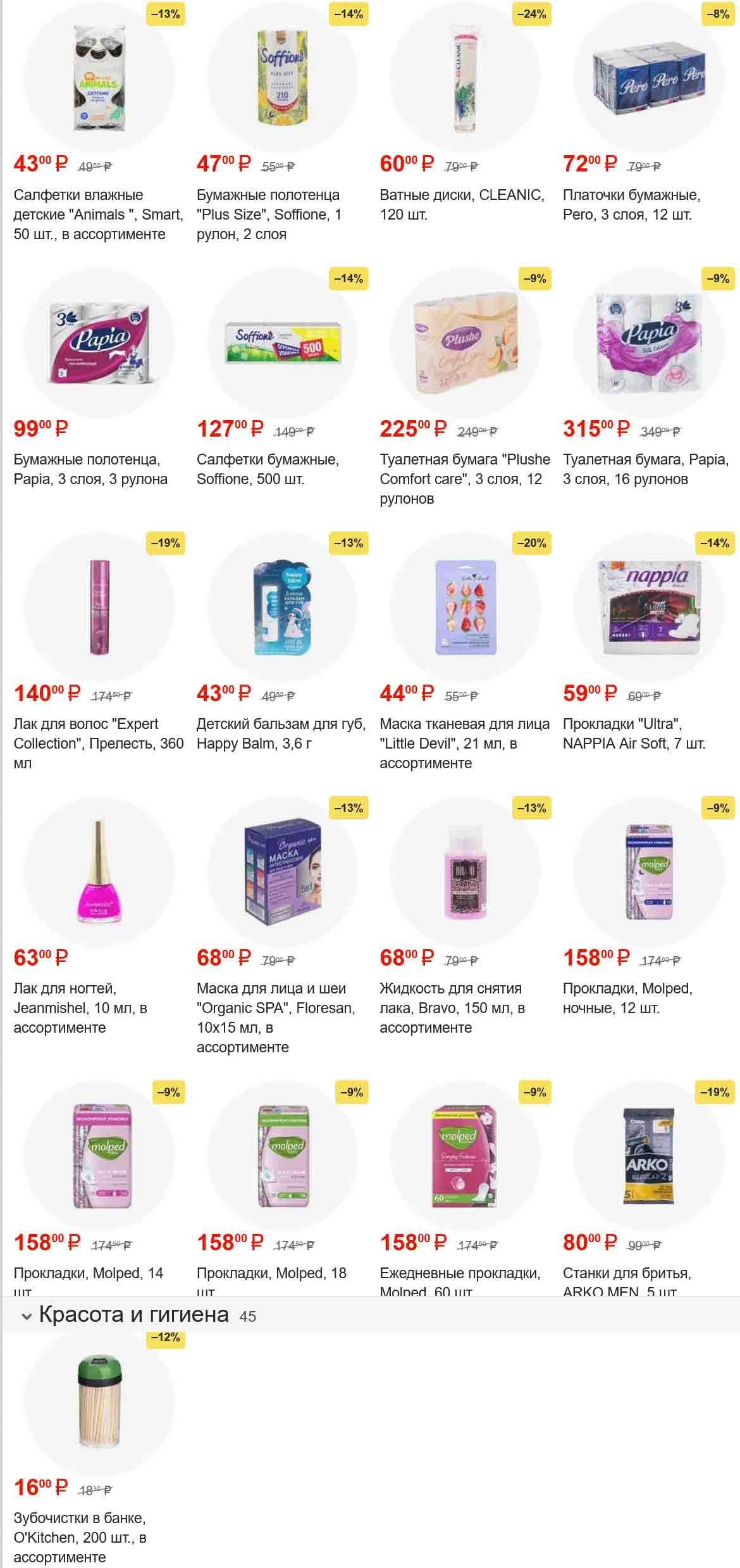 В акционном буклете предложены выгодные цены на различные продукты, такие как влажные полотенца, зубную пасту, ножницы, ручки, кондиционер для белья, толстовок, карандаши, головоломки, игрушки, кукол, наборов игровой мебели и многое другое.