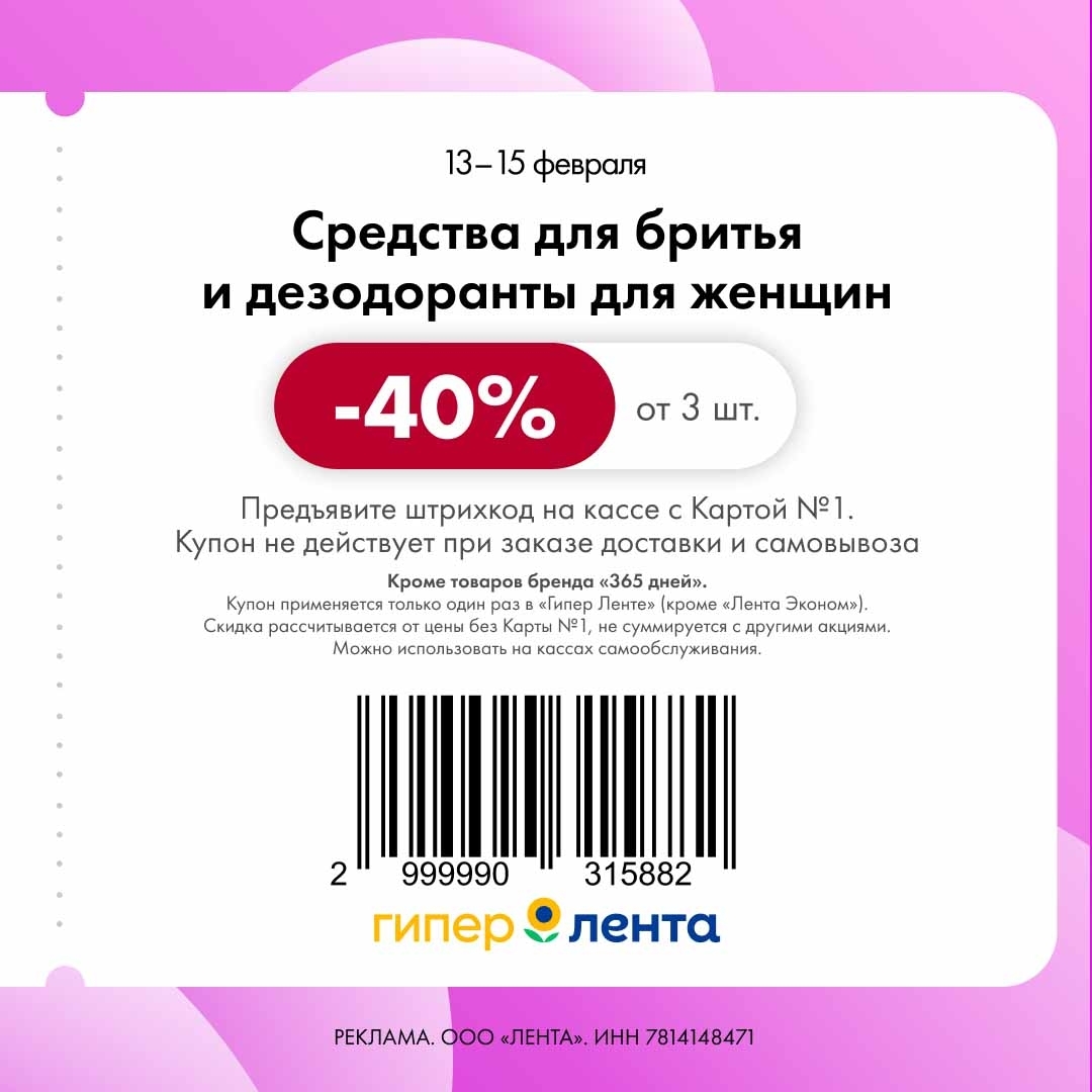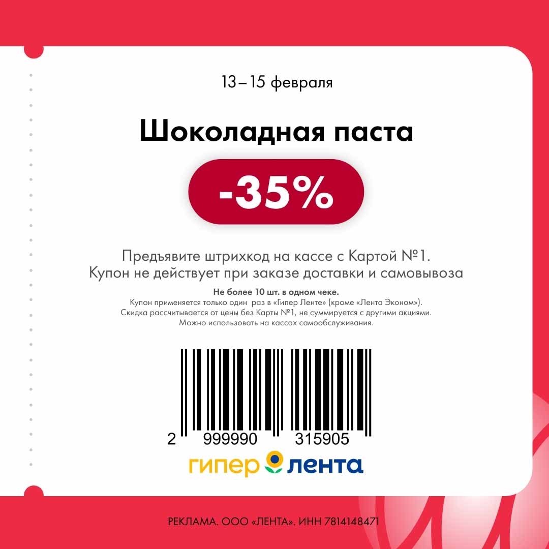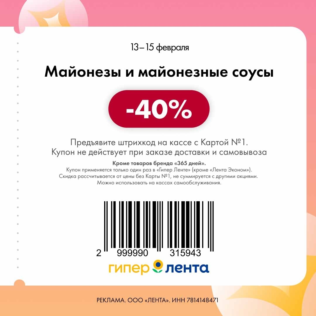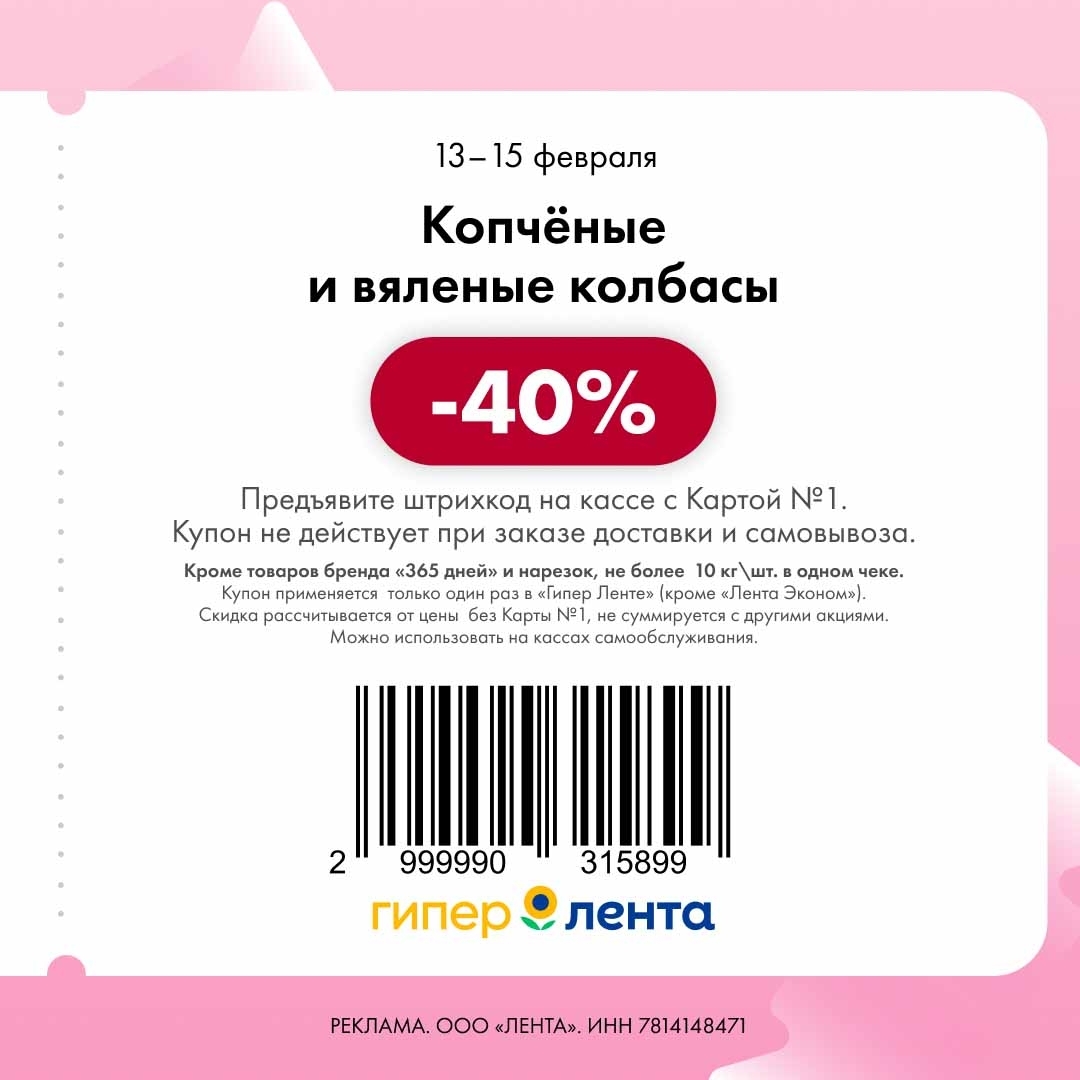 С 13 по 15 февраля 2026 года сеть магазинов «Гипер Лента» предлагает покупателям серию выгодных акций с использованием специальных купонов. Скидки достигают 40%, но действуют только при предъявлении на кассе штрих-кода и «Карты №1».