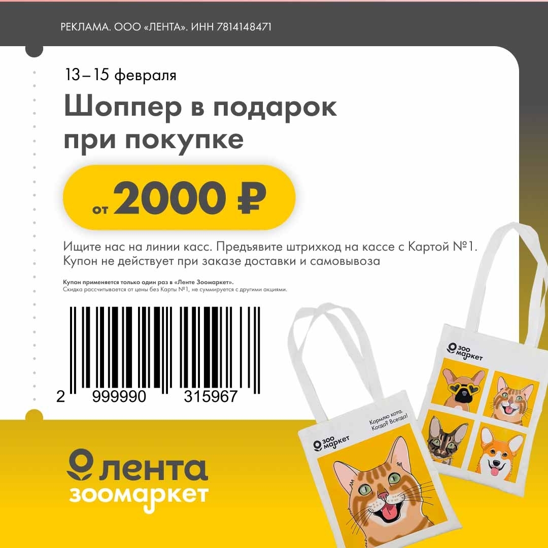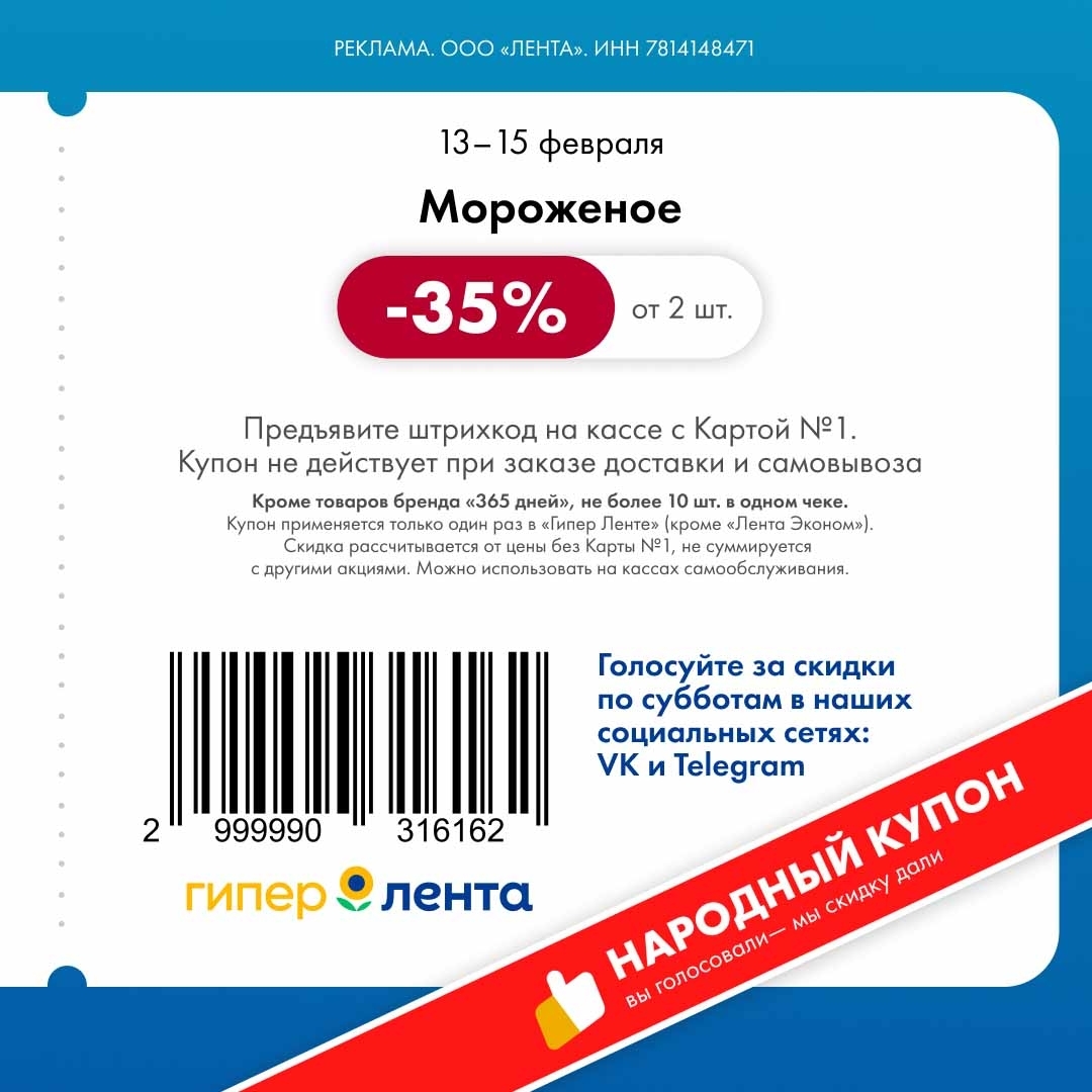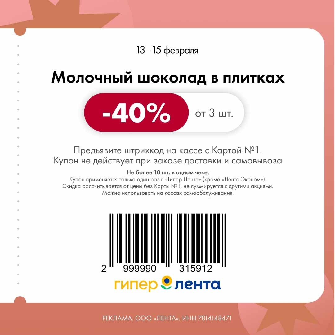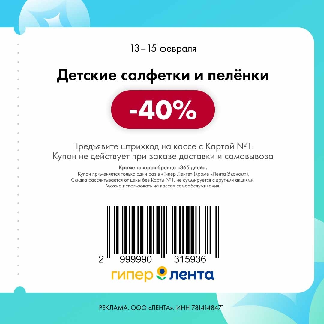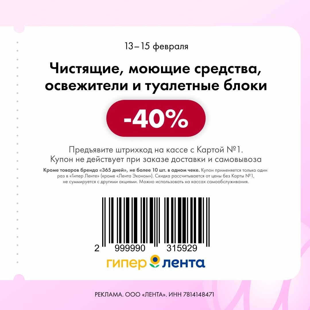 С 13 по 15 февраля 2026 года сеть магазинов «Гипер Лента» предлагает покупателям серию выгодных акций с использованием специальных купонов. Скидки достигают 40%, но действуют только при предъявлении на кассе штрих-кода и «Карты №1».