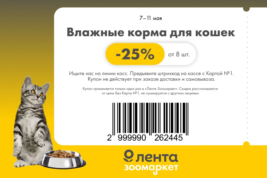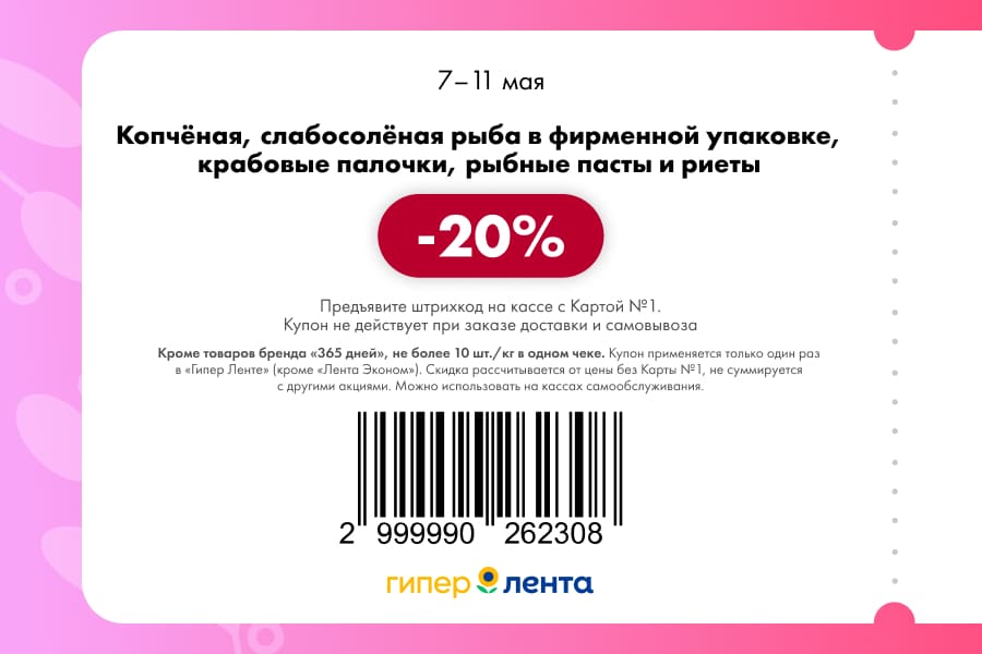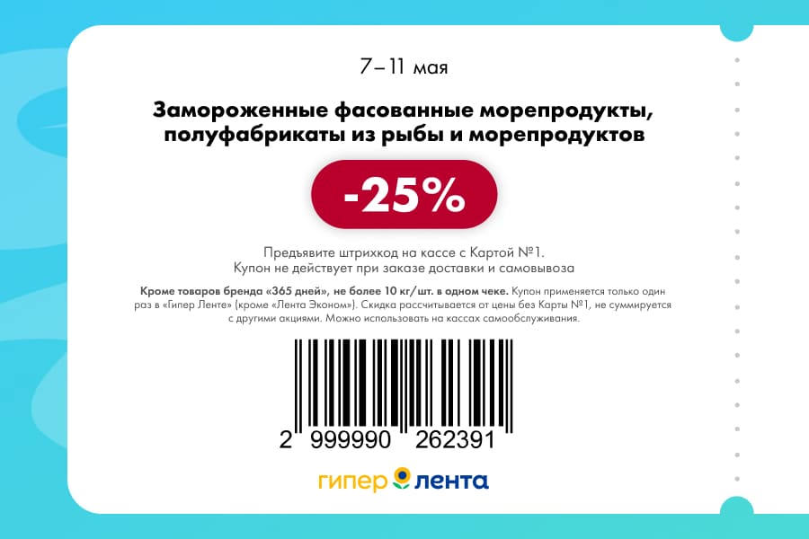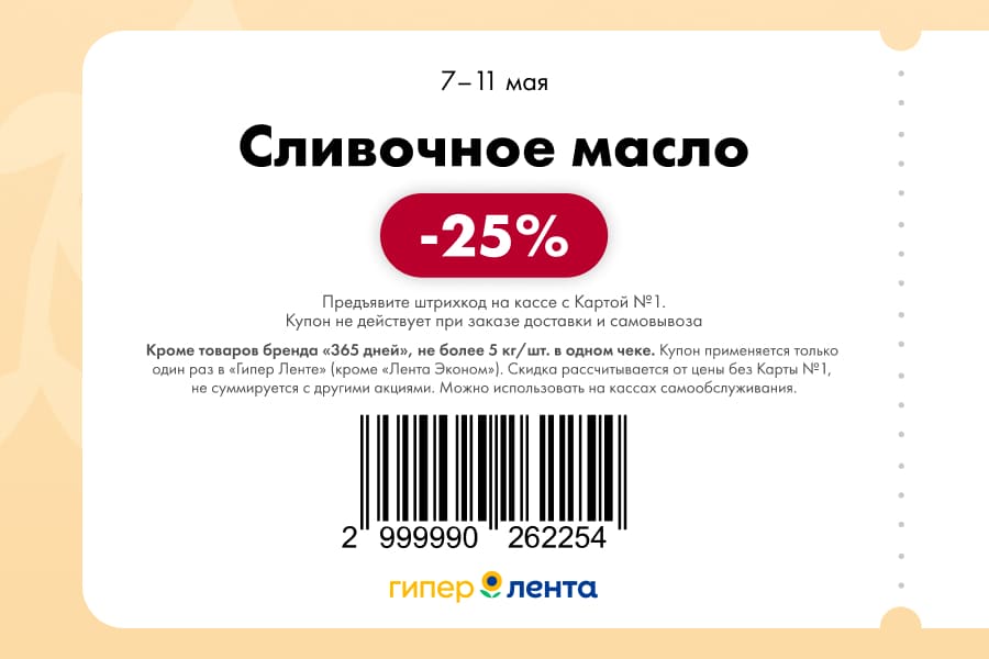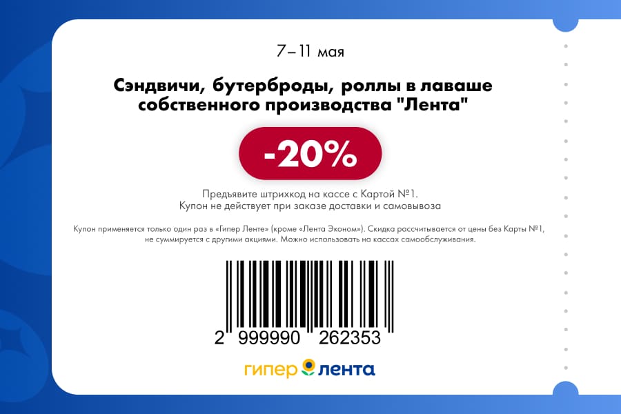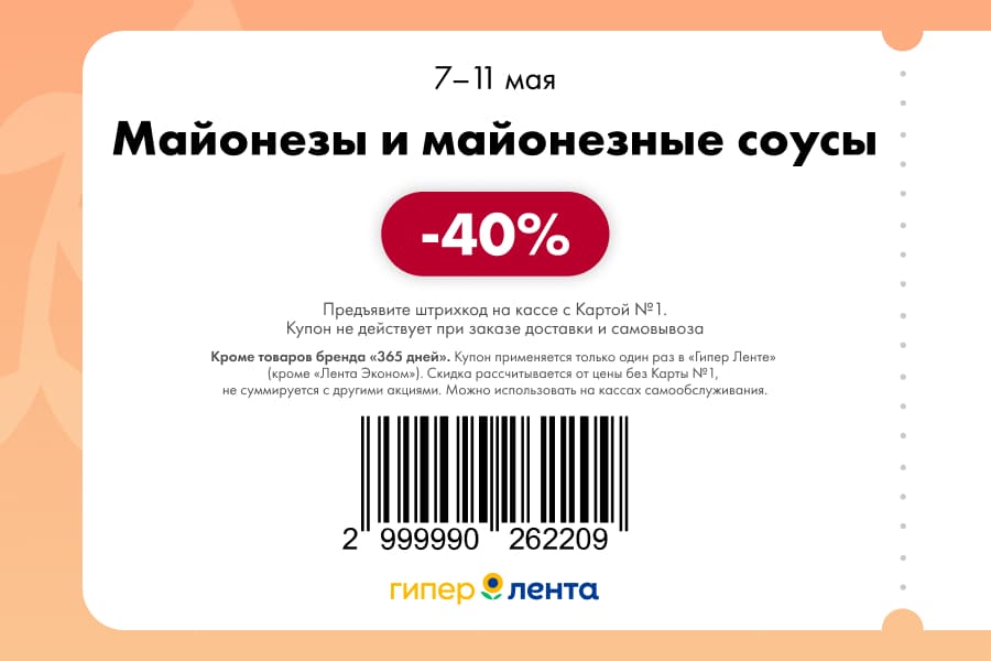 С 7 по 11 мая 2025 года сеть магазинов «Гипер Лента» предлагает покупателям серию выгодных акций с использованием специальных купонов. Скидки достигают 40%, но действуют только при предъявлении на кассе штрих-кода и «Карты №1».