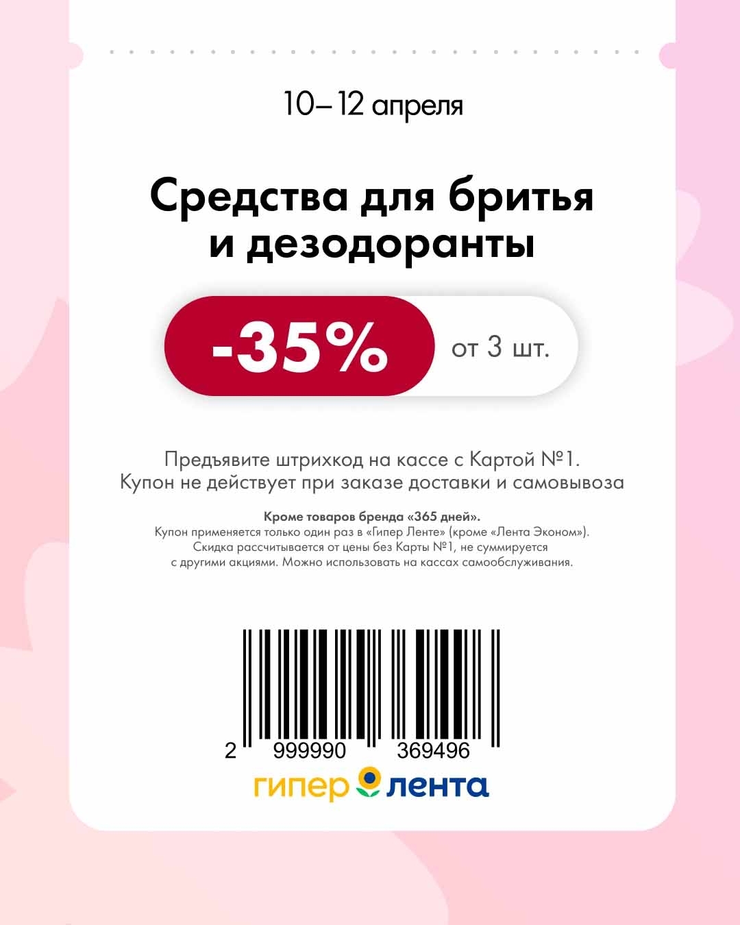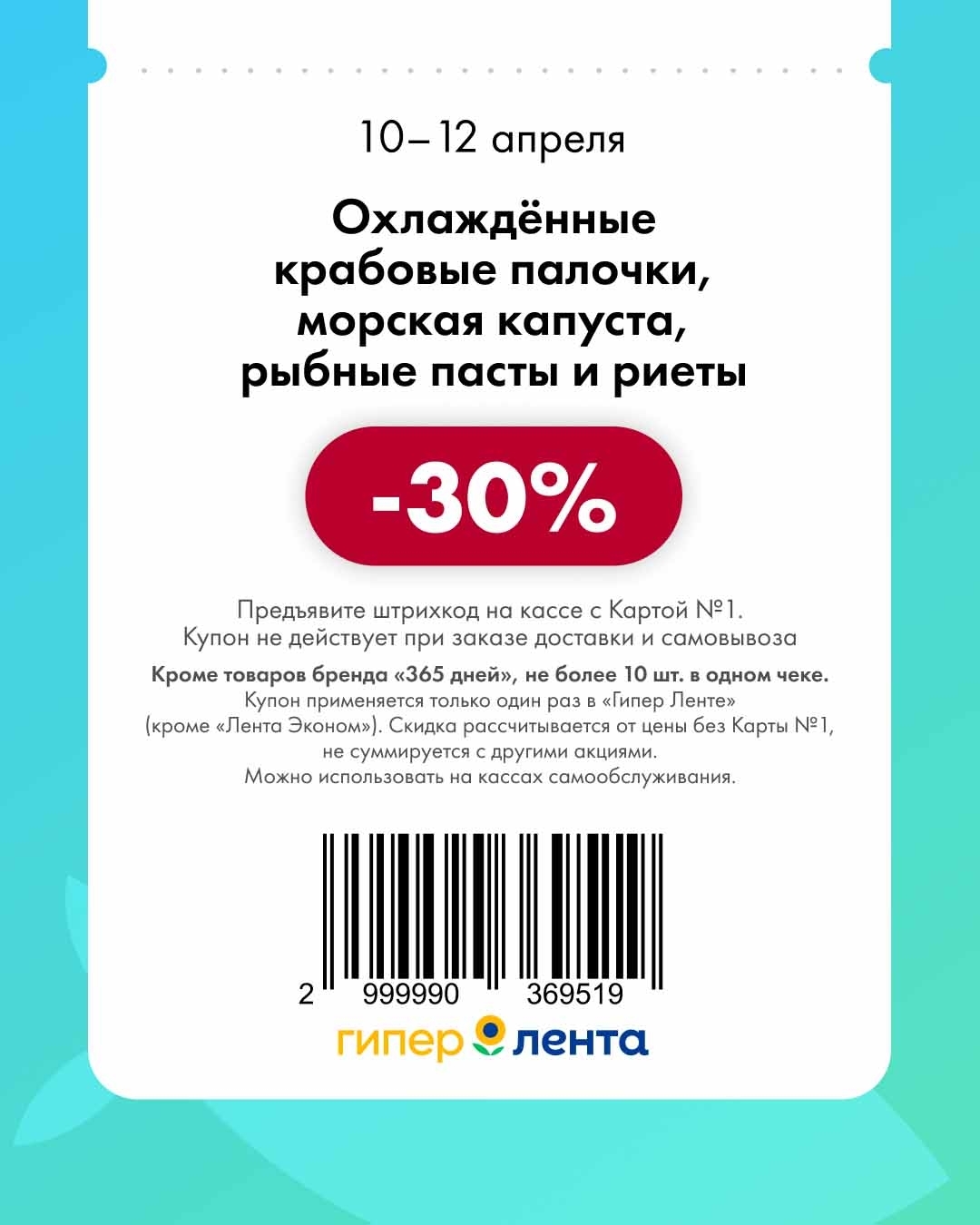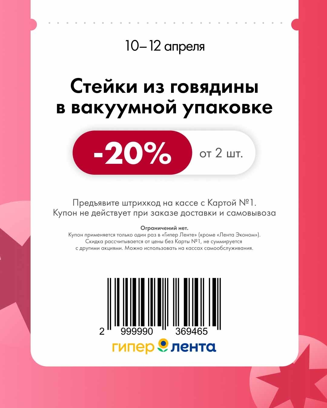 - Купон применяется один раз, действует только в гипермаркетах «Лента» (кроме «Лента Эконом»).