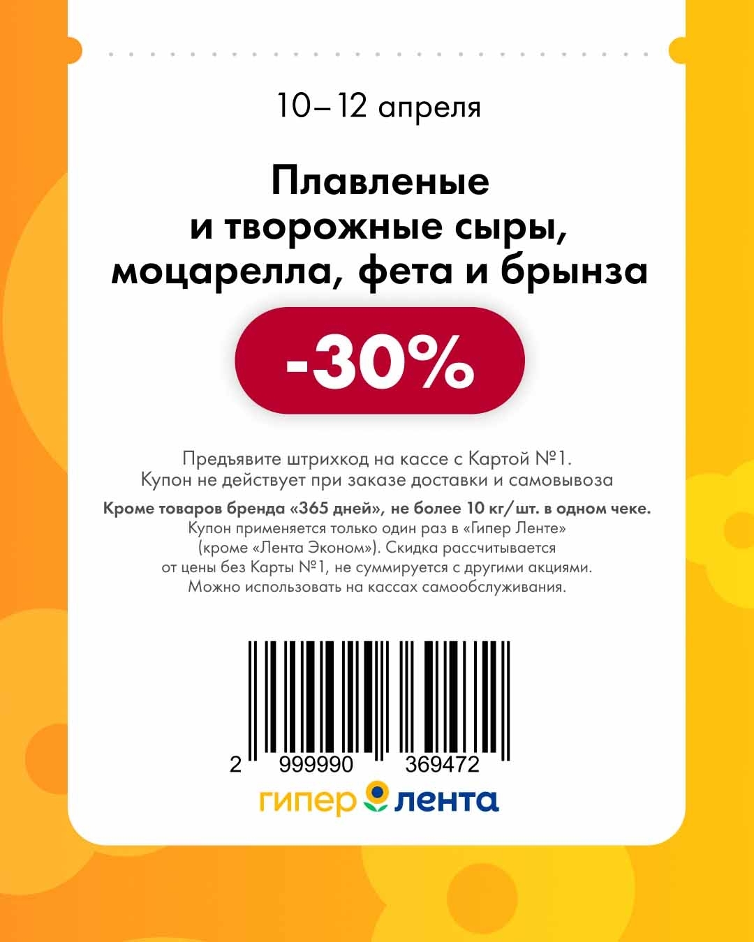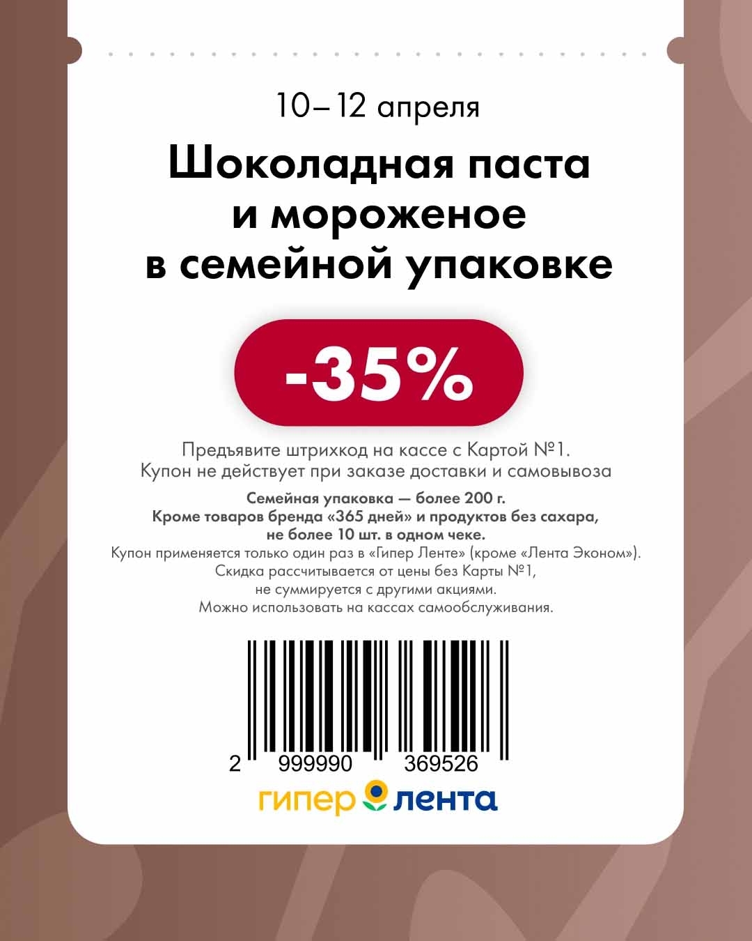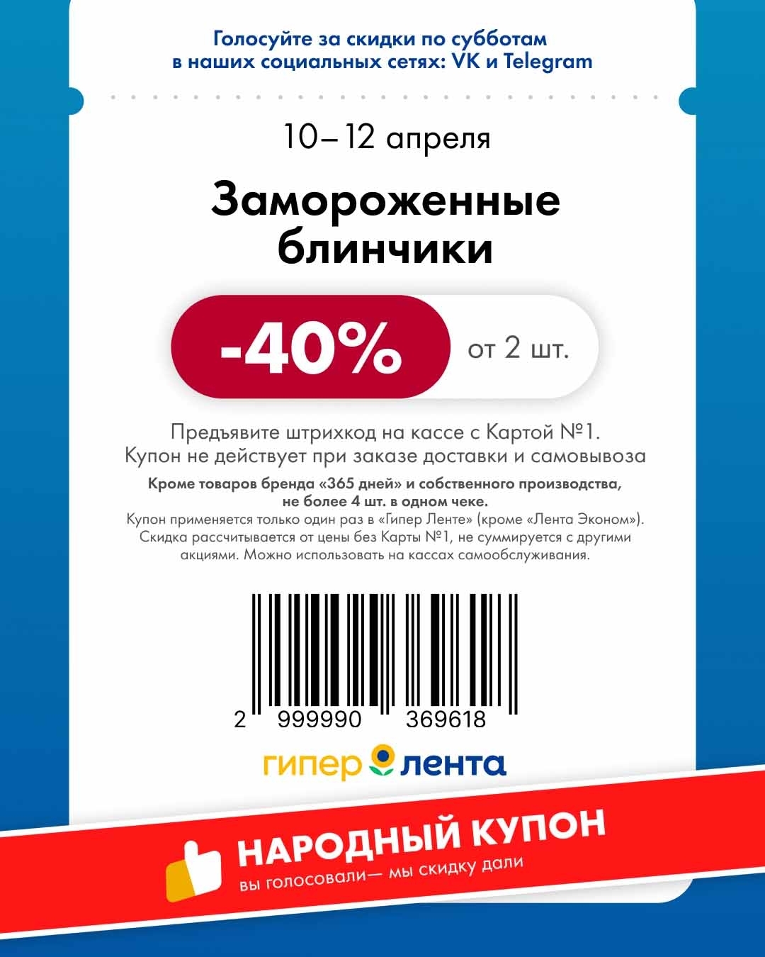 - Купон применяется один раз, действует только в гипермаркетах «Лента» (кроме «Лента Эконом»).