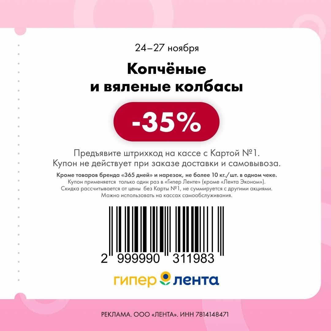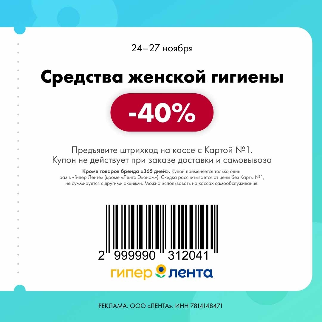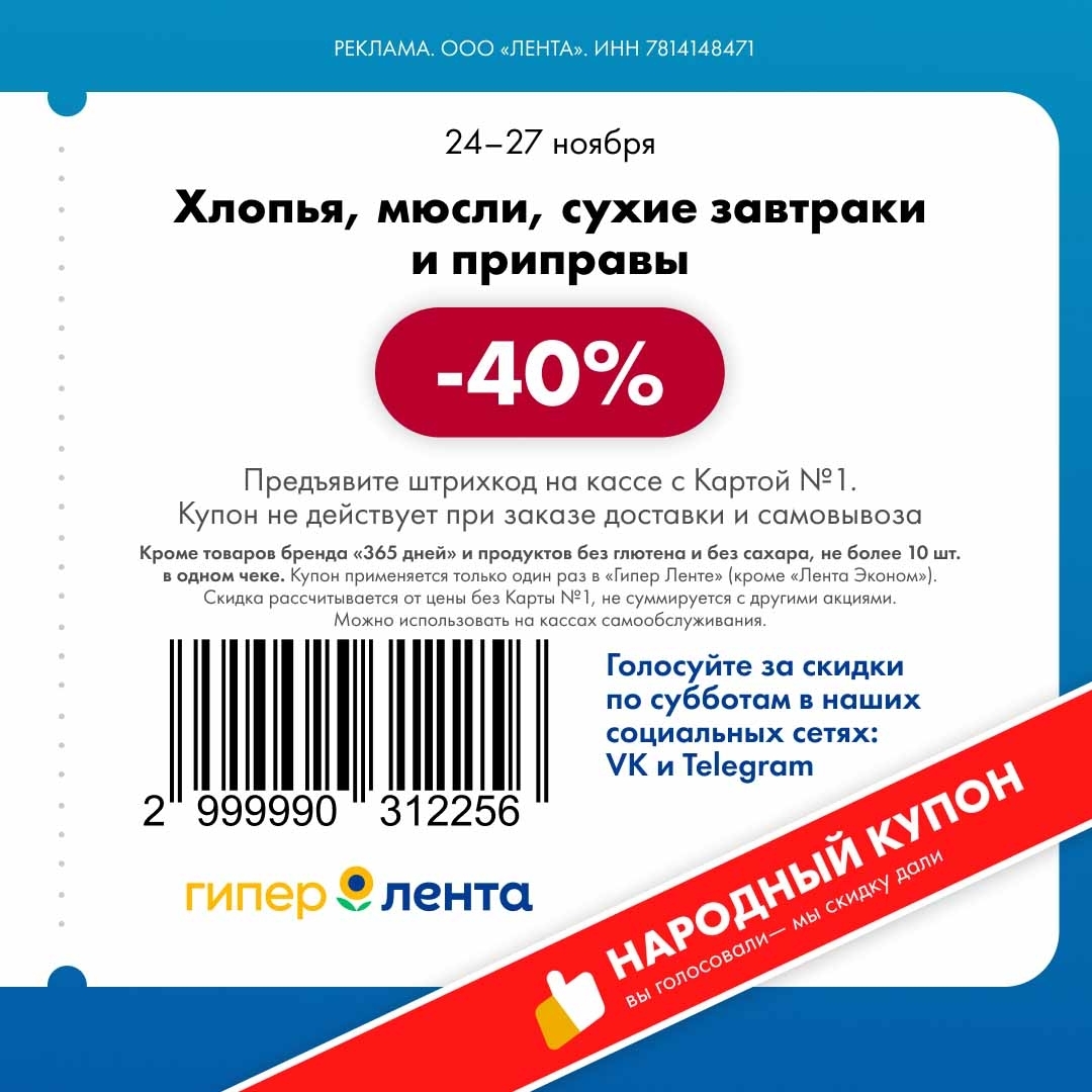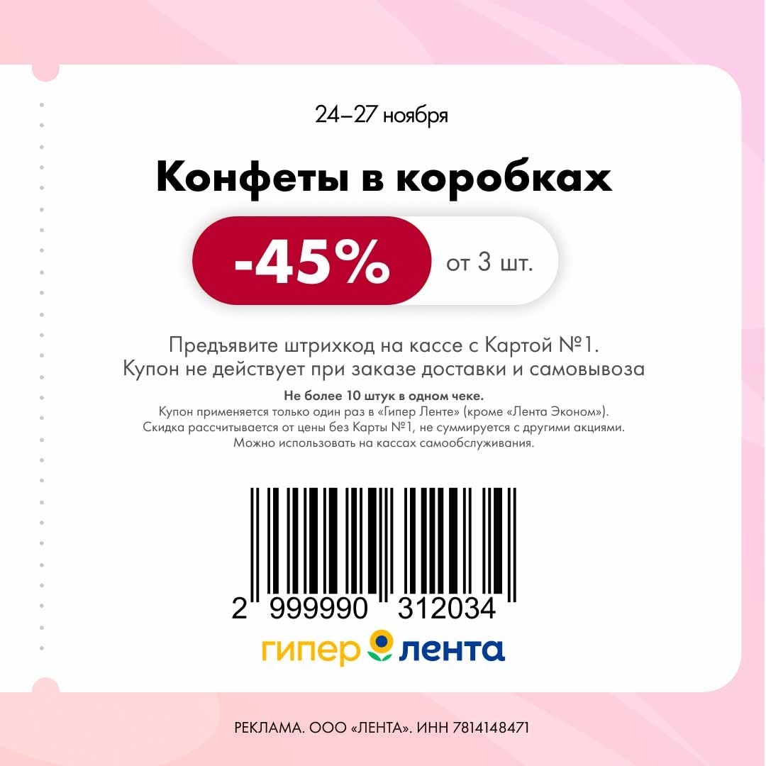 С 24 по 27 ноября 2025 года сеть магазинов «Гипер Лента» предлагает покупателям серию выгодных акций с использованием специальных купонов. Скидки достигают 45%, но действуют только при предъявлении на кассе штрих-кода и «Карты №1».