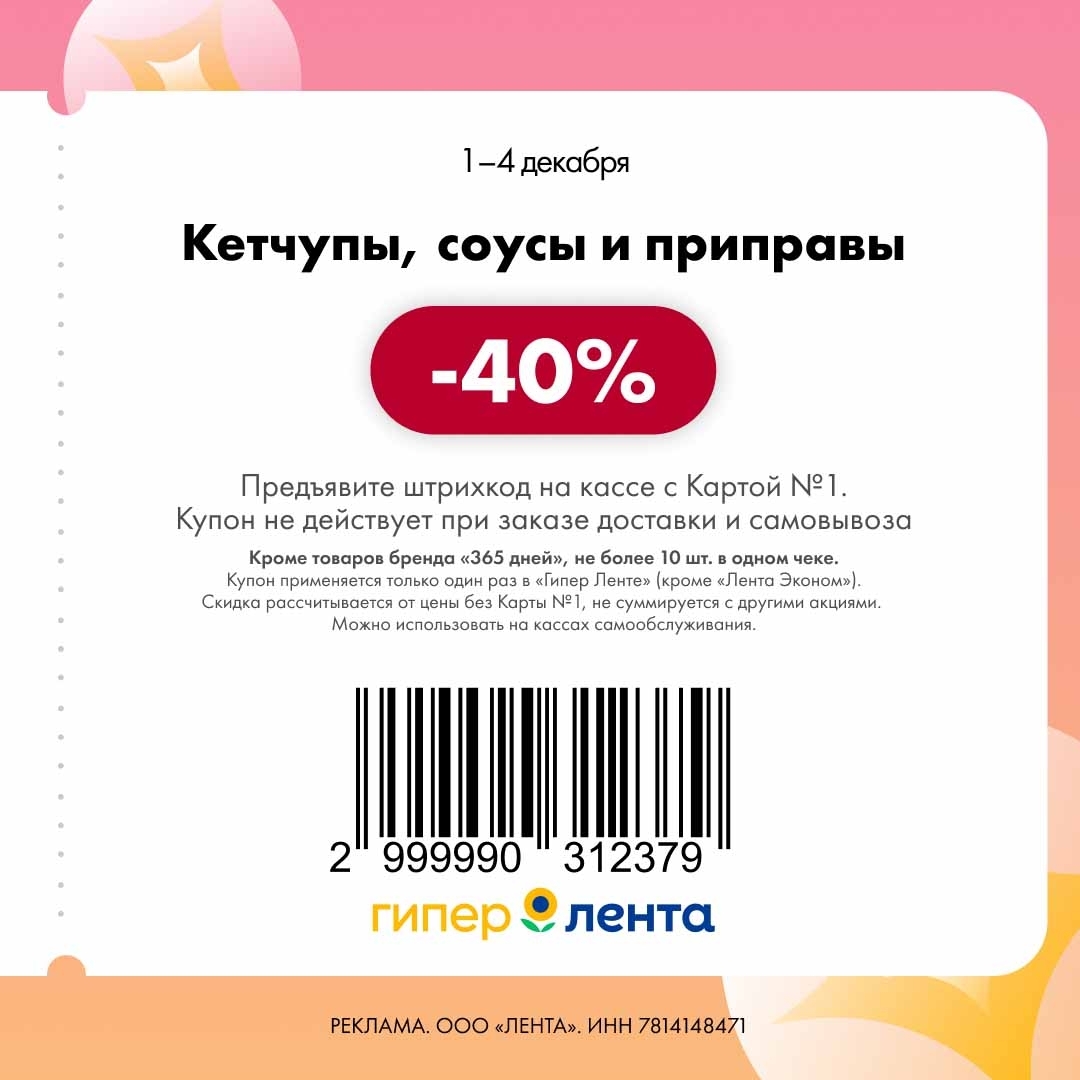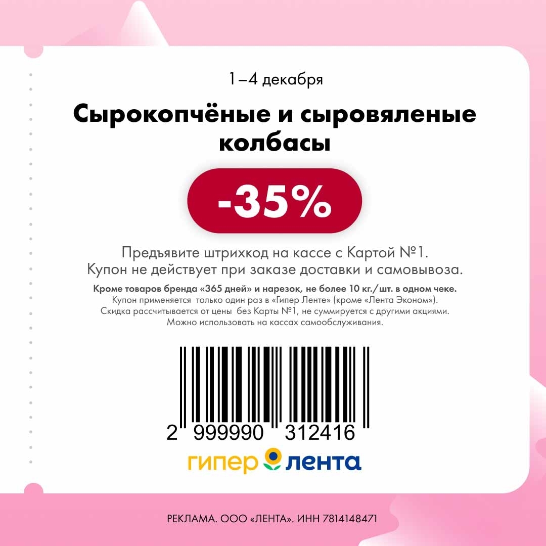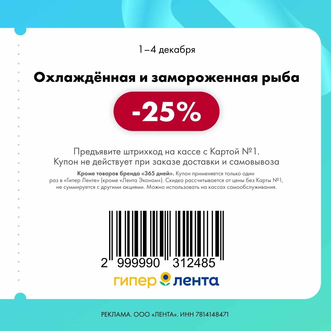 С 1 по 4 декабря 2025 года сеть магазинов «Гипер Лента» предлагает покупателям серию выгодных акций с использованием специальных купонов. Скидки достигают 50%, но действуют только при предъявлении на кассе штрих-кода и «Карты №1».