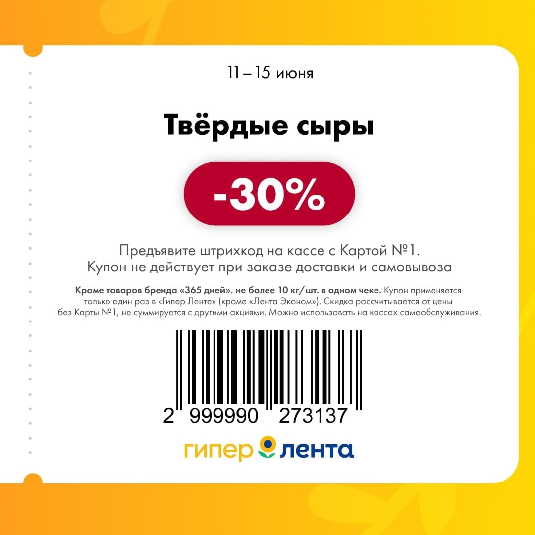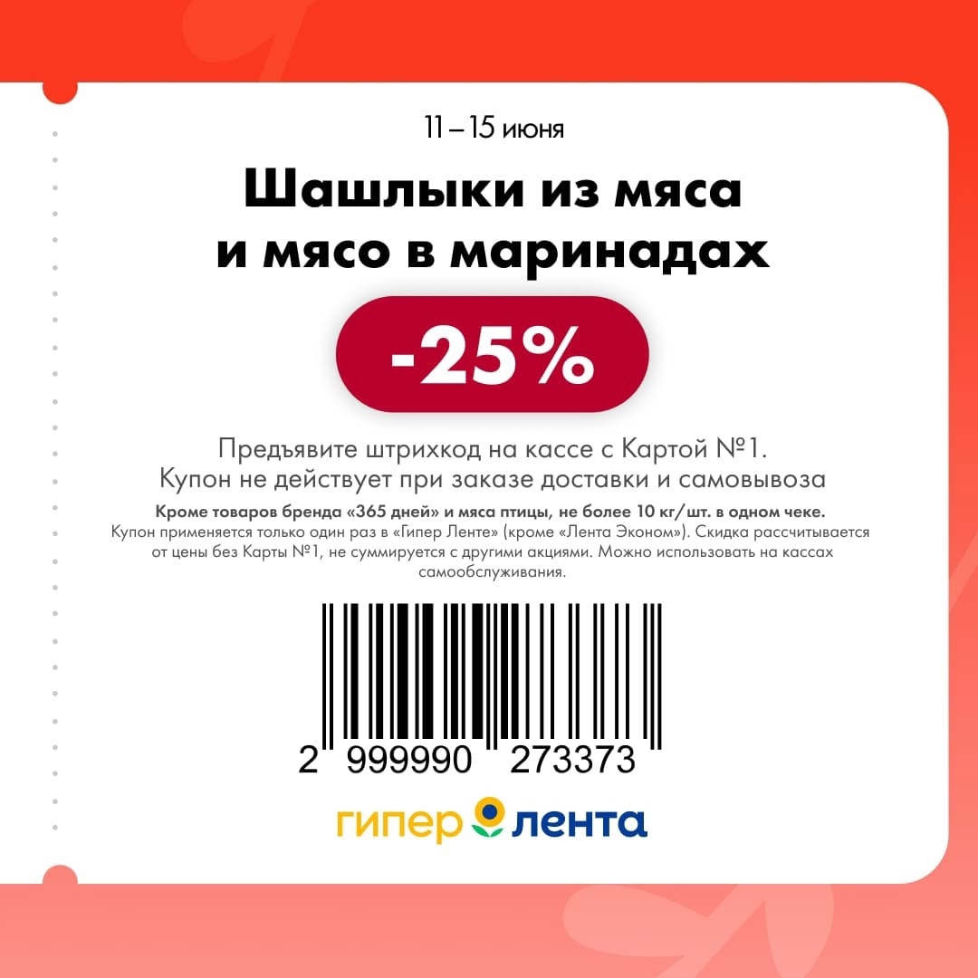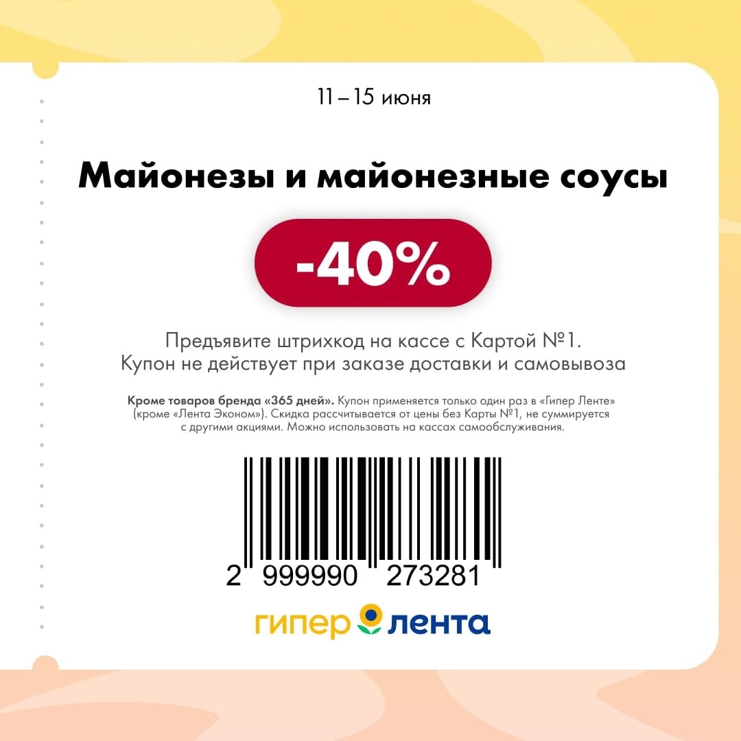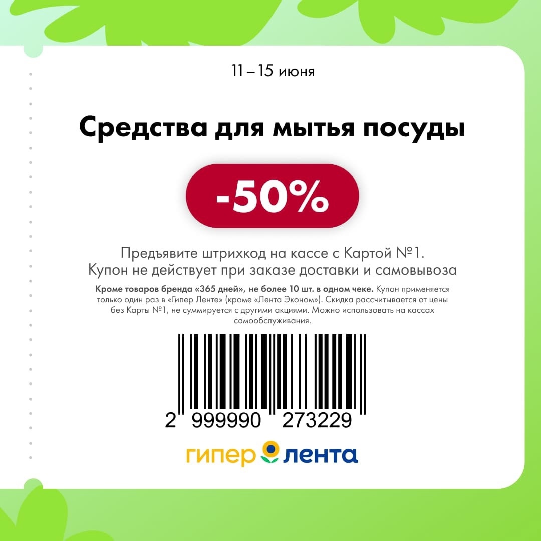 С 11 по 17 июня 2025 года сеть магазинов «Гипер Лента» предлагает покупателям серию выгодных акций с использованием специальных купонов. Скидки достигают 50%, но действуют только при предъявлении на кассе штрих-кода и «Карты №1».