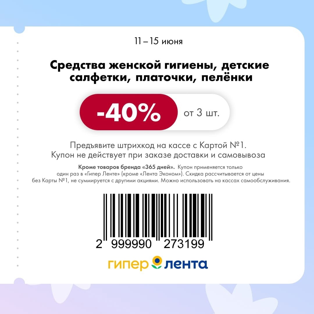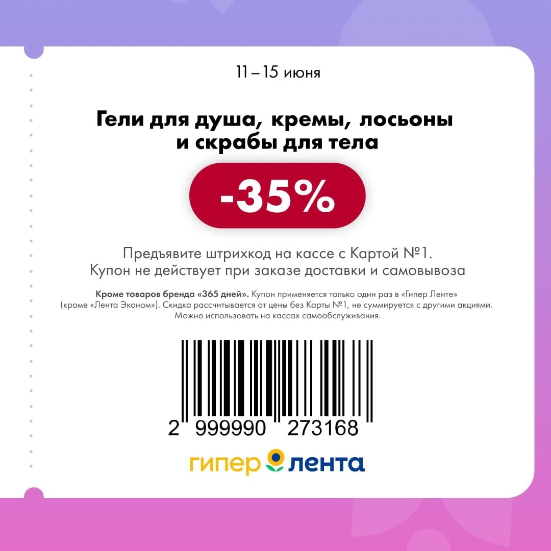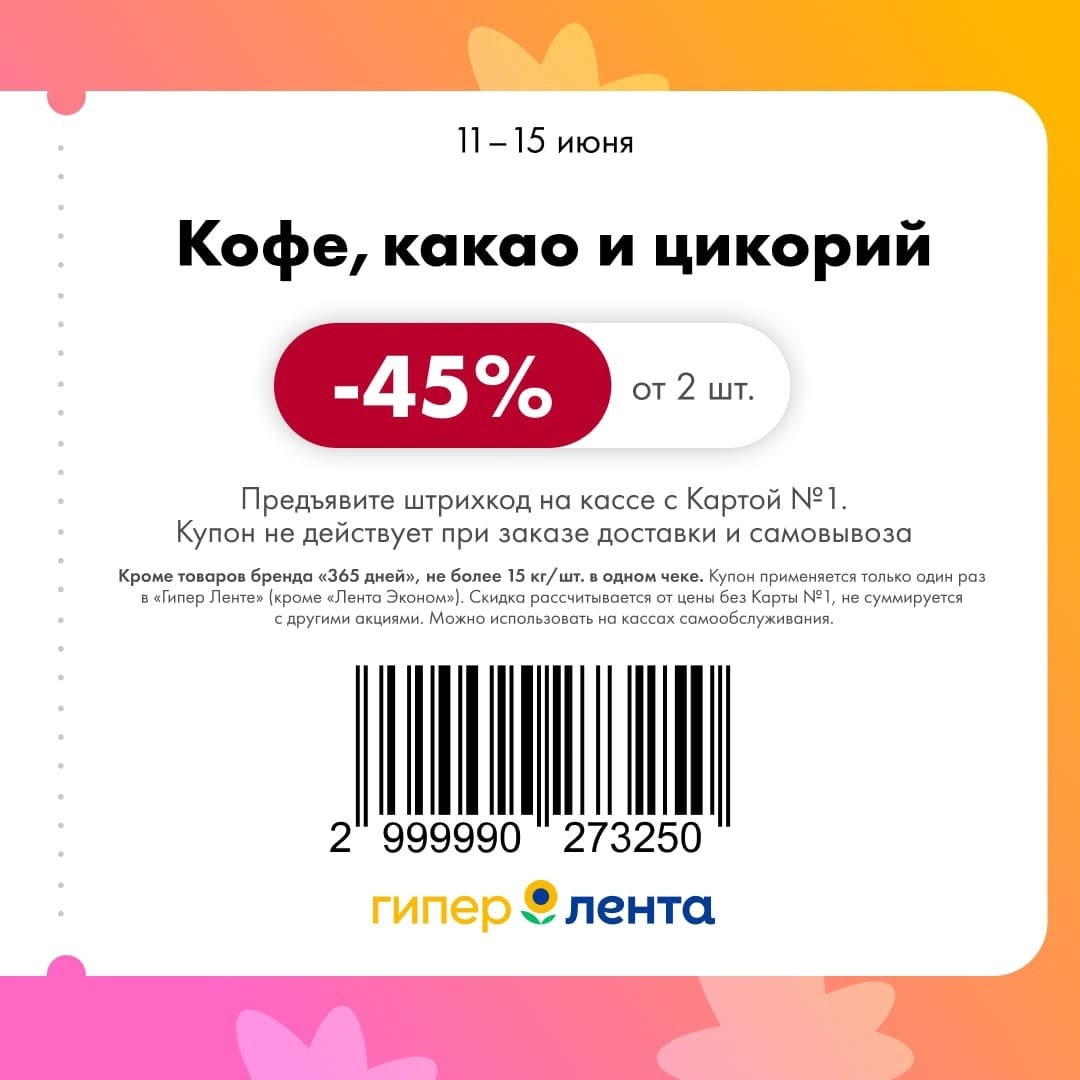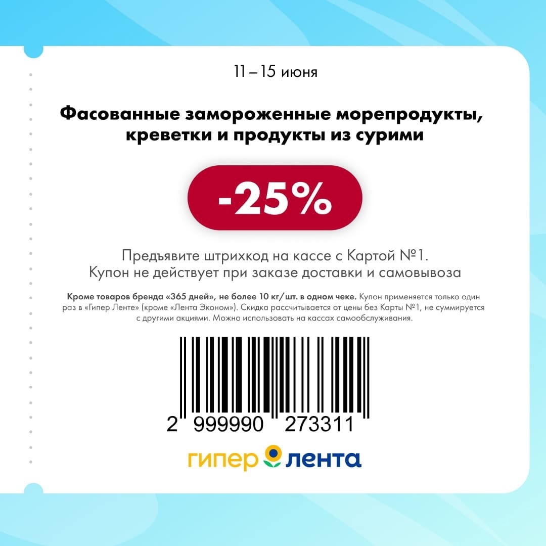 С 11 по 17 июня 2025 года сеть магазинов «Гипер Лента» предлагает покупателям серию выгодных акций с использованием специальных купонов. Скидки достигают 50%, но действуют только при предъявлении на кассе штрих-кода и «Карты №1».