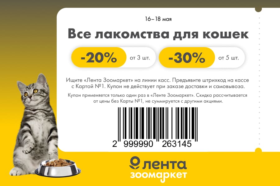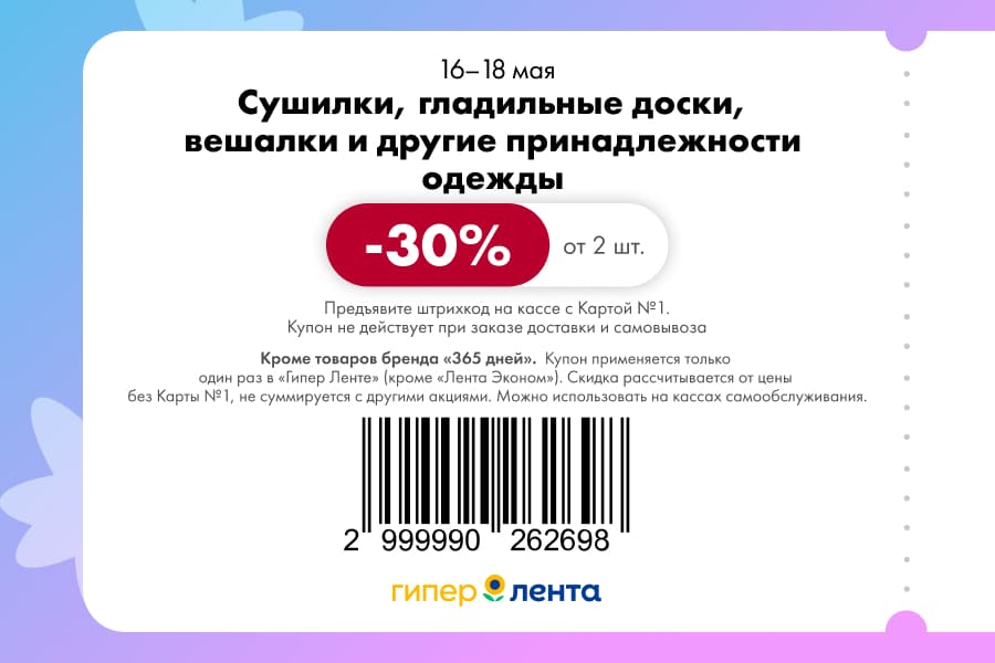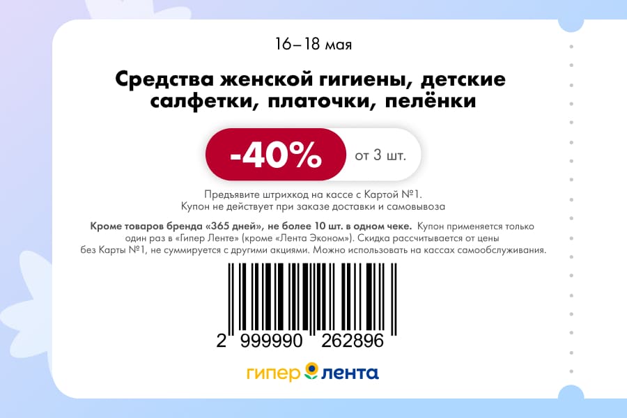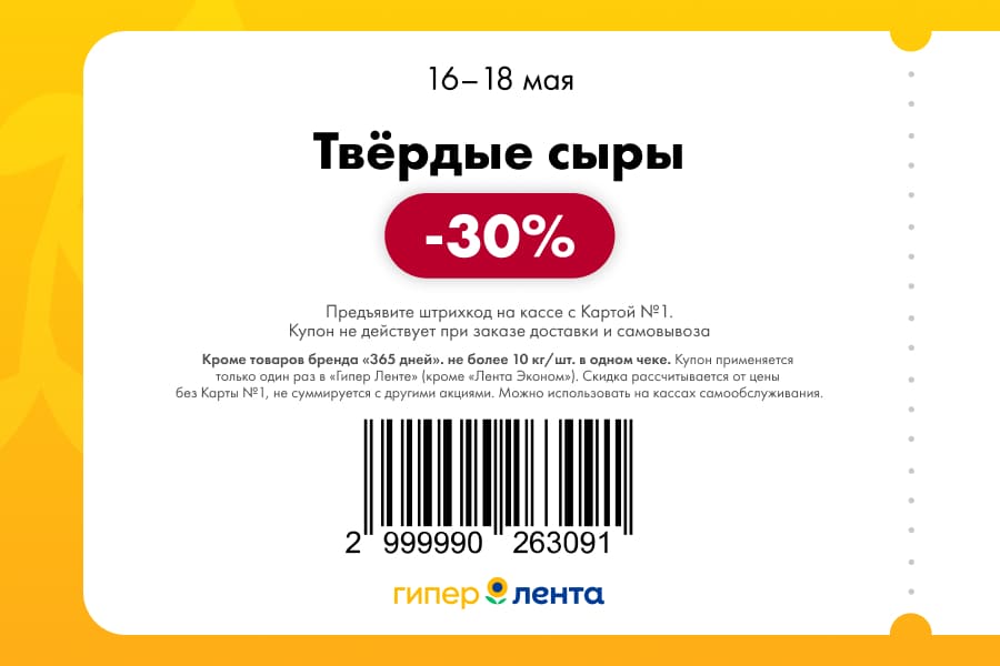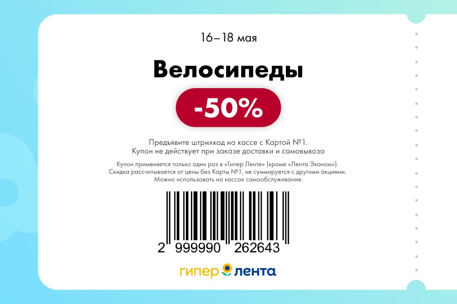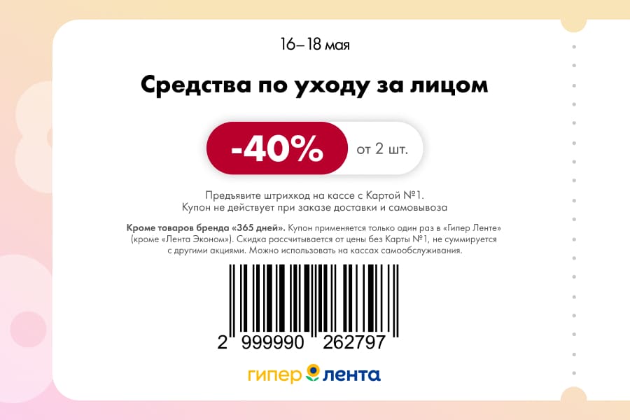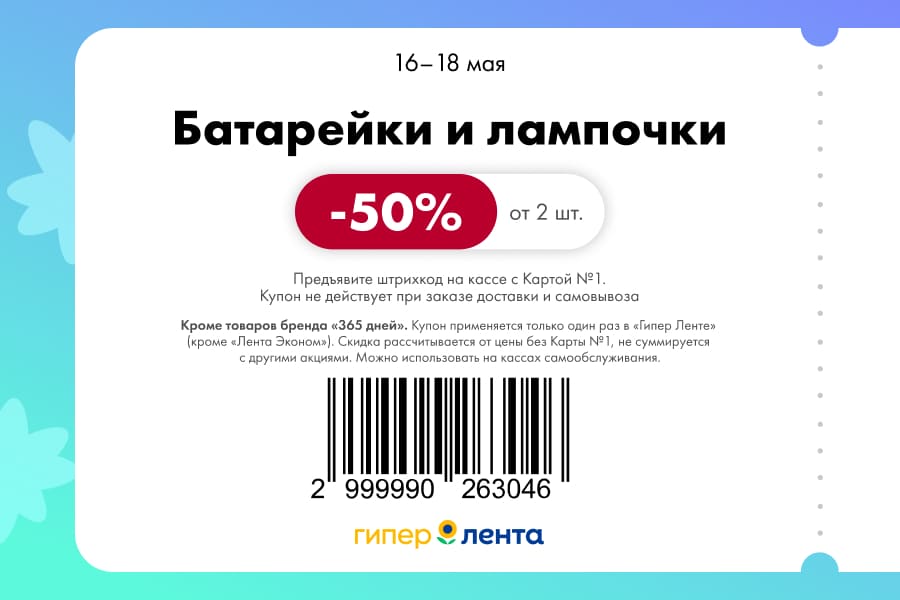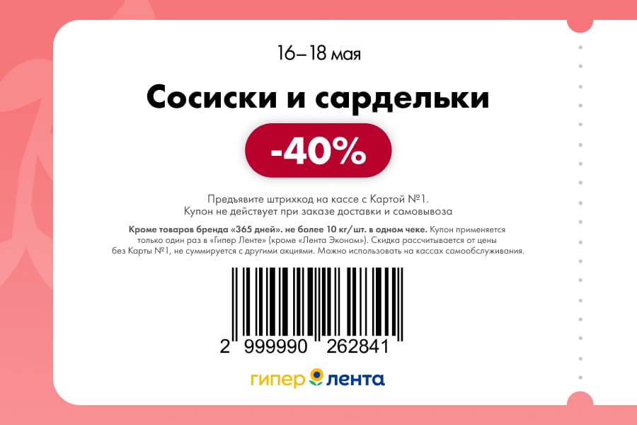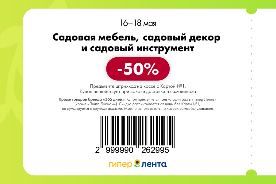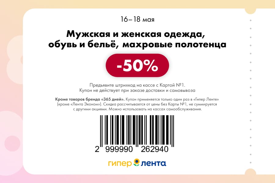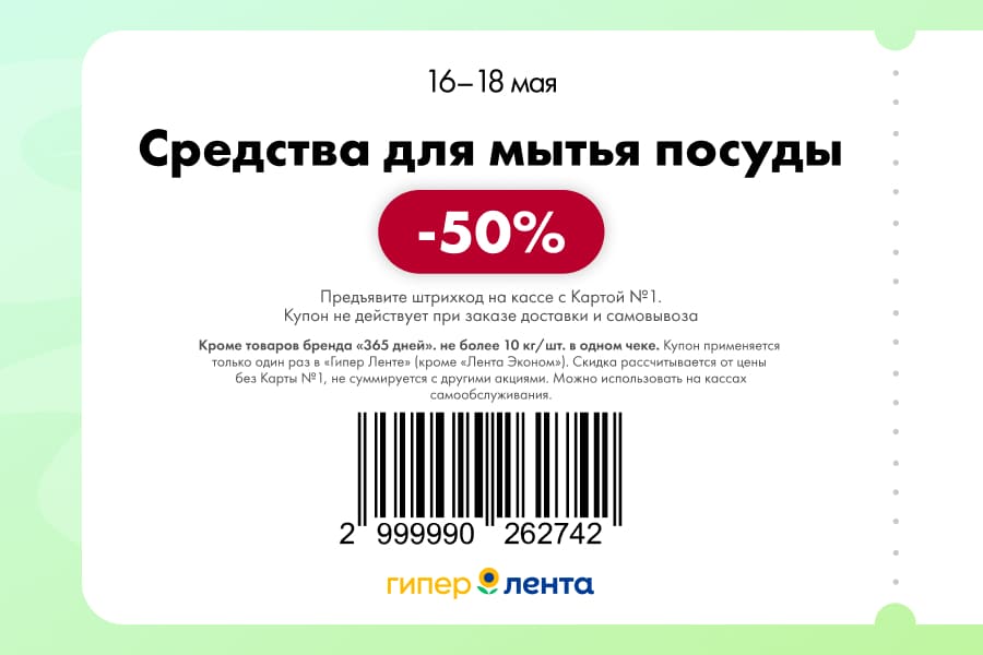 С 16 по 18 мая 2025 года сеть магазинов «Гипер Лента» предлагает покупателям серию выгодных акций с использованием специальных купонов. Скидки достигают 50%, но действуют только при предъявлении на кассе штрих-кода и «Карты №1».