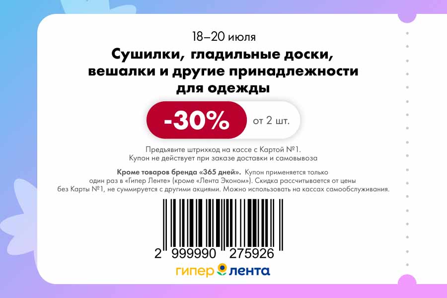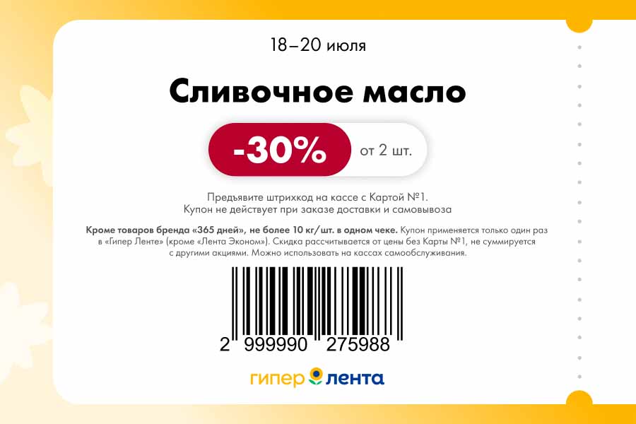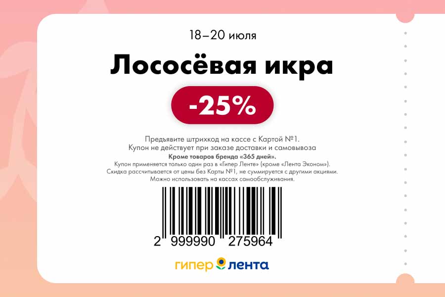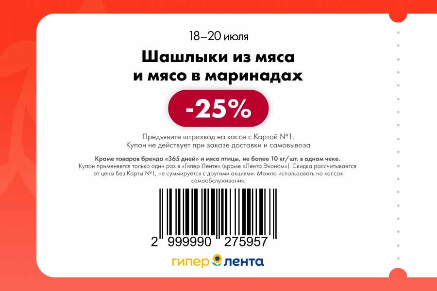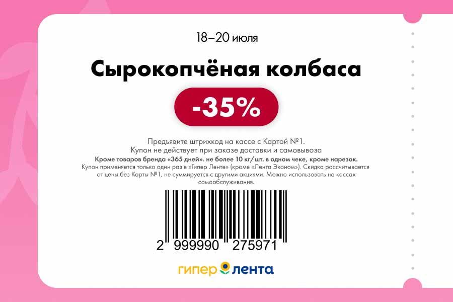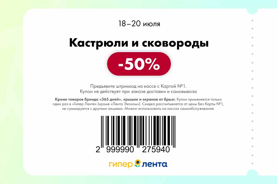С 18 по 20 июля 2025 года сеть магазинов «Гипер Лента» предлагает покупателям серию выгодных акций с использованием специальных купонов. Скидки достигают 50%, но действуют только при предъявлении на кассе штрих-кода и «Карты №1».
