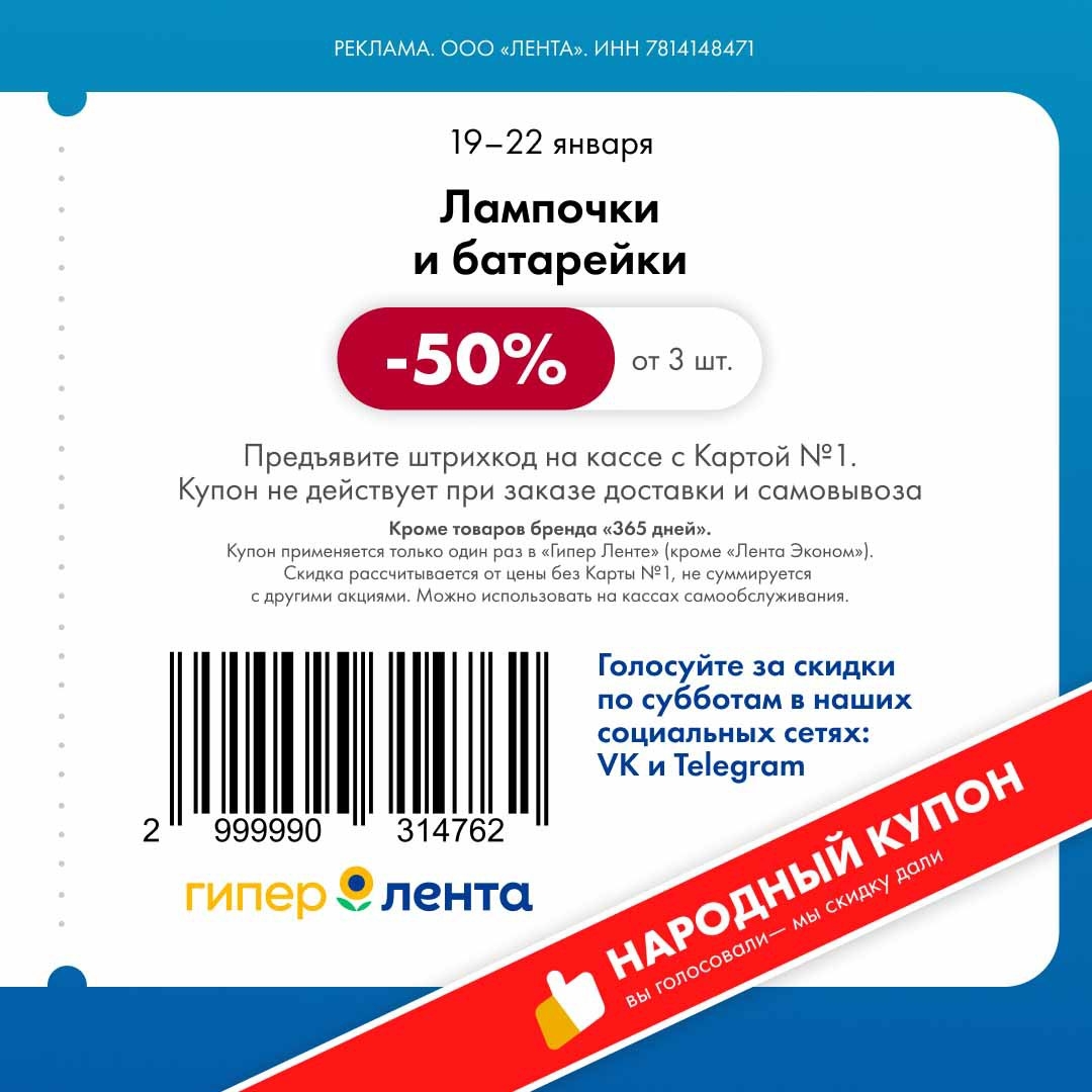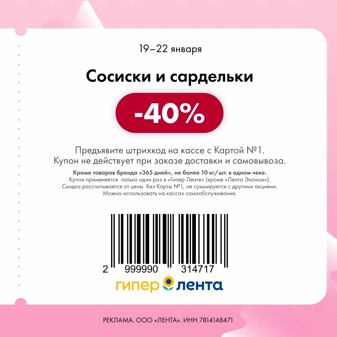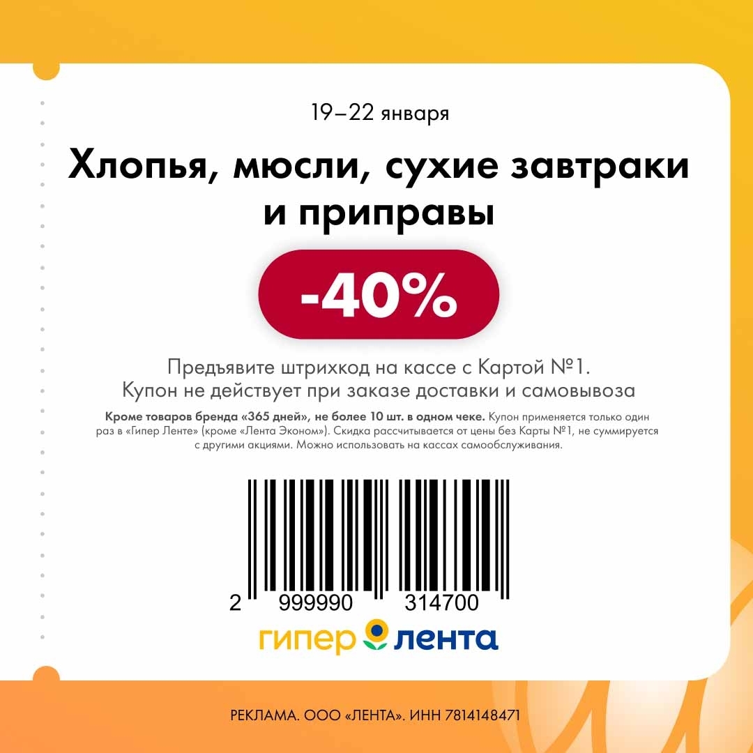 С 19 по 22 января 2026 года сеть магазинов «Гипер Лента» предлагает покупателям серию выгодных акций с использованием специальных купонов. Скидки достигают 50%, но действуют только при предъявлении на кассе штрих-кода и «Карты №1».