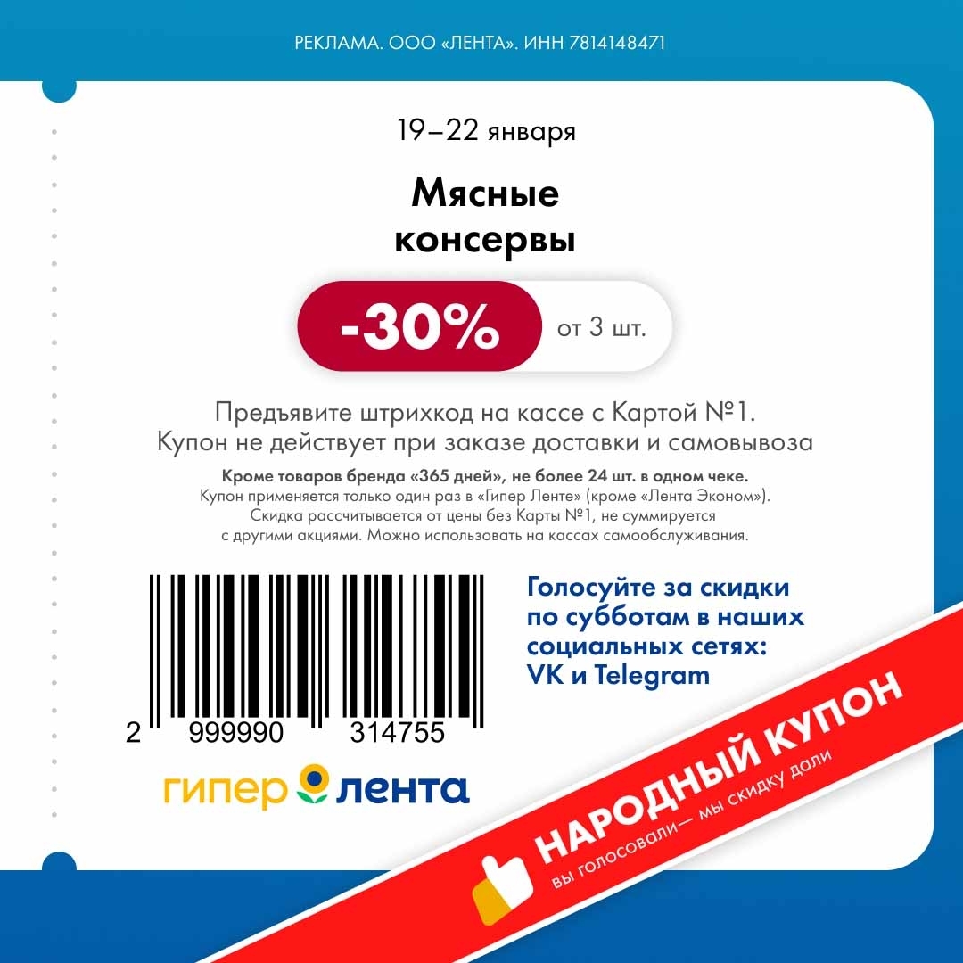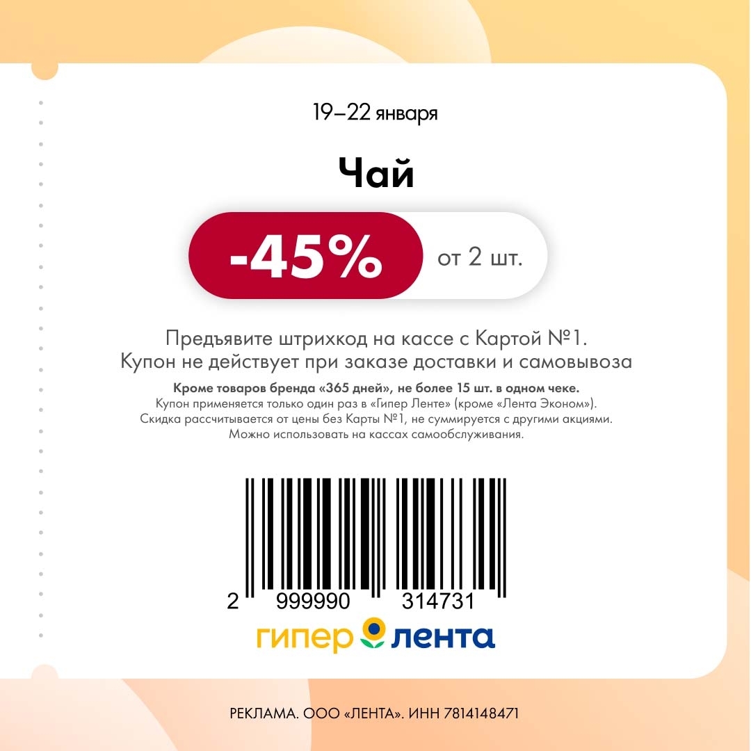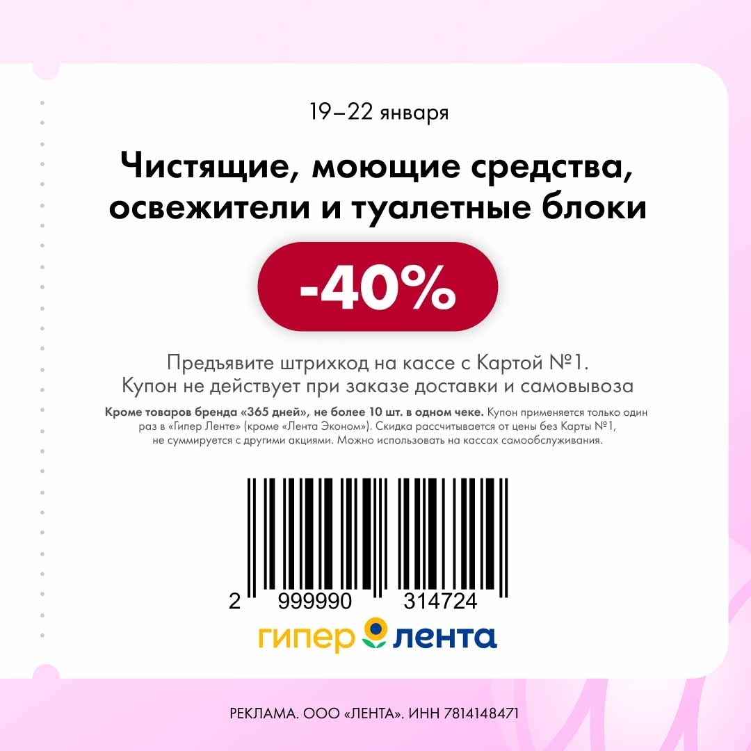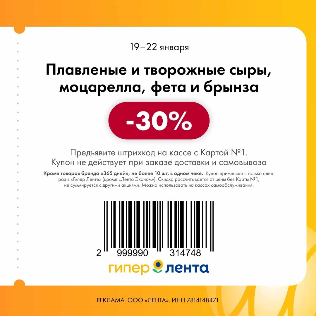 С 19 по 22 января 2026 года сеть магазинов «Гипер Лента» предлагает покупателям серию выгодных акций с использованием специальных купонов. Скидки достигают 50%, но действуют только при предъявлении на кассе штрих-кода и «Карты №1».
