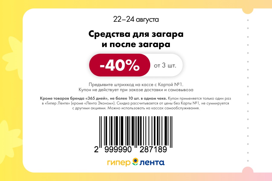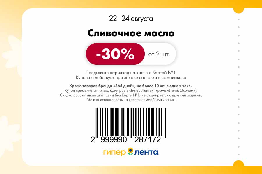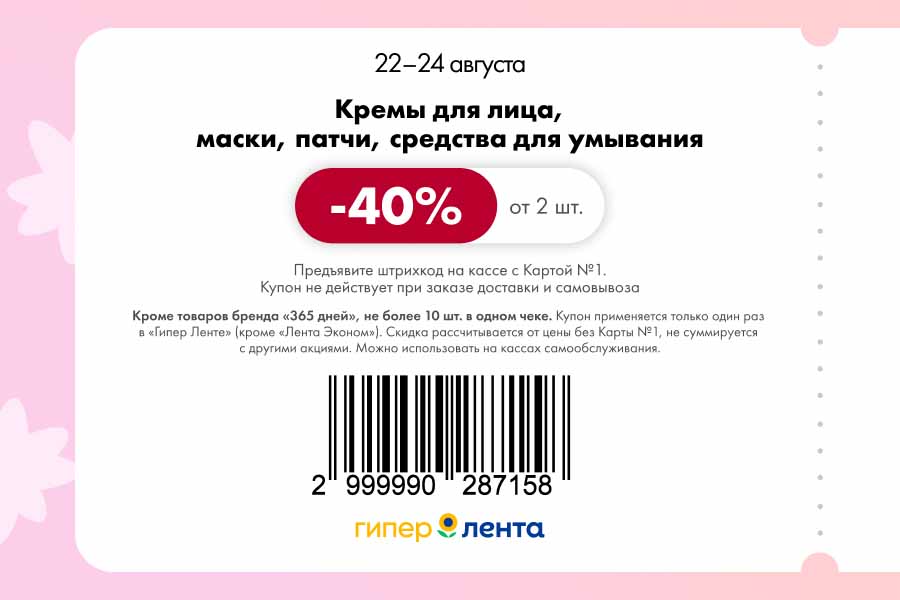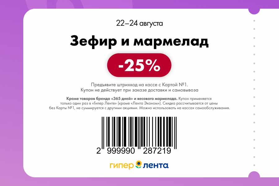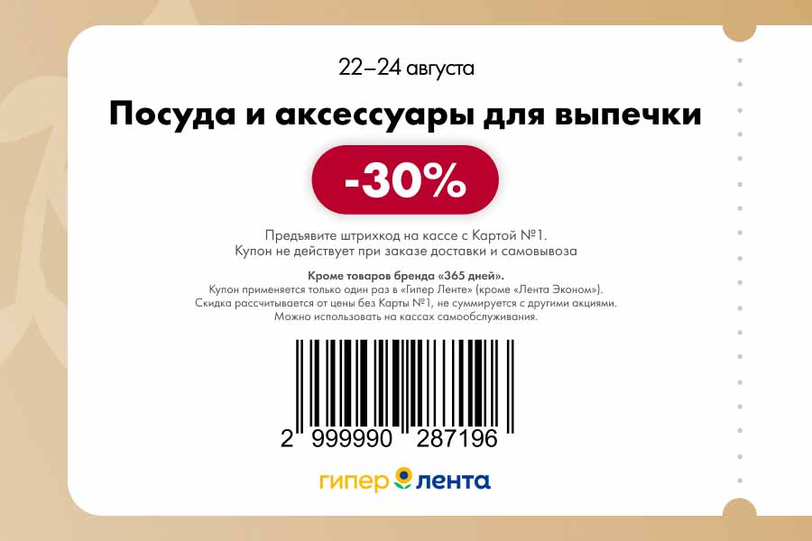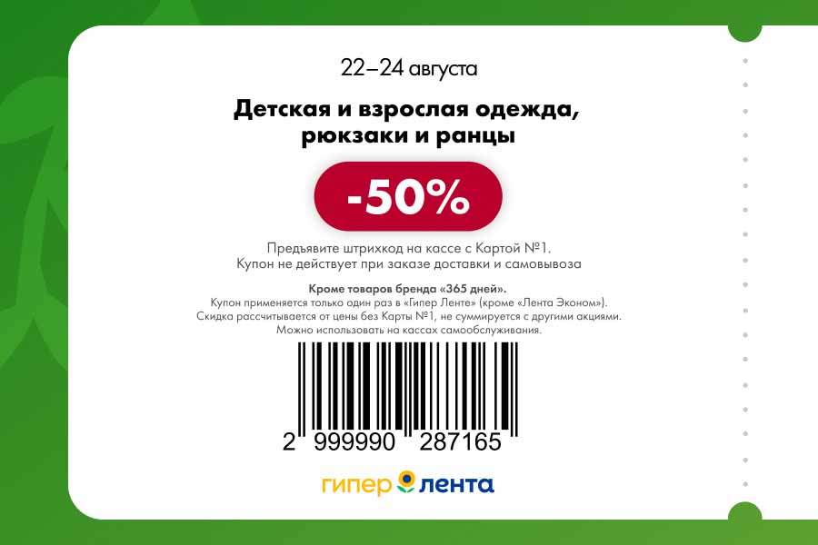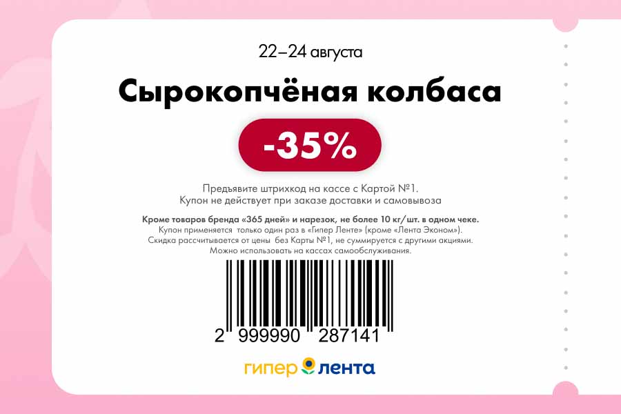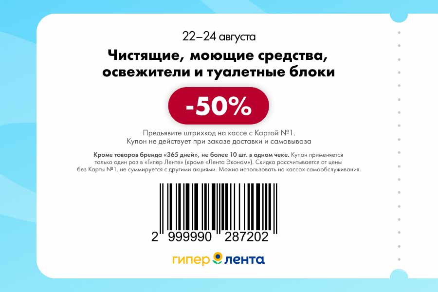 С 22 по 24 августа 2025 года сеть магазинов «Гипер Лента» предлагает покупателям серию выгодных акций с использованием специальных купонов. Скидки достигают 50%, но действуют только при предъявлении на кассе штрих-кода и «Карты №1».