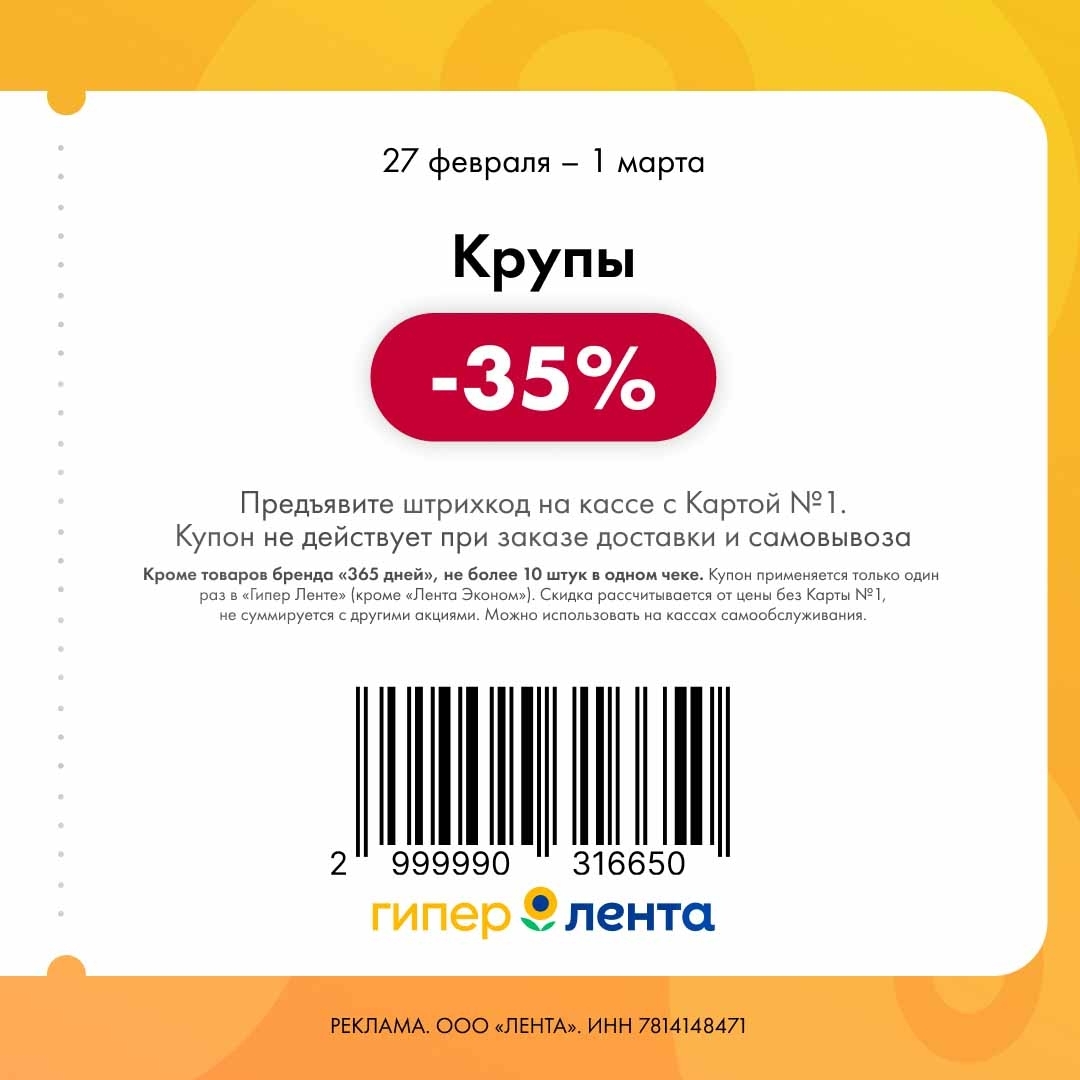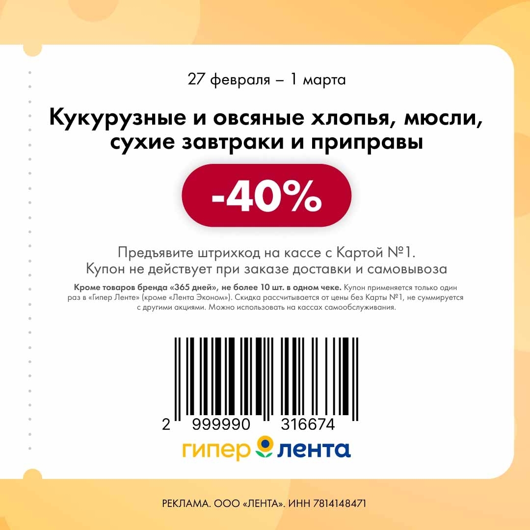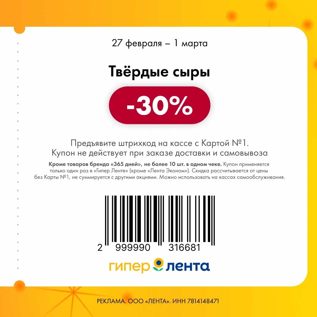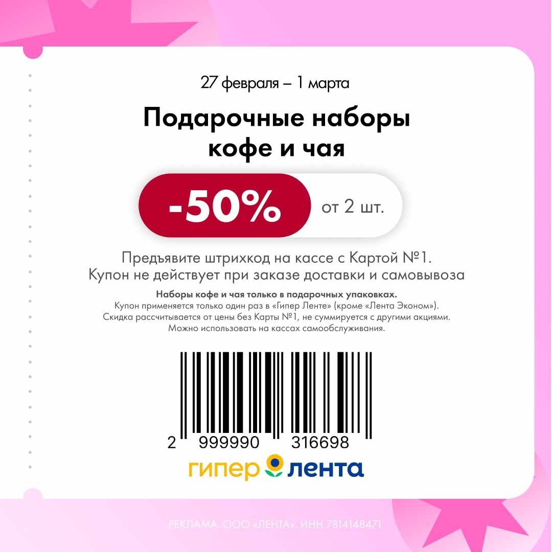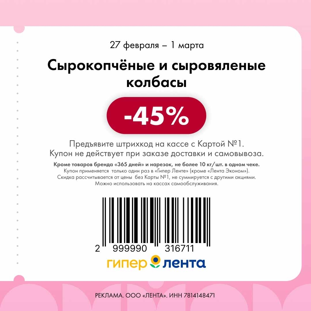 С 27 февраля по 1 марта 2026 года сеть магазинов «Гипер Лента» предлагает покупателям серию выгодных акций с использованием специальных купонов. Скидки достигают 50%, но действуют только при предъявлении на кассе штрих-кода и «Карты №1».