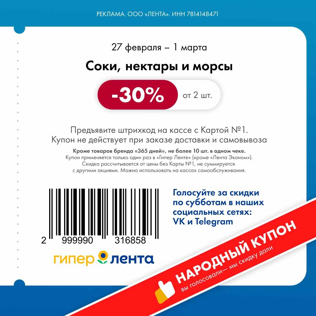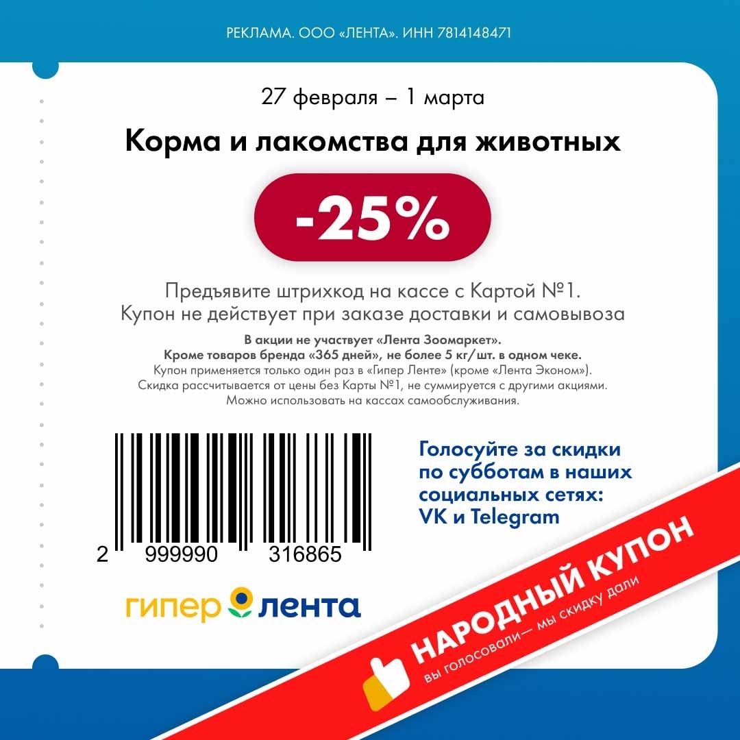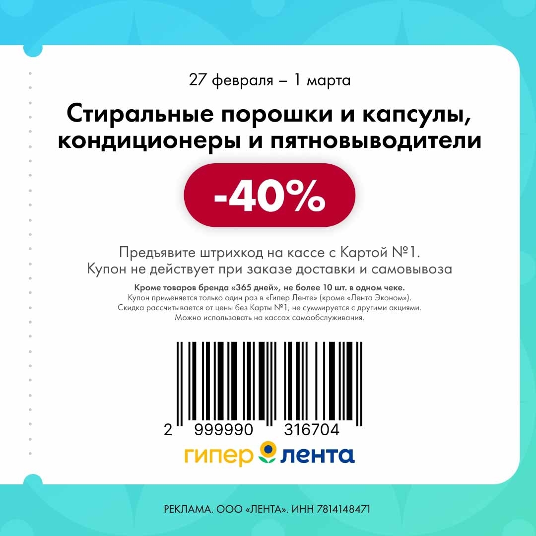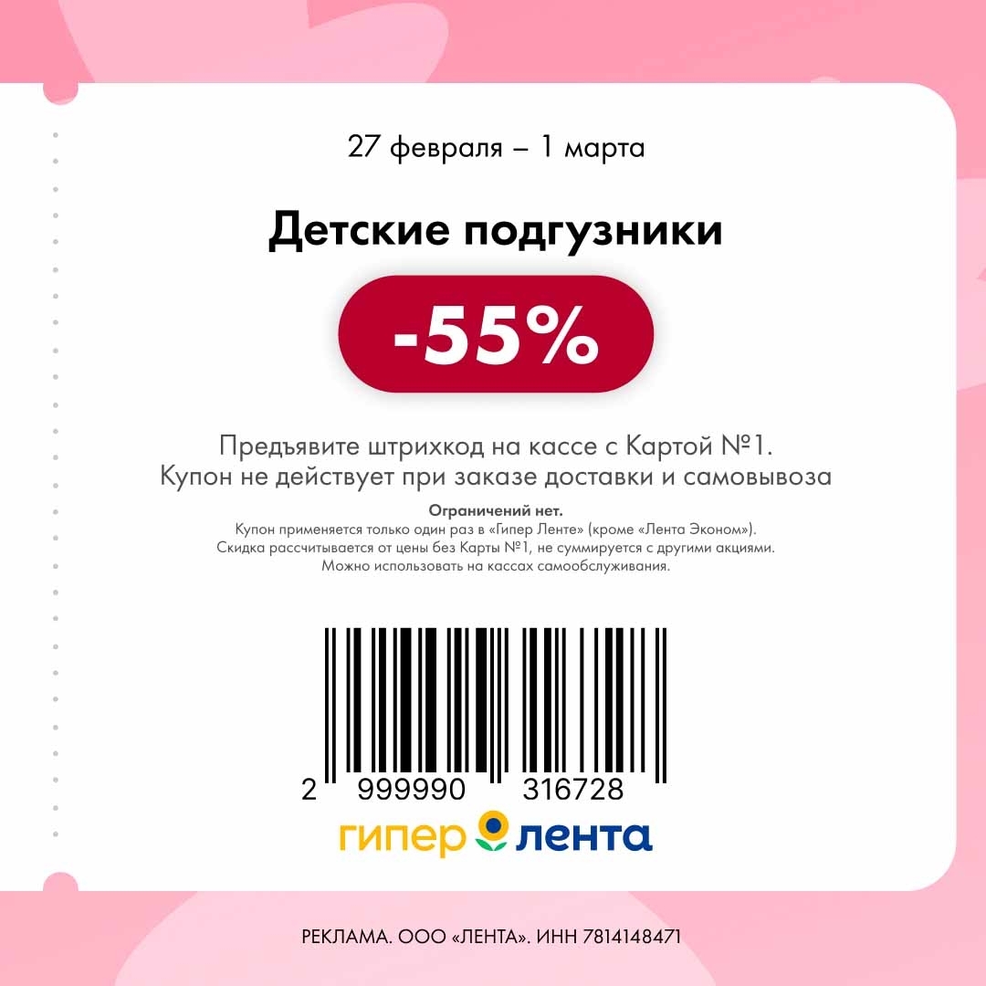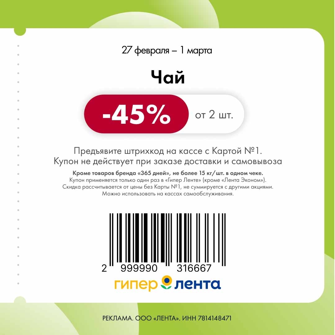 С 27 февраля по 1 марта 2026 года сеть магазинов «Гипер Лента» предлагает покупателям серию выгодных акций с использованием специальных купонов. Скидки достигают 50%, но действуют только при предъявлении на кассе штрих-кода и «Карты №1».