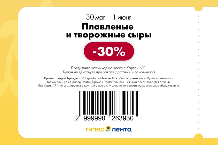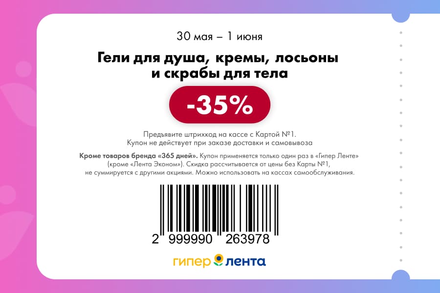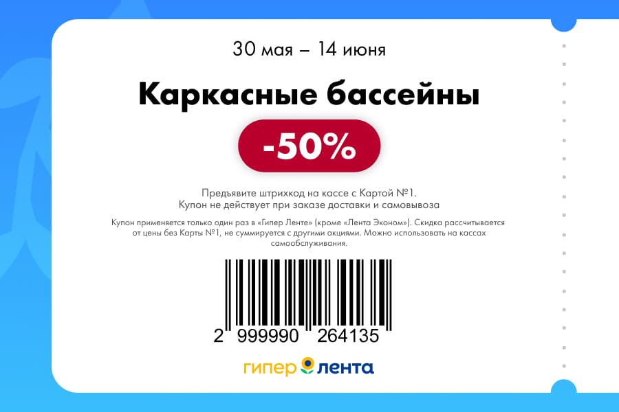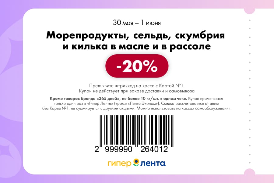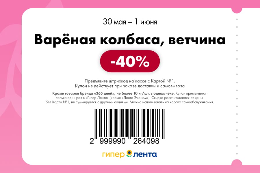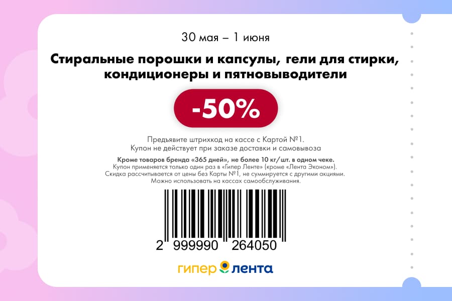 С 30 мая по 1 июня 2025 года сеть магазинов «Гипер Лента» предлагает покупателям серию выгодных акций с использованием специальных купонов. Скидки достигают 50%, но действуют только при предъявлении на кассе штрих-кода и «Карты №1».