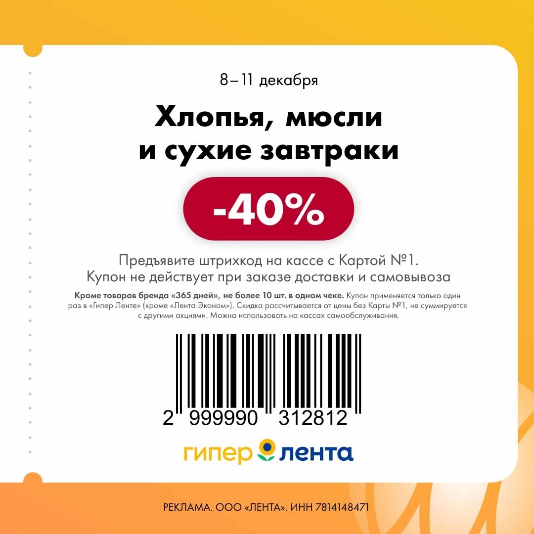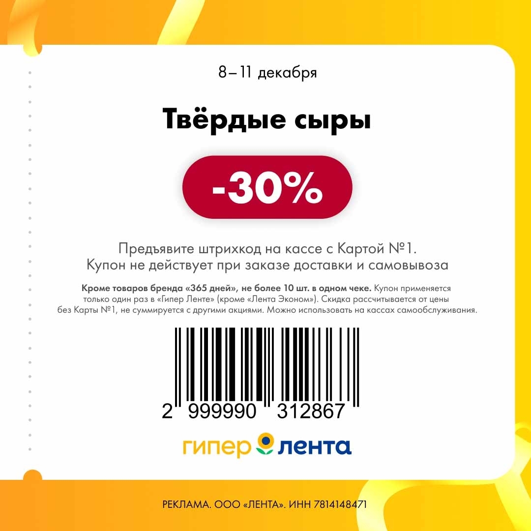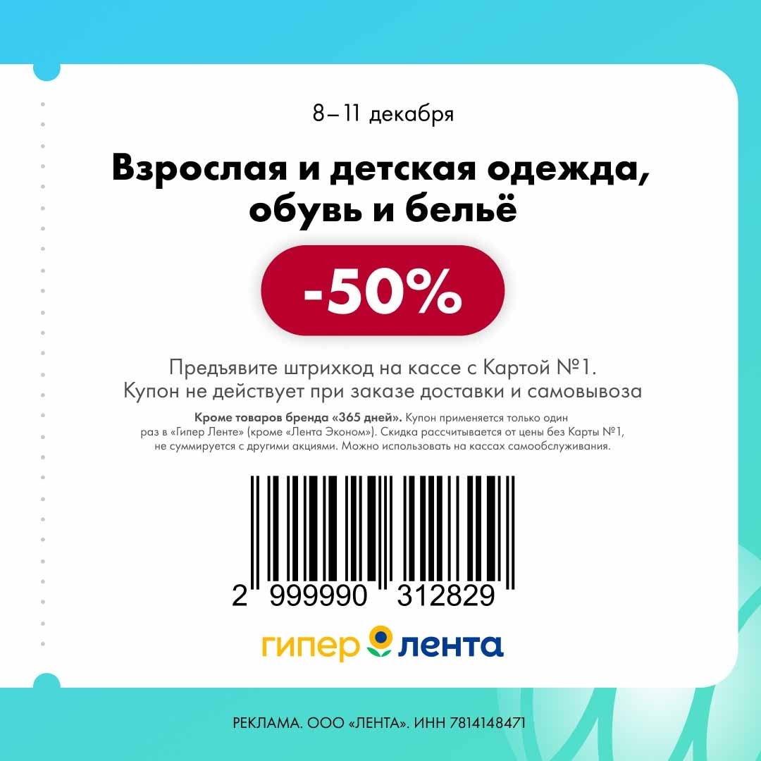 С 8 по 11 декабря 2025 года сеть магазинов «Гипер Лента» предлагает покупателям серию выгодных акций с использованием специальных купонов. Скидки достигают 50%, но действуют только при предъявлении на кассе штрих-кода и «Карты №1».