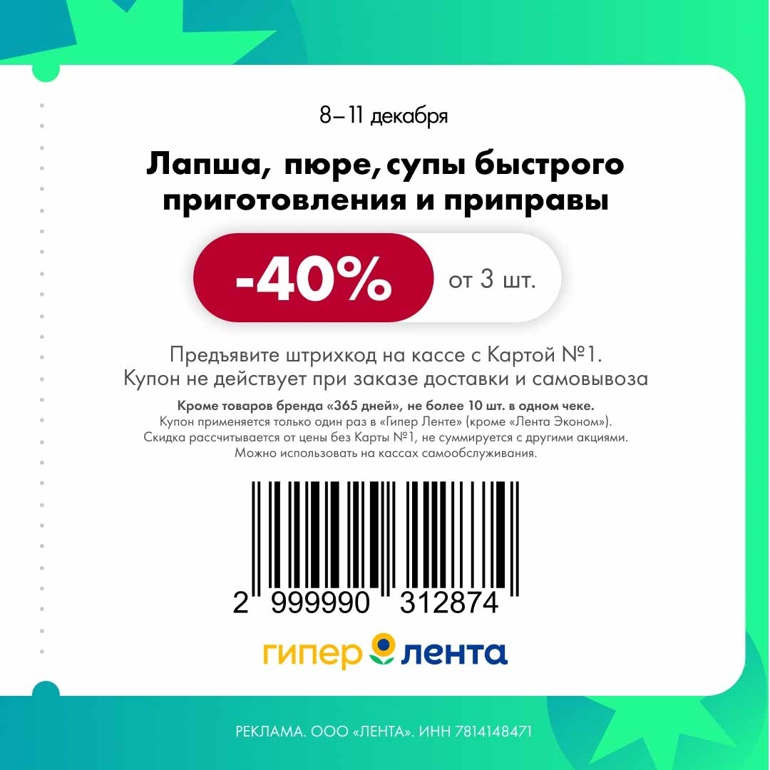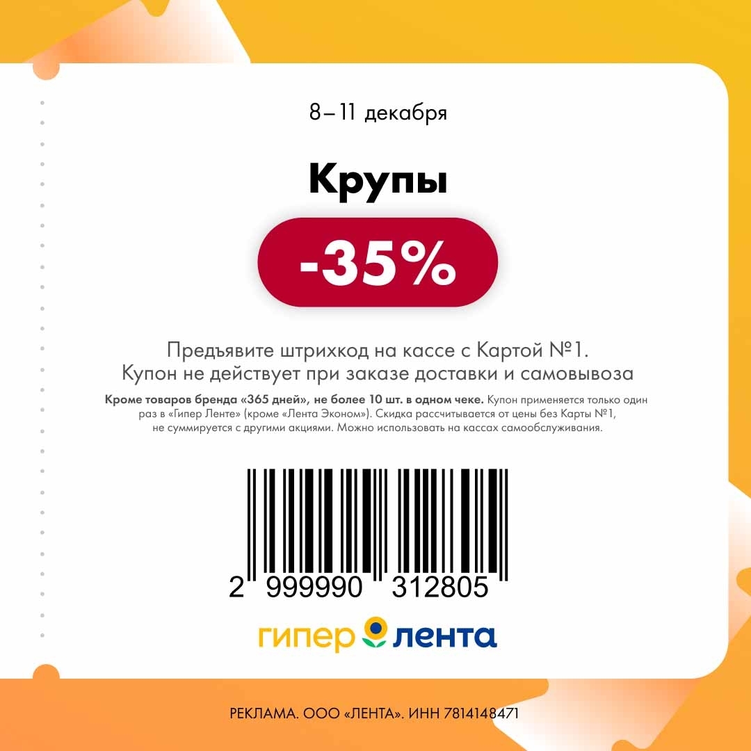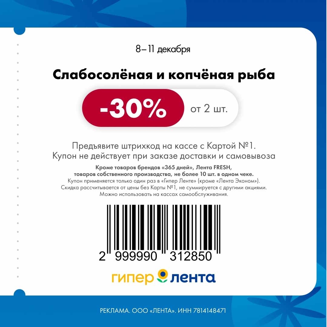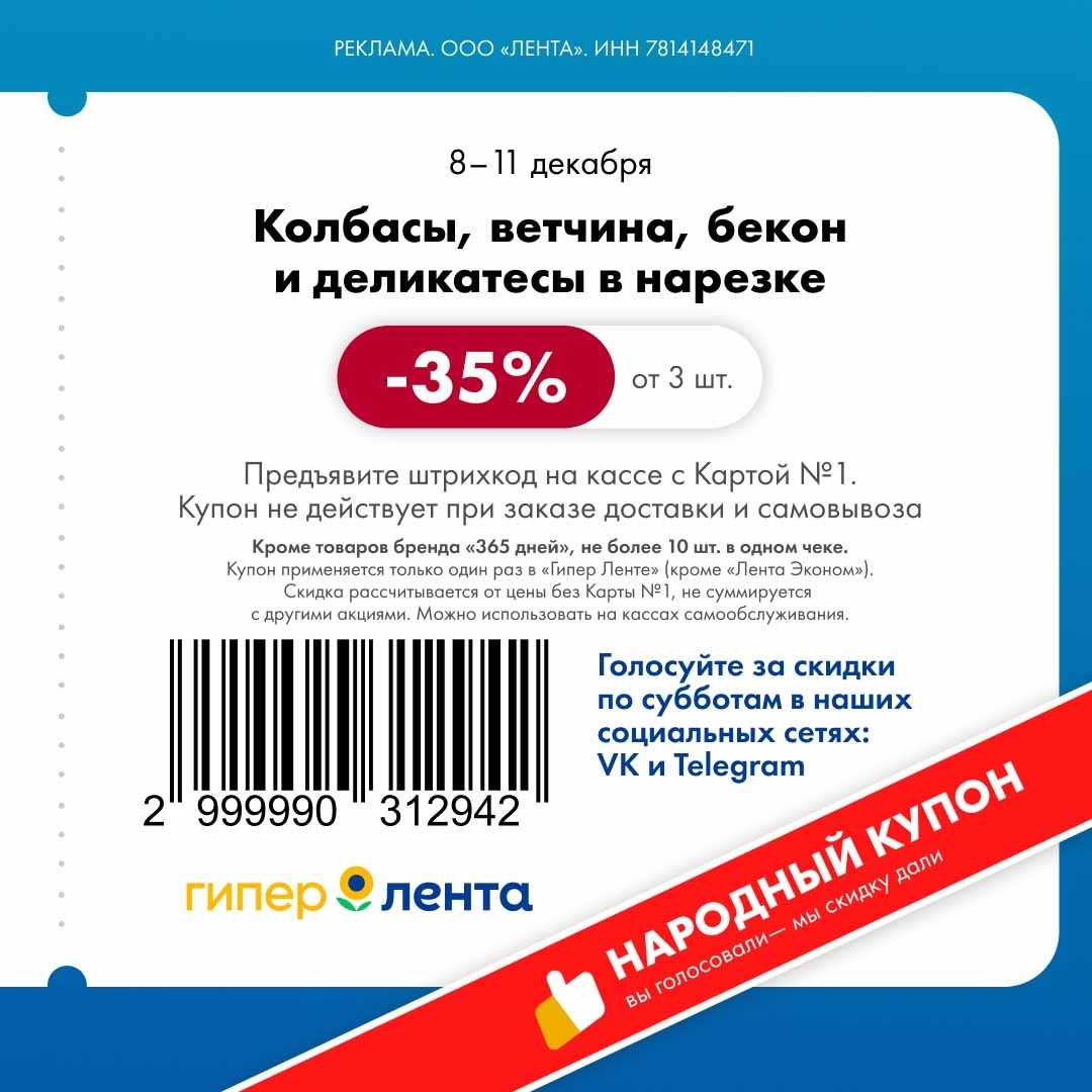 С 8 по 11 декабря 2025 года сеть магазинов «Гипер Лента» предлагает покупателям серию выгодных акций с использованием специальных купонов. Скидки достигают 50%, но действуют только при предъявлении на кассе штрих-кода и «Карты №1».