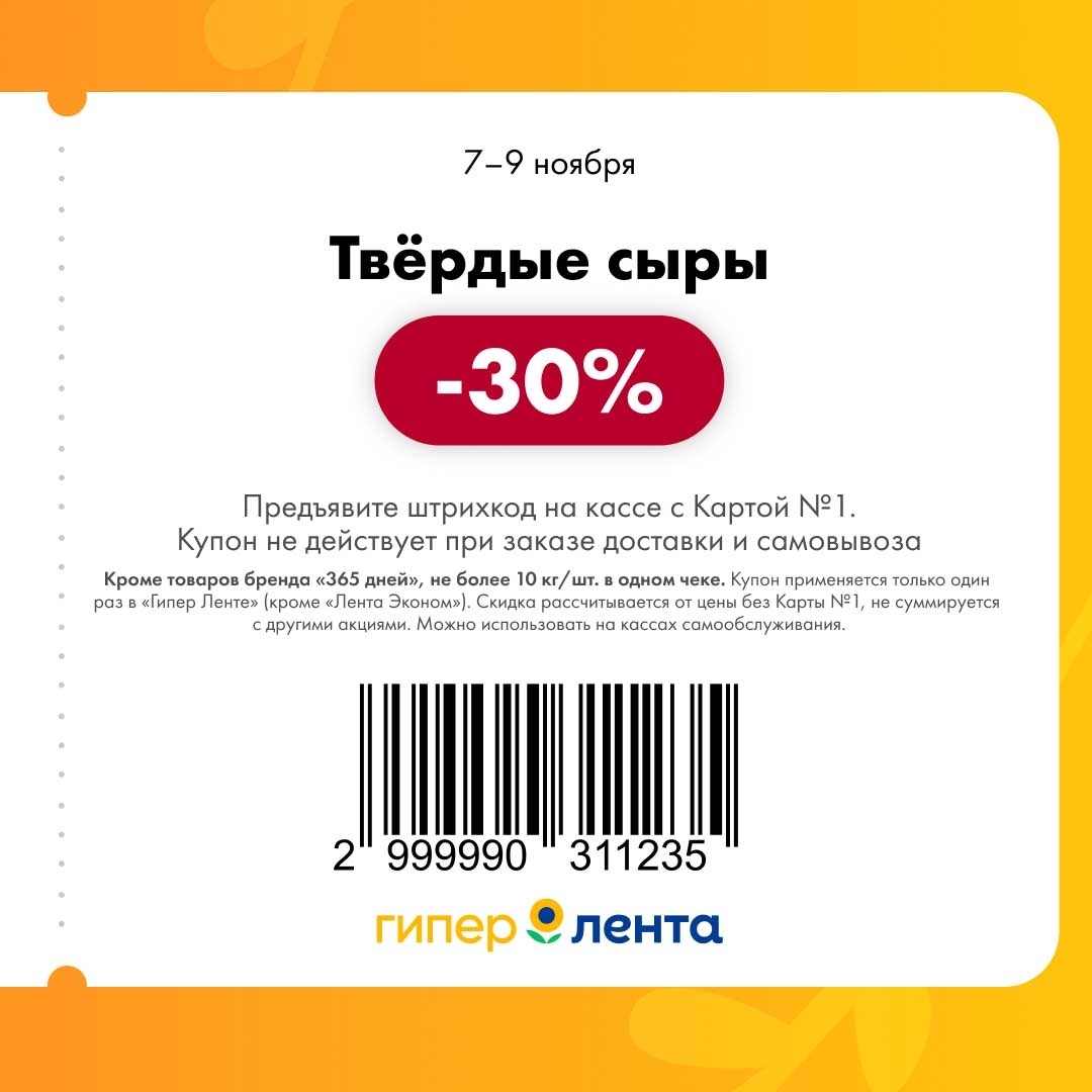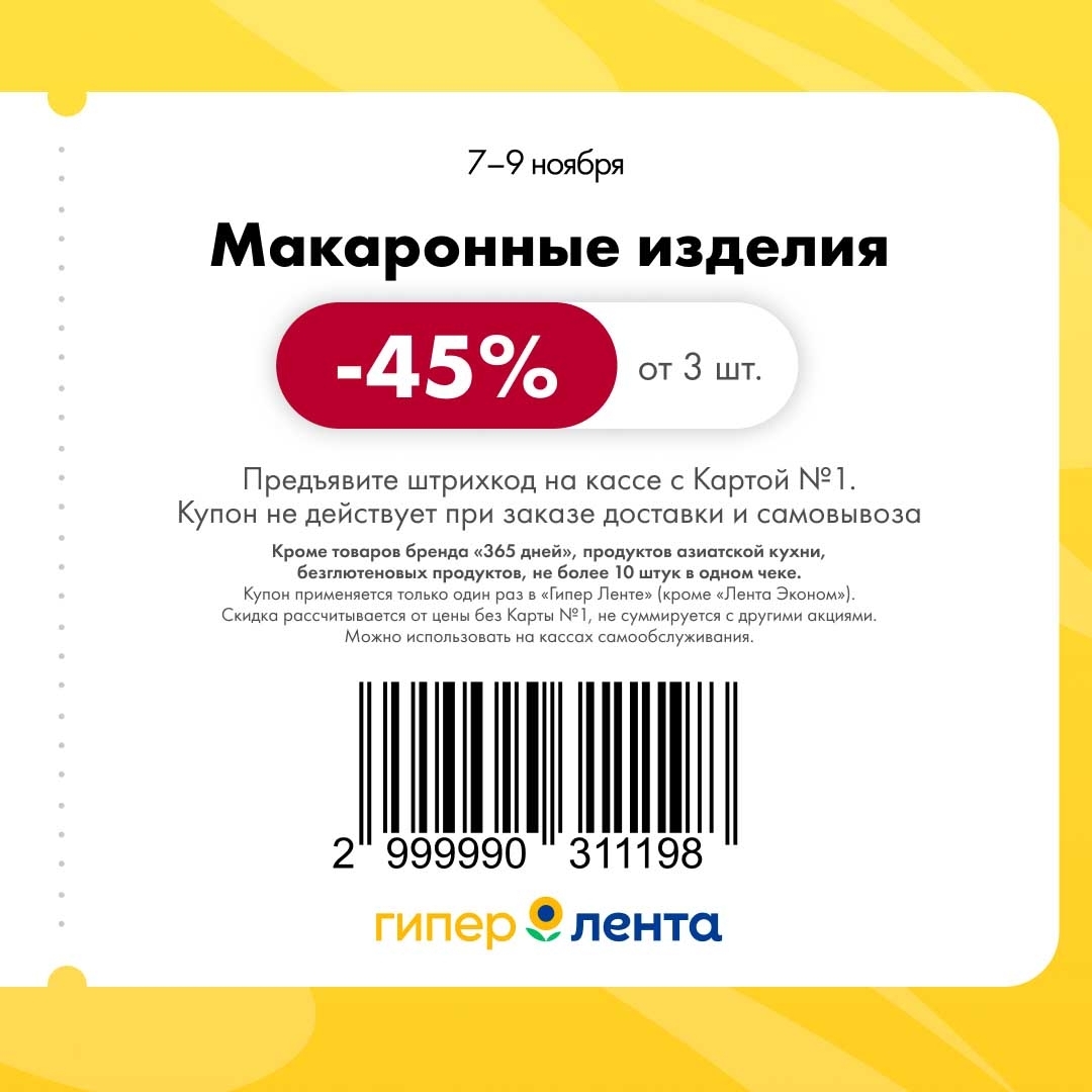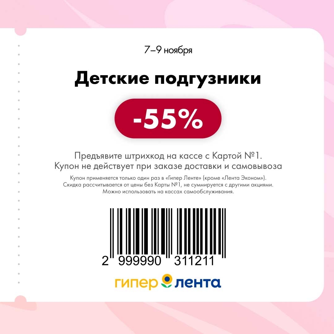 С 7 по 9 ноября 2025 года сеть магазинов «Гипер Лента» предлагает покупателям серию выгодных акций с использованием специальных купонов. Скидки достигают 55%, но действуют только при предъявлении на кассе штрих-кода и «Карты №1».