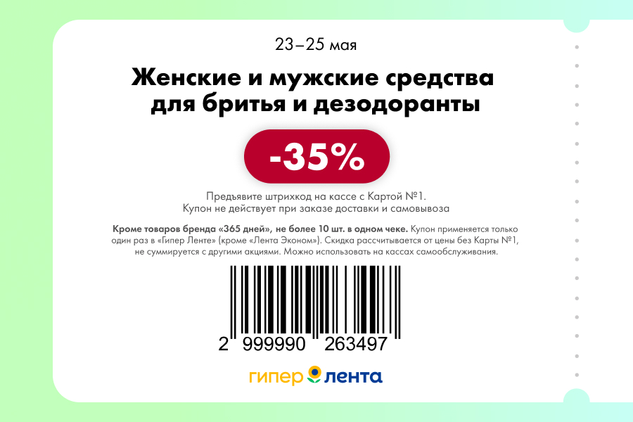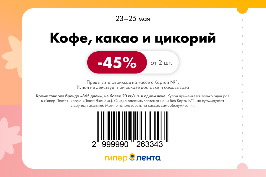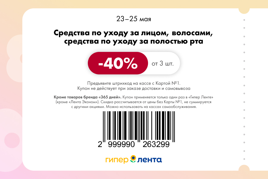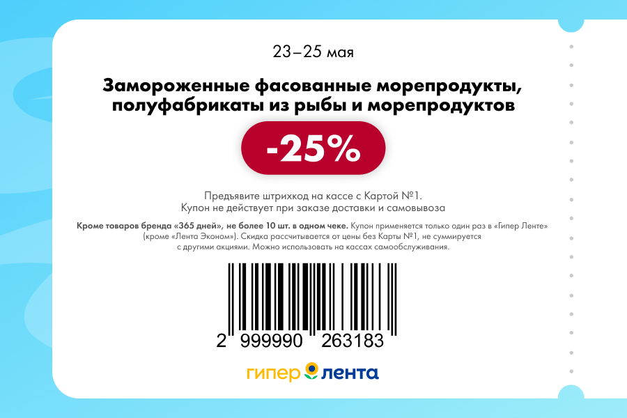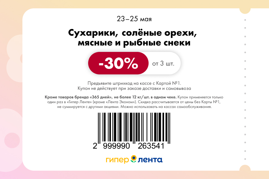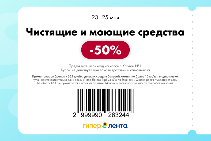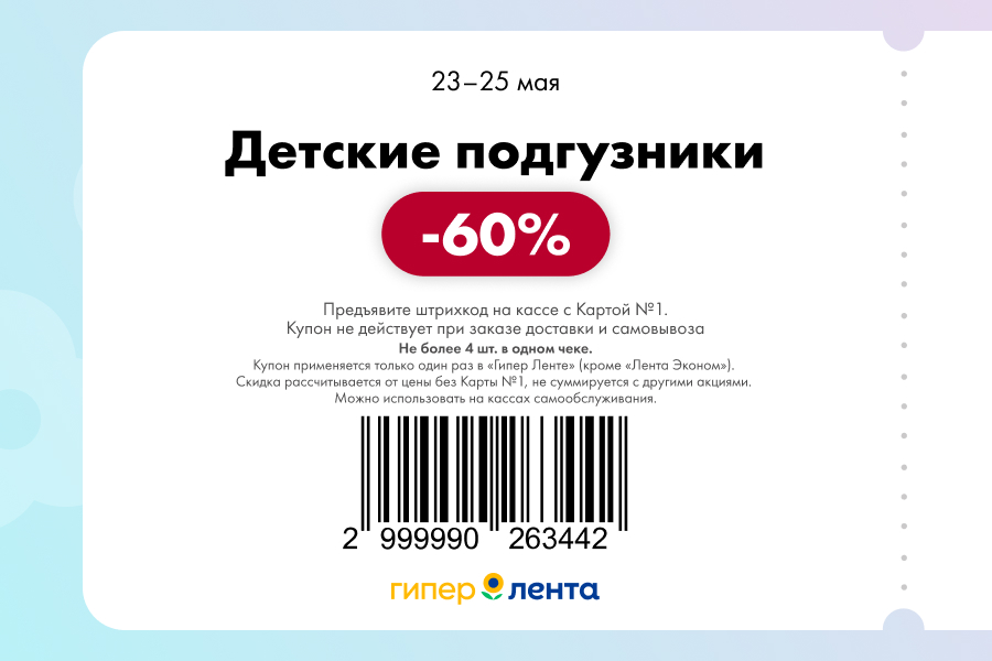 С 23 по 25 мая 2025 года сеть магазинов «Гипер Лента» предлагает покупателям серию выгодных акций с использованием специальных купонов. Скидки достигают 60%, но действуют только при предъявлении на кассе штрих-кода и «Карты №1».
