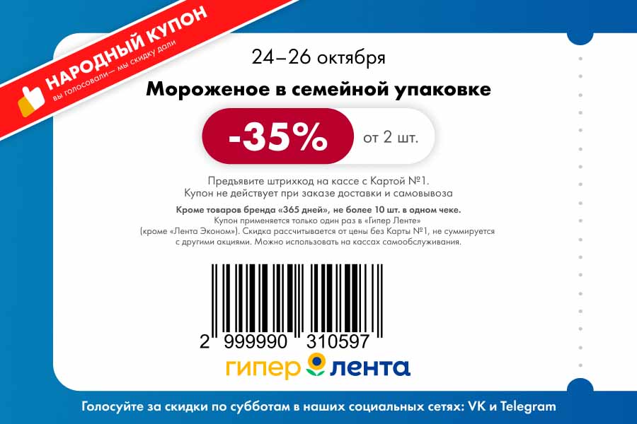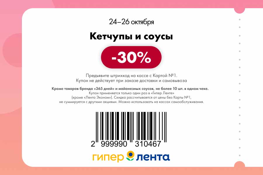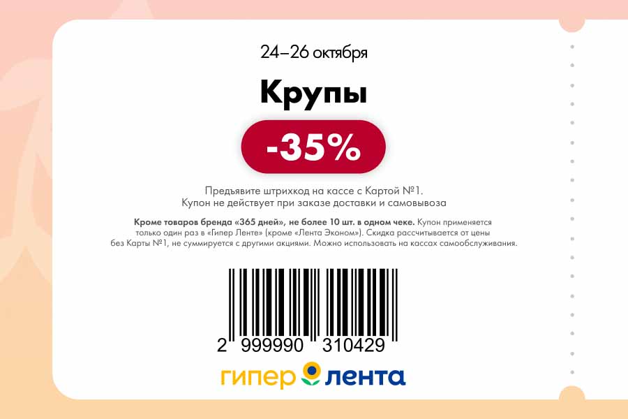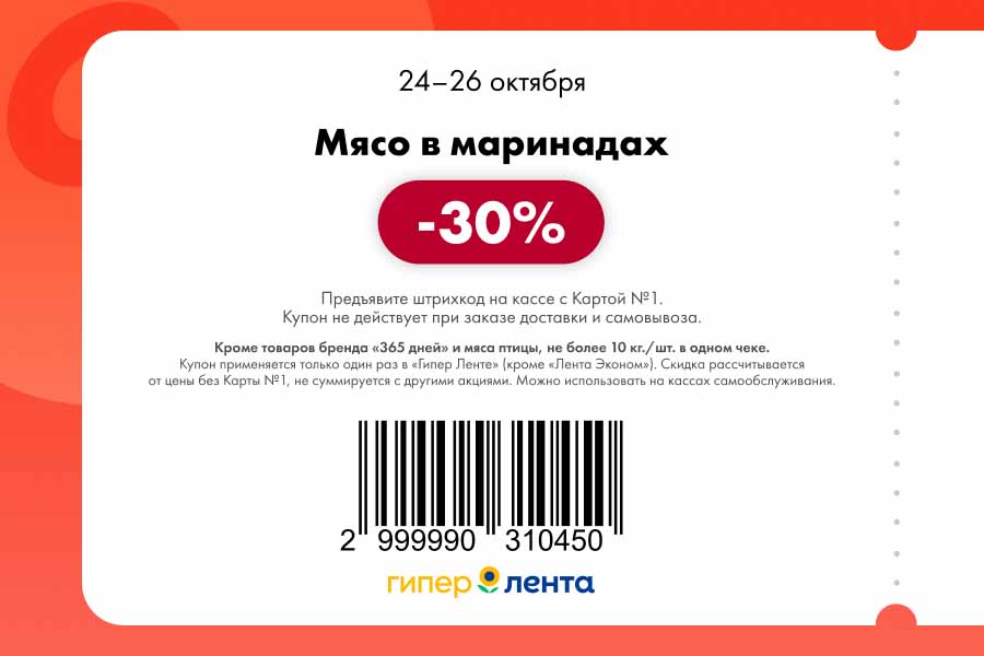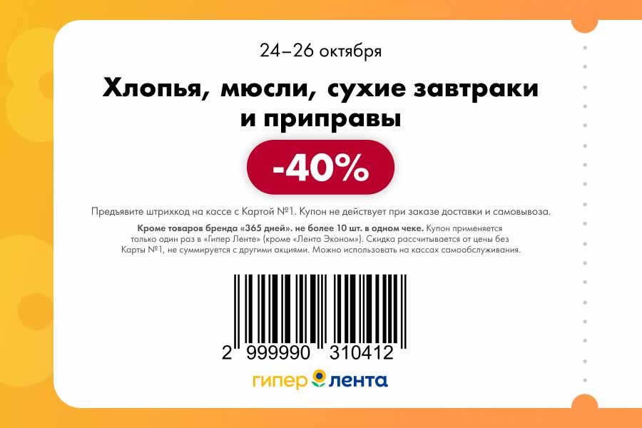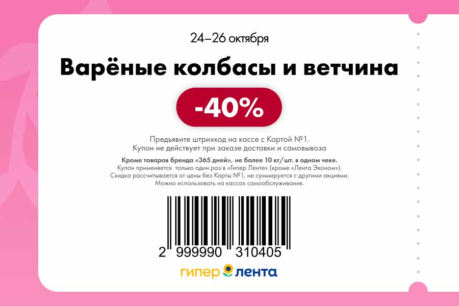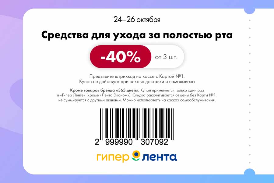 С 24 по 26 октября 2025 года сеть магазинов «Гипер Лента» предлагает покупателям серию выгодных акций с использованием специальных купонов. Скидки достигают 60%, но действуют только при предъявлении на кассе штрих-кода и «Карты №1».
