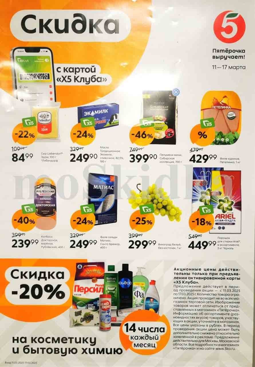 Каталог акций «Пятерочка» — это не просто скидки, это возможность сэкономить, не потеряв при этом качества продуктов. Цены по акции Пятерочка действуют в городах: Москва, Балашиха, Химки, Подольск, Королев, Мытищи, Люберцы, Электросталь, Коломна, Одинцово, Железнодорожный, Серпухов, Орехово-Зуево, Красногорск, Щелково, Сергиев Посад, Пушкино, Жуковский, Ногинск, Раменское, Клин, Воскресенск, Домодедово и многих других населенных пунктах Московского региона. Изображение акционных товаров может отличаться от представленных на полках. В течение проведения промо цена из буклета может быть дополнительно снижена.