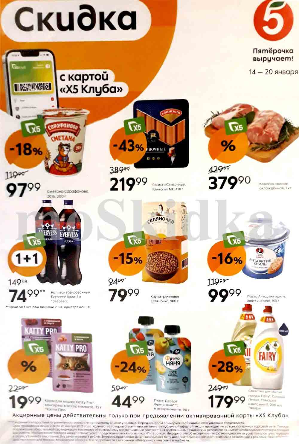 Каталог акций «Пятерочка» — это не просто скидки, это возможность сэкономить, не потеряв при этом качества продуктов. Цены по акции Пятерочка действуют в городах: Москва, Балашиха, Химки, Подольск, Королев, Мытищи, Люберцы, Электросталь, Коломна, Одинцово, Железнодорожный, Серпухов, Орехово-Зуево, Красногорск, Щелково, Сергиев Посад, Пушкино, Жуковский, Ногинск, Раменское, Клин, Воскресенск, Домодедово и многих других населенных пунктах Московского региона. Изображение акционных товаров может отличаться от представленных на полках. В течение проведения промо цена из буклета может быть дополнительно снижена.