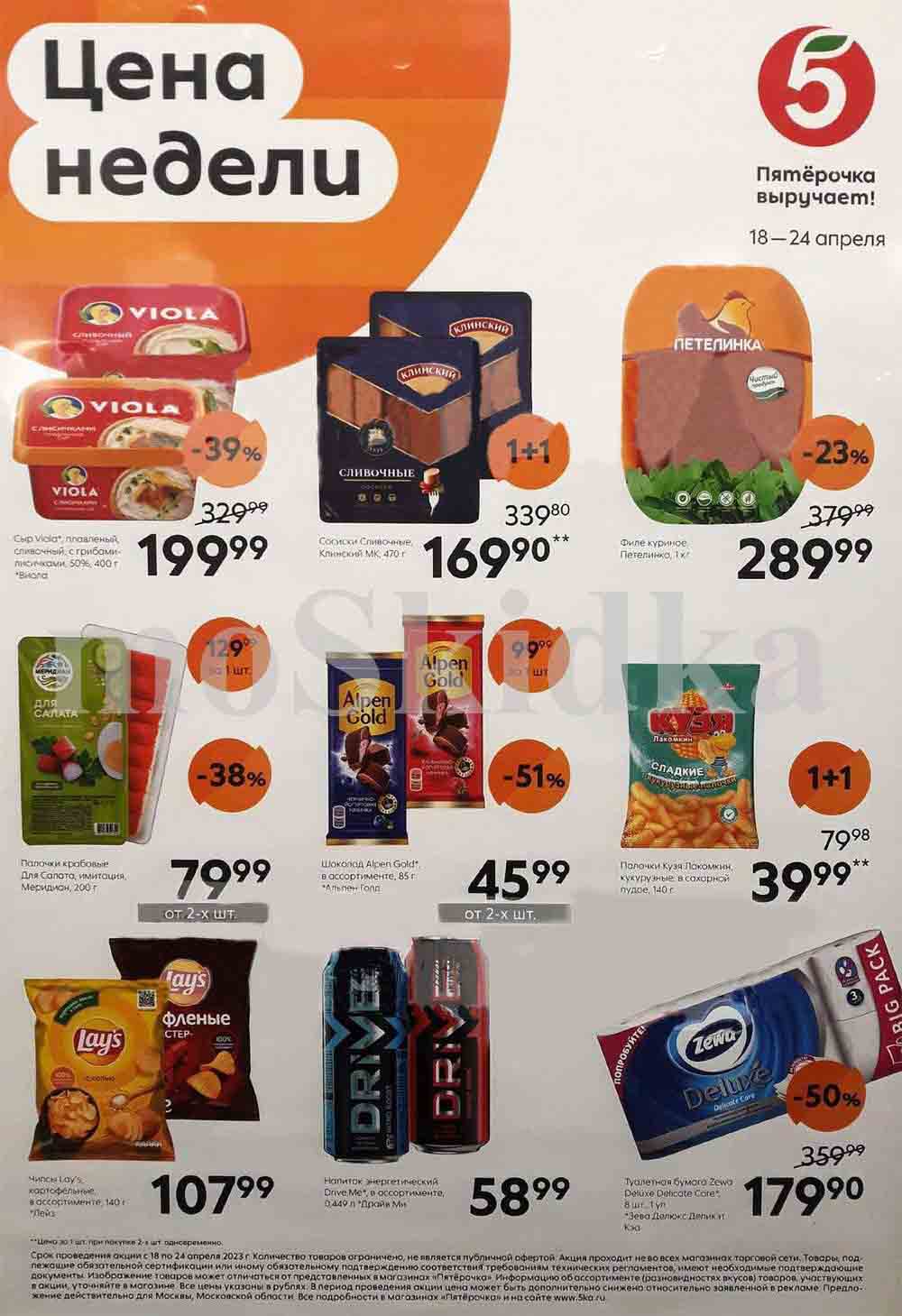 Каталог акций «Пятерочка» — это не просто скидки, это возможность сэкономить, не потеряв при этом качества продуктов. Цены по акции Пятерочка действуют в городах: Москва, Балашиха, Химки, Подольск, Королев, Мытищи, Люберцы, Электросталь, Коломна, Одинцово, Железнодорожный, Серпухов, Орехово-Зуево, Красногорск, Щелково, Сергиев Посад, Пушкино, Жуковский, Ногинск, Раменское, Клин, Воскресенск, Домодедово и многих других населенных пунктах Московского региона. Изображение акционных товаров может отличаться от представленных на полках. В течение проведения промо цена из буклета может быть дополнительно снижена.