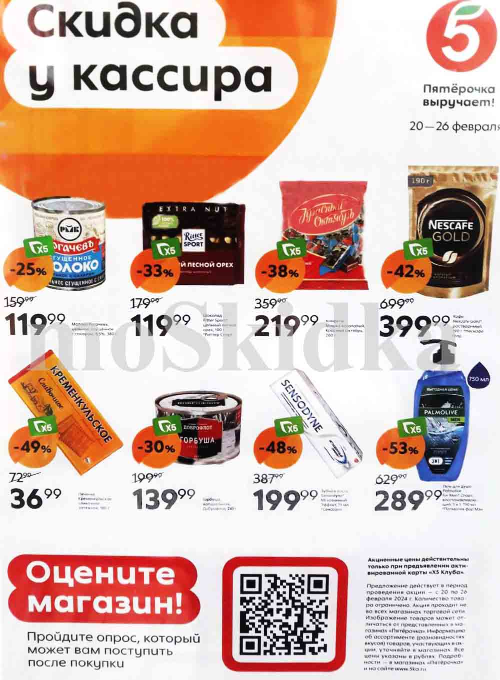 В акционном буклете предложены выгодные цены на различные продукты питания, такие как молоко, шоколад, печенье и консервированная рыба. Скидки варьируются от 25% до 53% от первоначальных цен.