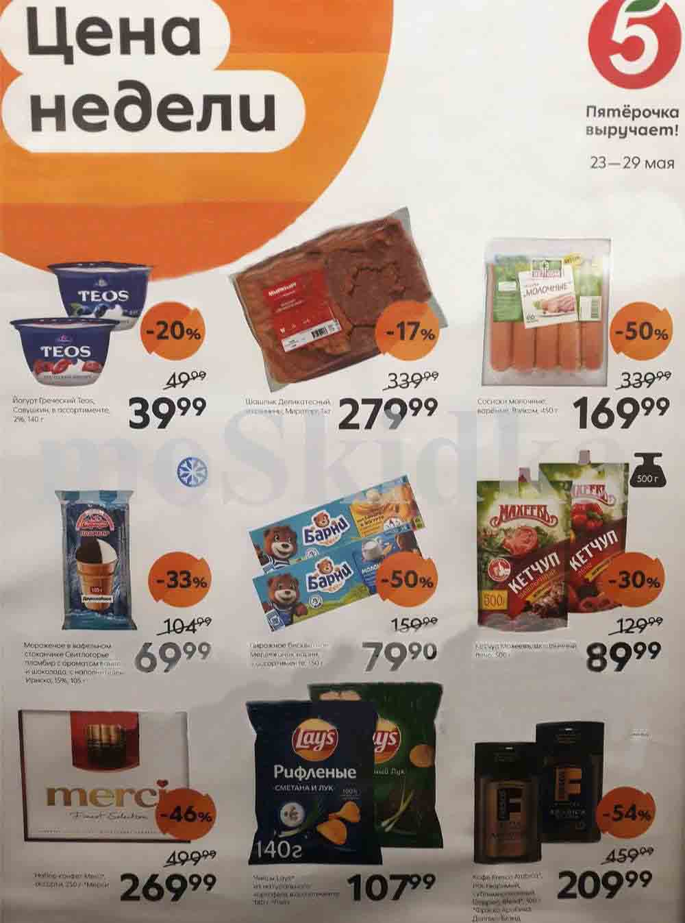 Каталог акций «Пятерочка» — это не просто скидки, это возможность сэкономить, не потеряв при этом качества продуктов. Цены по акции Пятерочка действуют в городах: Москва, Балашиха, Химки, Подольск, Королев, Мытищи, Люберцы, Электросталь, Коломна, Одинцово, Железнодорожный, Серпухов, Орехово-Зуево, Красногорск, Щелково, Сергиев Посад, Пушкино, Жуковский, Ногинск, Раменское, Клин, Воскресенск, Домодедово и многих других населенных пунктах Московского региона. Изображение акционных товаров может отличаться от представленных на полках. В течение проведения промо цена из буклета может быть дополнительно снижена.