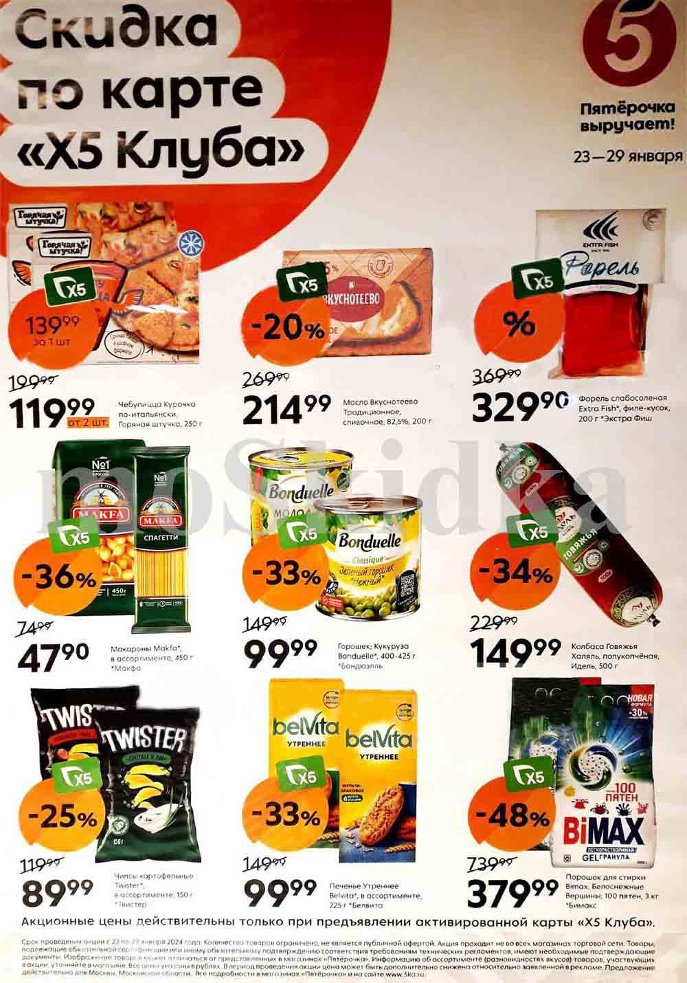 Каталог акций «Пятерочка» — это не просто скидки, это возможность сэкономить, не потеряв при этом качества продуктов. Цены по акции Пятерочка действуют в городах: Москва, Балашиха, Химки, Подольск, Королев, Мытищи, Люберцы, Электросталь, Коломна, Одинцово, Железнодорожный, Серпухов, Орехово-Зуево, Красногорск, Щелково, Сергиев Посад, Пушкино, Жуковский, Ногинск, Раменское, Клин, Воскресенск, Домодедово и многих других населенных пунктах Московского региона. Изображение акционных товаров может отличаться от представленных на полках. В течение проведения промо цена из буклета может быть дополнительно снижена.