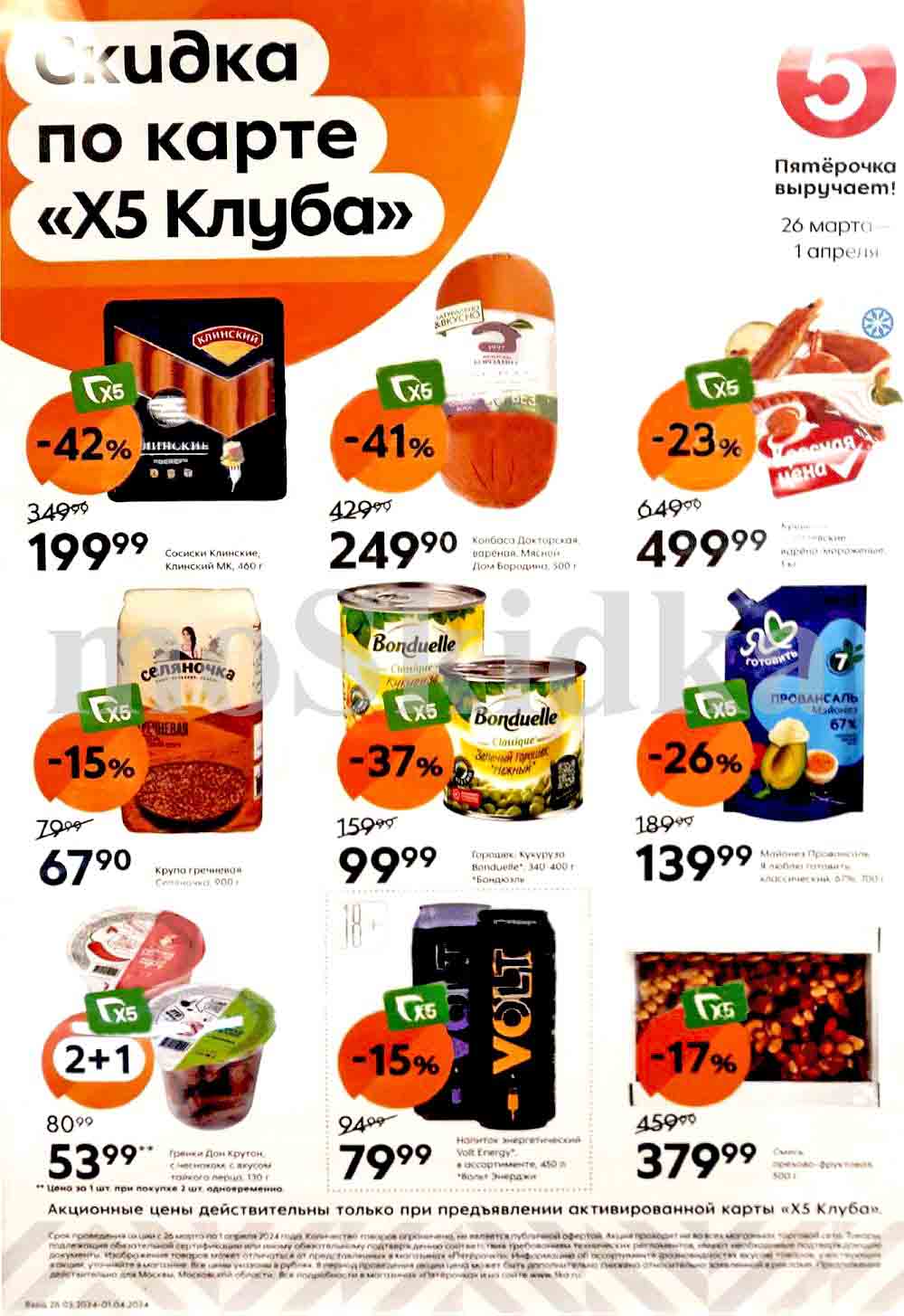 В акционном буклете предложены выгодные цены на различные продукты, такие как: сосиски Клинские со скидкой 42%, колбаса Докторская Мясной Дом Бородина с выгодой 41%, Гренки Дом Крутон по акции 2+1 и многое другое. Скидки варьируются от 15% до 53% от первоначальных цен.