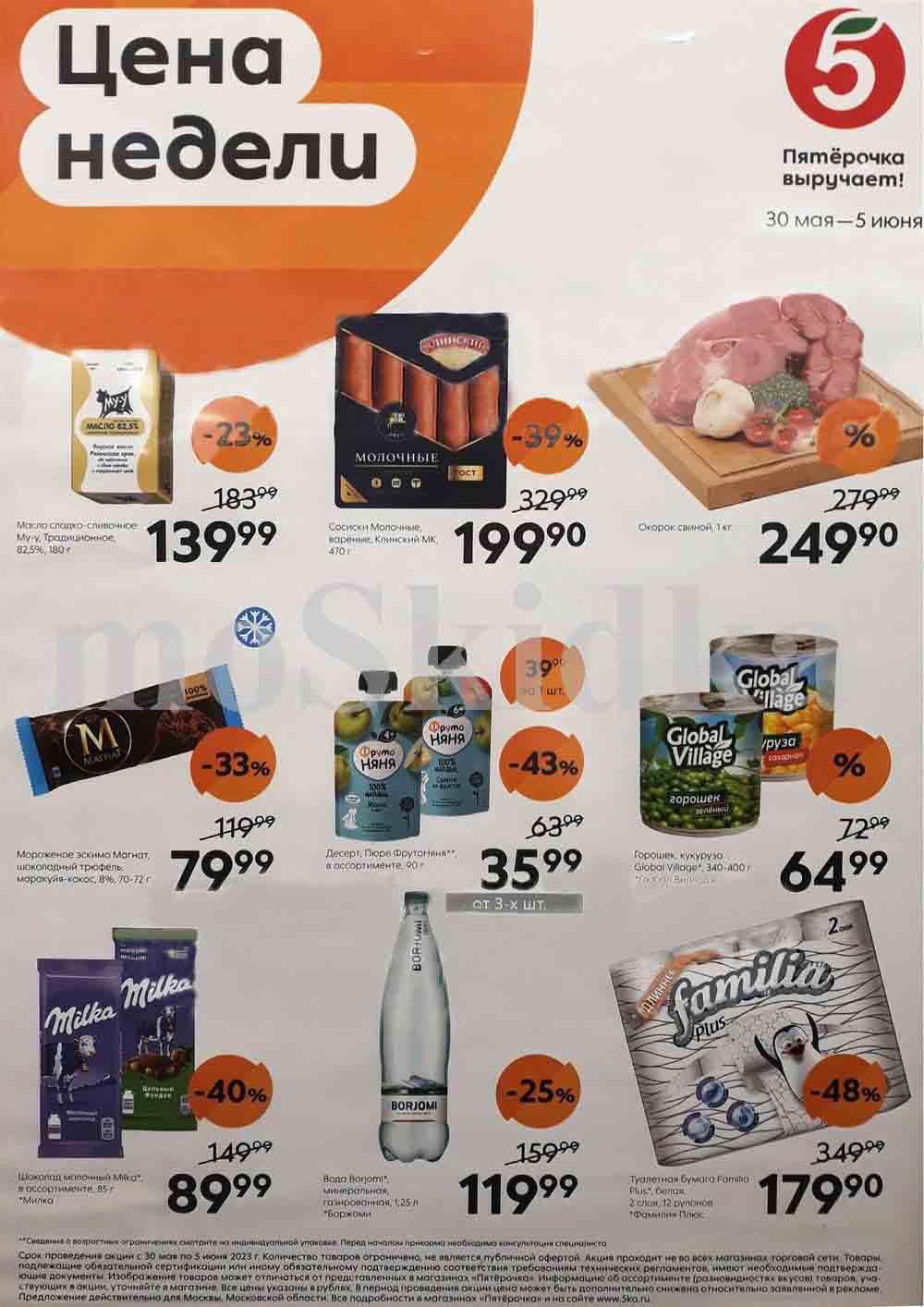 Каталог акций «Пятерочка» — это не просто скидки, это возможность сэкономить, не потеряв при этом качества продуктов. Цены по акции Пятерочка действуют в городах: Москва, Балашиха, Химки, Подольск, Королев, Мытищи, Люберцы, Электросталь, Коломна, Одинцово, Железнодорожный, Серпухов, Орехово-Зуево, Красногорск, Щелково, Сергиев Посад, Пушкино, Жуковский, Ногинск, Раменское, Клин, Воскресенск, Домодедово и многих других населенных пунктах Московского региона. Изображение акционных товаров может отличаться от представленных на полках. В течение проведения промо цена из буклета может быть дополнительно снижена.