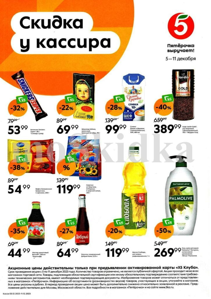 Подробную информацию об правилах, адресах и скидках узнавайте в магазинах или по тел. 8-800-555-55-05 и на сайте: 5ka.ru