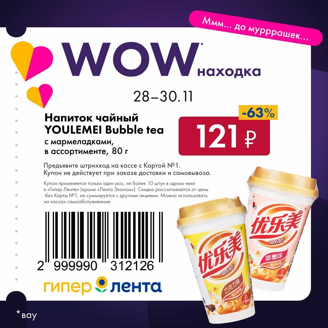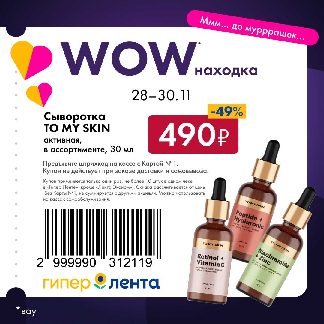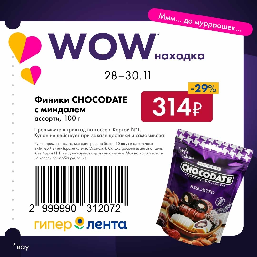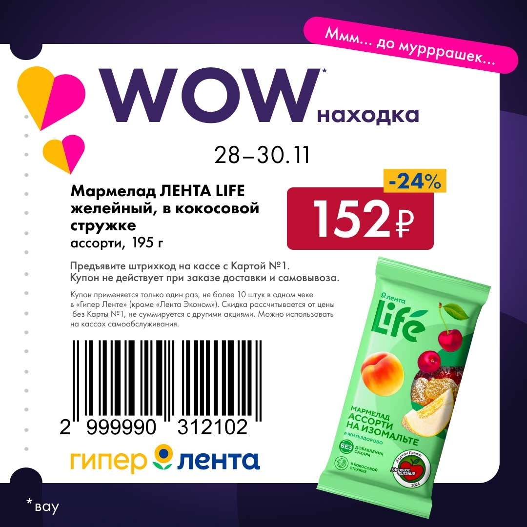 С 28 ноября — 30 ноября 2025 года сеть магазинов «Гипер Лента» предлагает покупателям серию выгодных акций с использованием специальных купонов. Предъявите штрихкод на кассе и получите привлекательную цену на товары-участники.