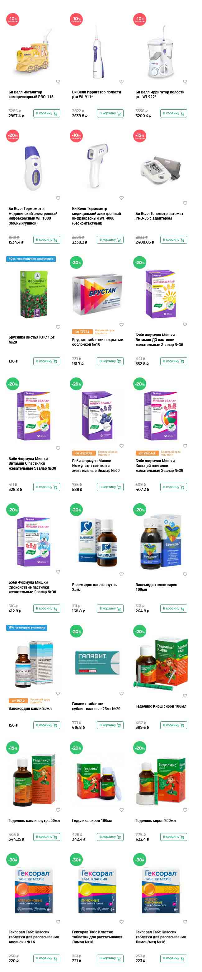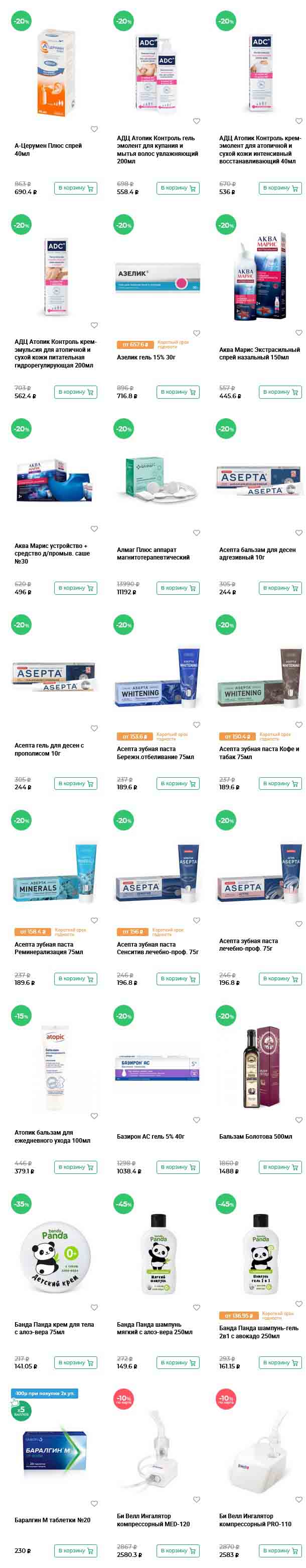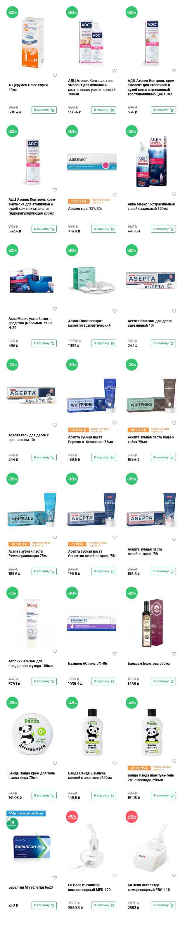 В акционном буклете предложены выгодные цены на различные товары, такие как А-Церумен Плюс спрей 40мл — 690.4 руб., Асепта бальзам для десен адгезивный 10г — 244 руб., Баралгин М таблетки No20 — 230 руб. и многое другое.
