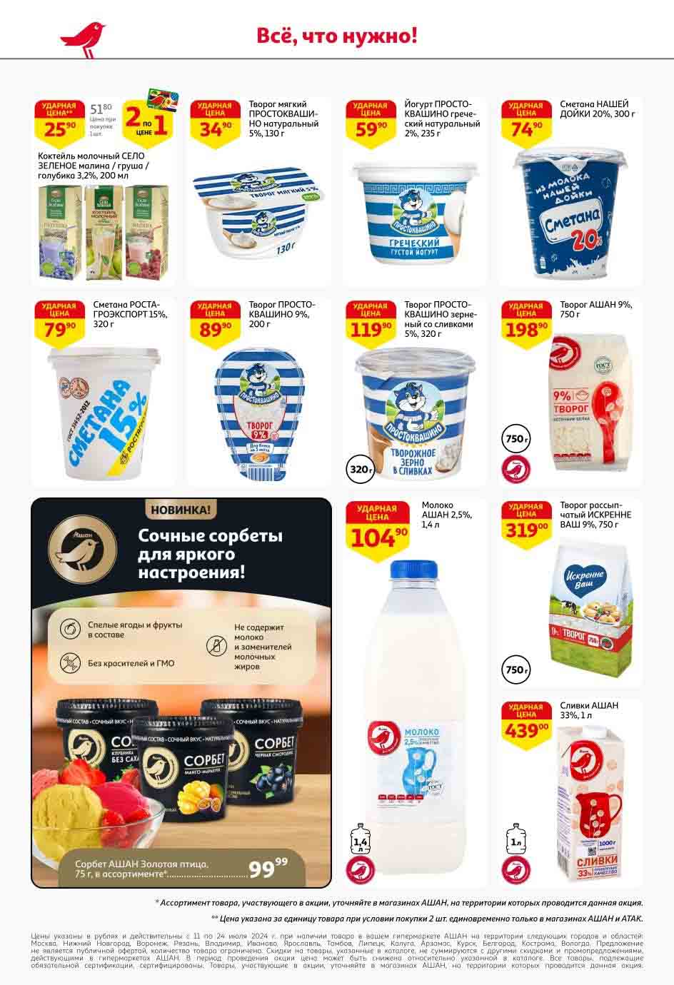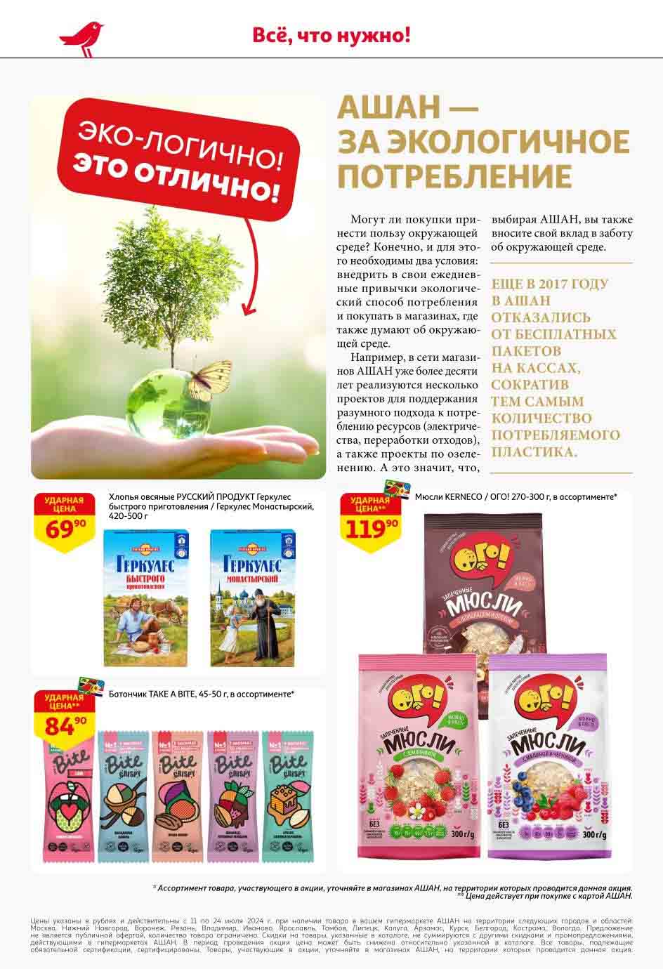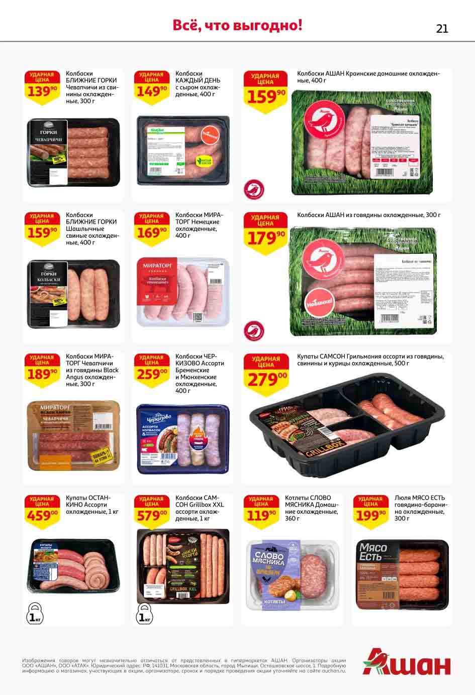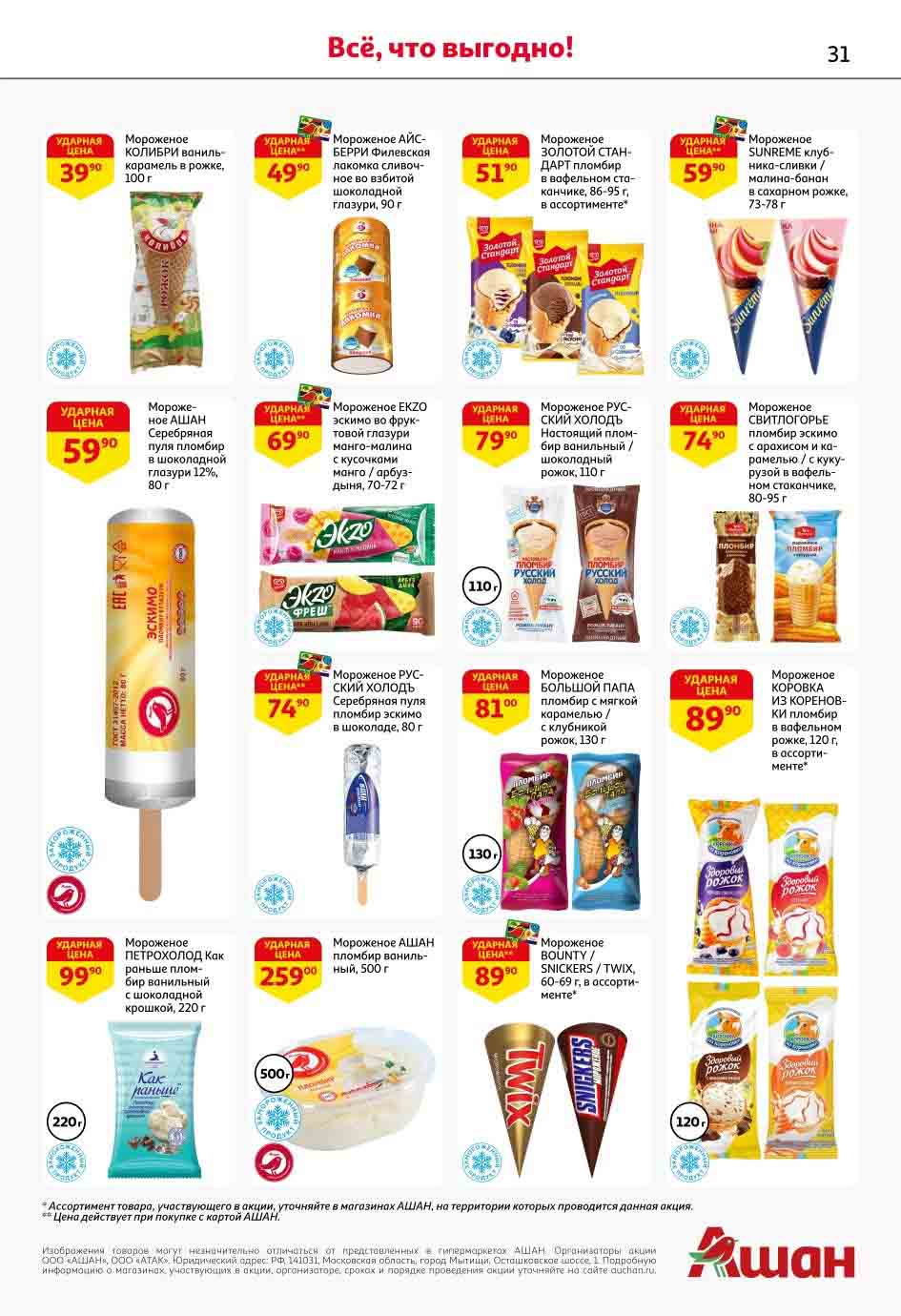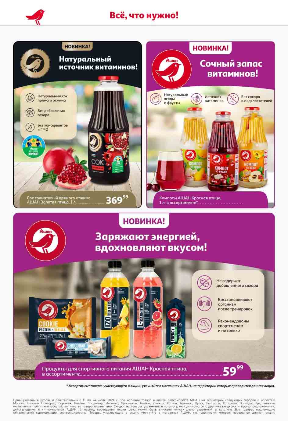 На страницах каталога Ашан вы найдете все свои любимые продукты, которые сейчас предлагаются в супермаркете. Не пропустите последние специальные предложения и сэкономьте на покупках. Предложение действительно при наличии товара на прилавках. Скидки на товары, указанные в каталоге, не суммируются с другими скидками. Изображения товаров могут незначительно отличаться от представленных на полках. Цены по акции Ашан действуют в городах: Москва. Балашиха. Химки. Подольск. Королев. Мытищи. Люберцы. Электросталь. Коломна. Одинцово. Железнодорожный, Серпухов, Орехово-Зуево. Красногорск, Щелково, Сергиев Посад, Пушкино. Жуковский, Ногинск, Раменское и многих других населенных пунктах Московского региона.