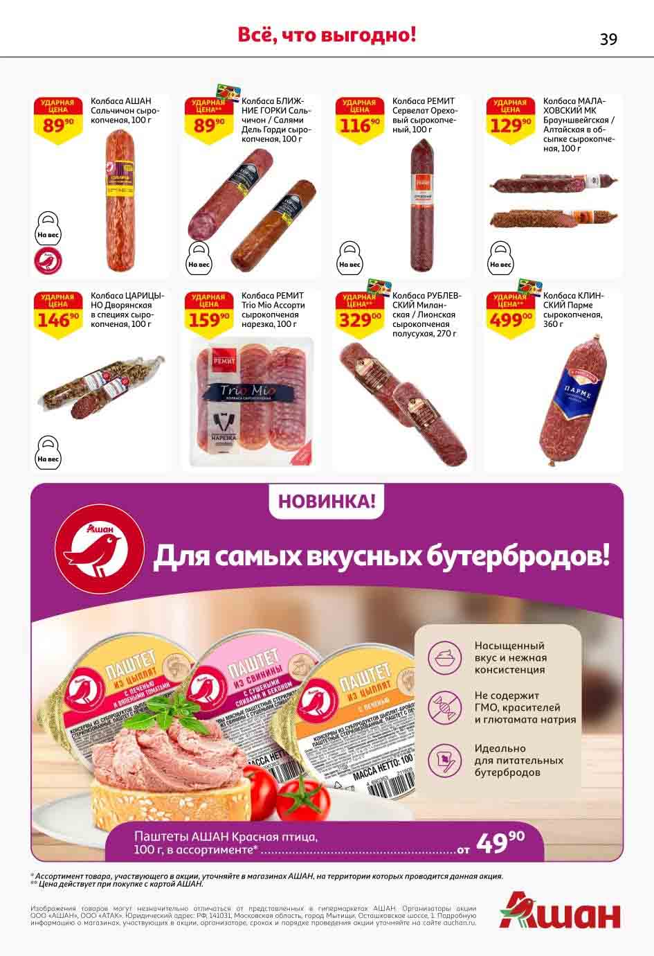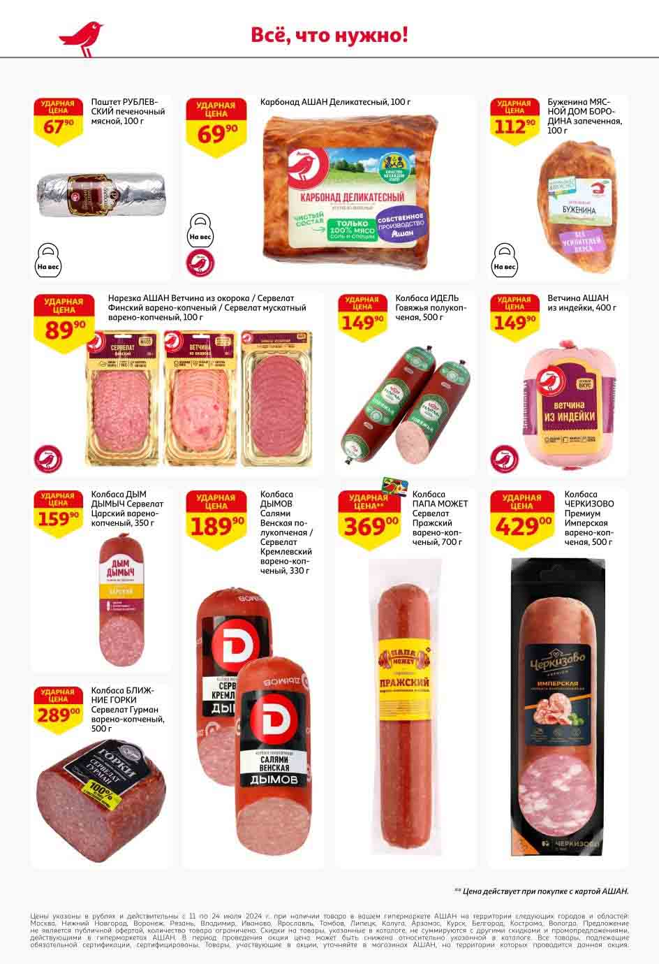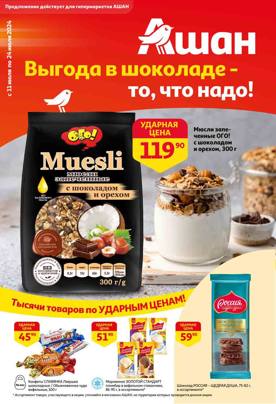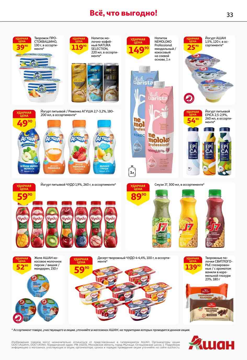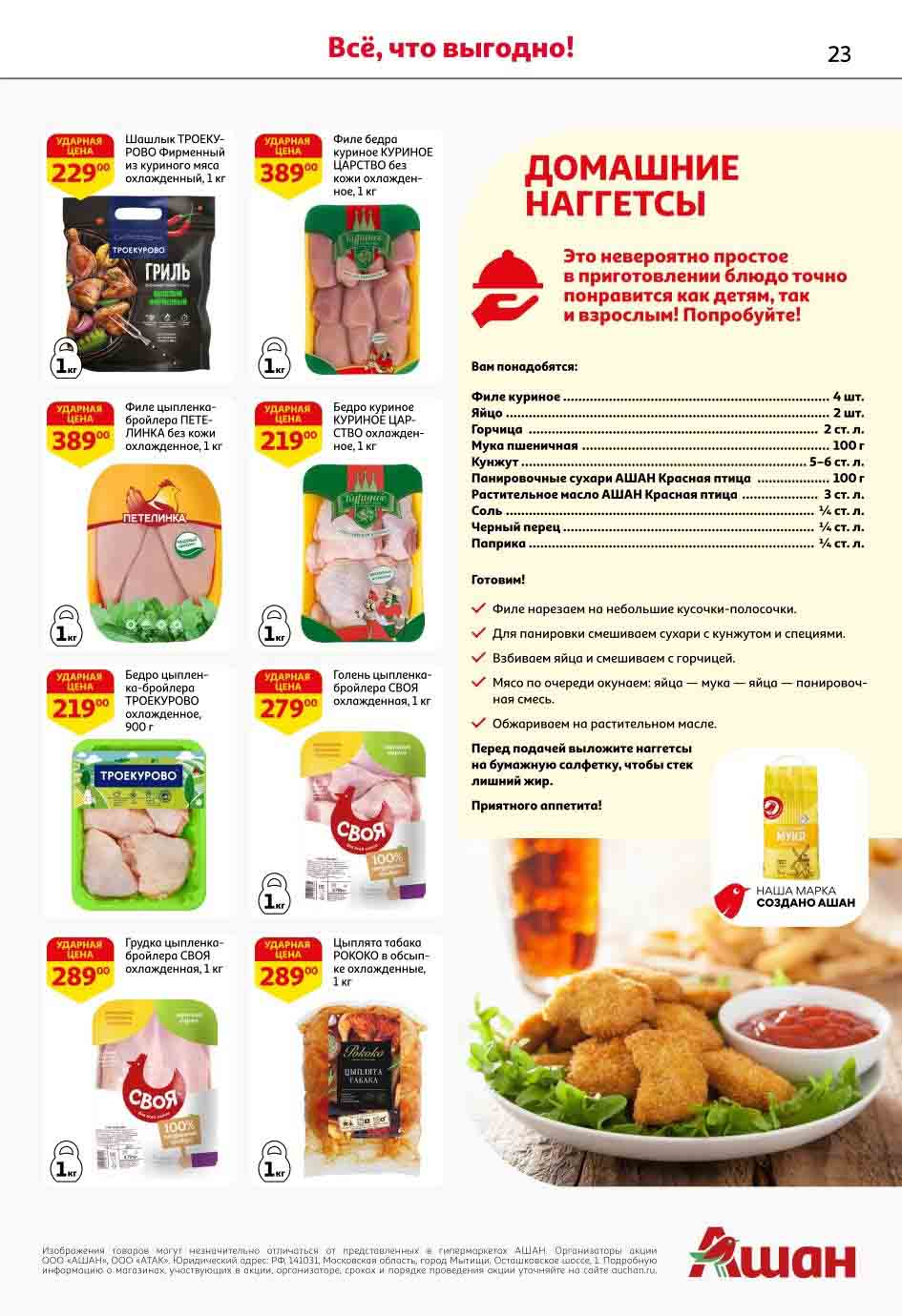 На страницах каталога Ашан вы найдете все свои любимые продукты, которые сейчас предлагаются в супермаркете. Не пропустите последние специальные предложения и сэкономьте на покупках. Предложение действительно при наличии товара на прилавках. Скидки на товары, указанные в каталоге, не суммируются с другими скидками. Изображения товаров могут незначительно отличаться от представленных на полках. Цены по акции Ашан действуют в городах: Москва. Балашиха. Химки. Подольск. Королев. Мытищи. Люберцы. Электросталь. Коломна. Одинцово. Железнодорожный, Серпухов, Орехово-Зуево. Красногорск, Щелково, Сергиев Посад, Пушкино. Жуковский, Ногинск, Раменское и многих других населенных пунктах Московского региона.