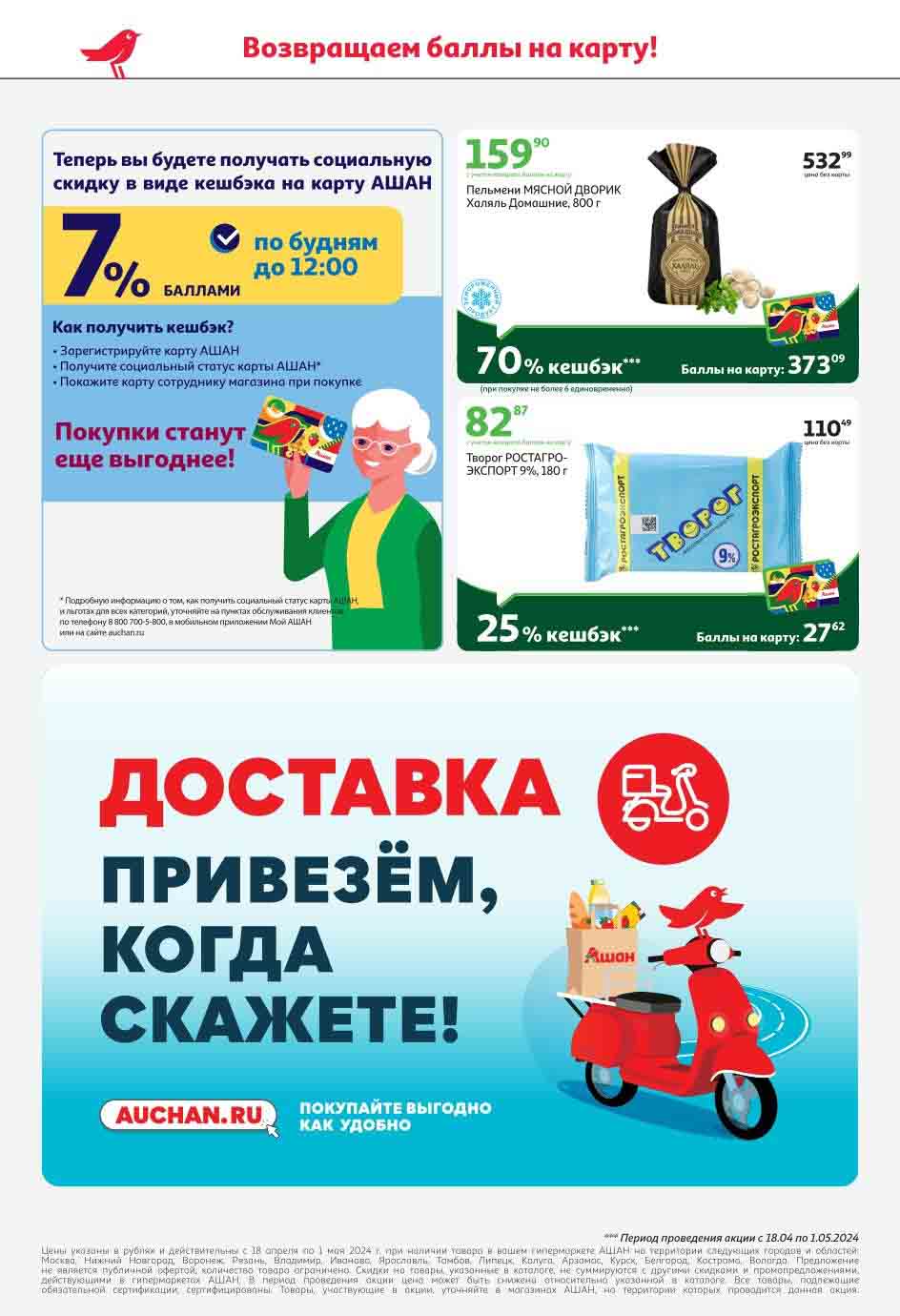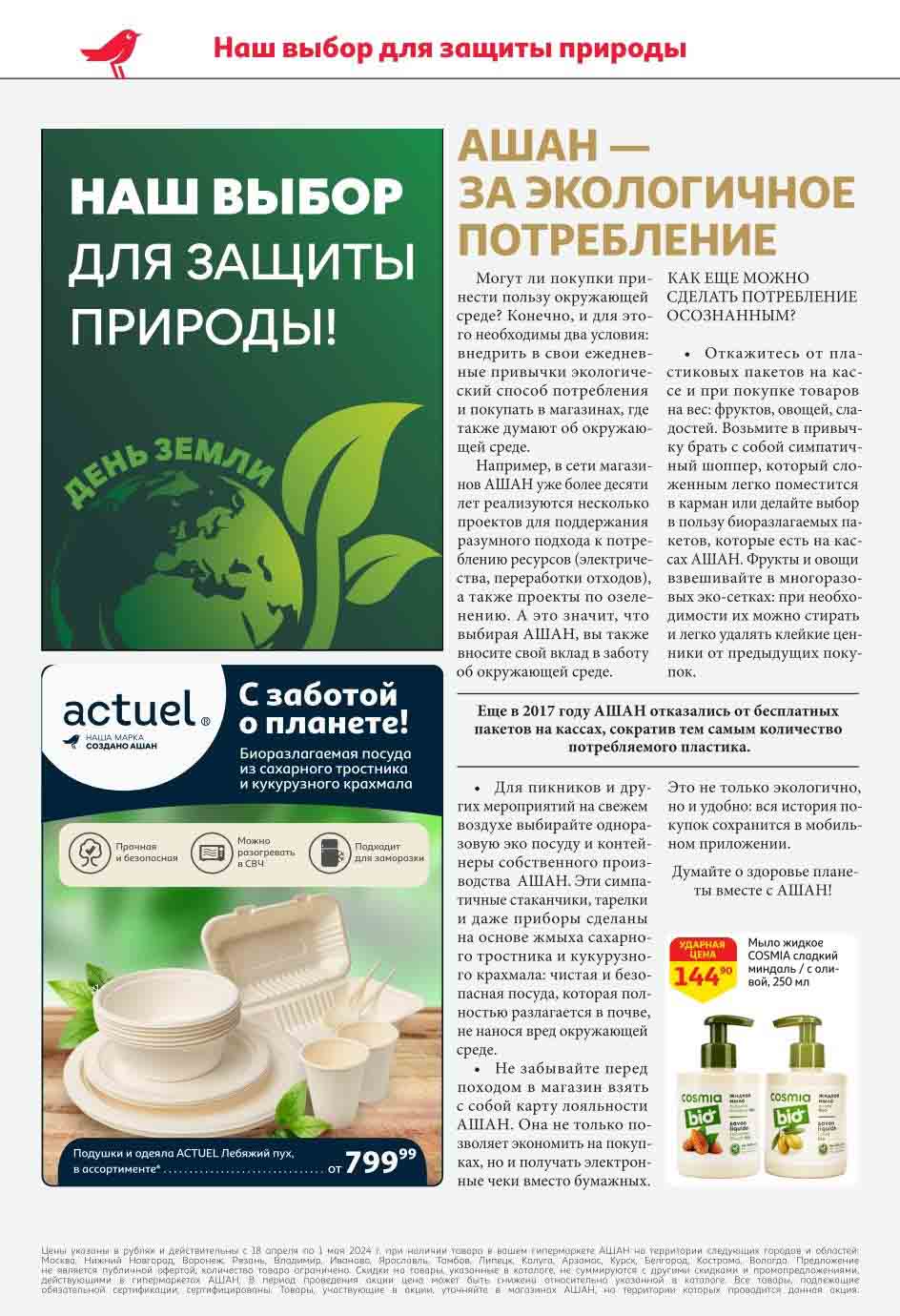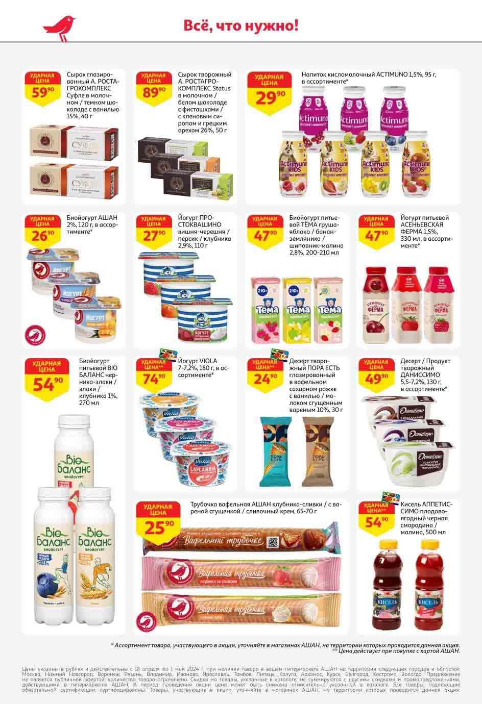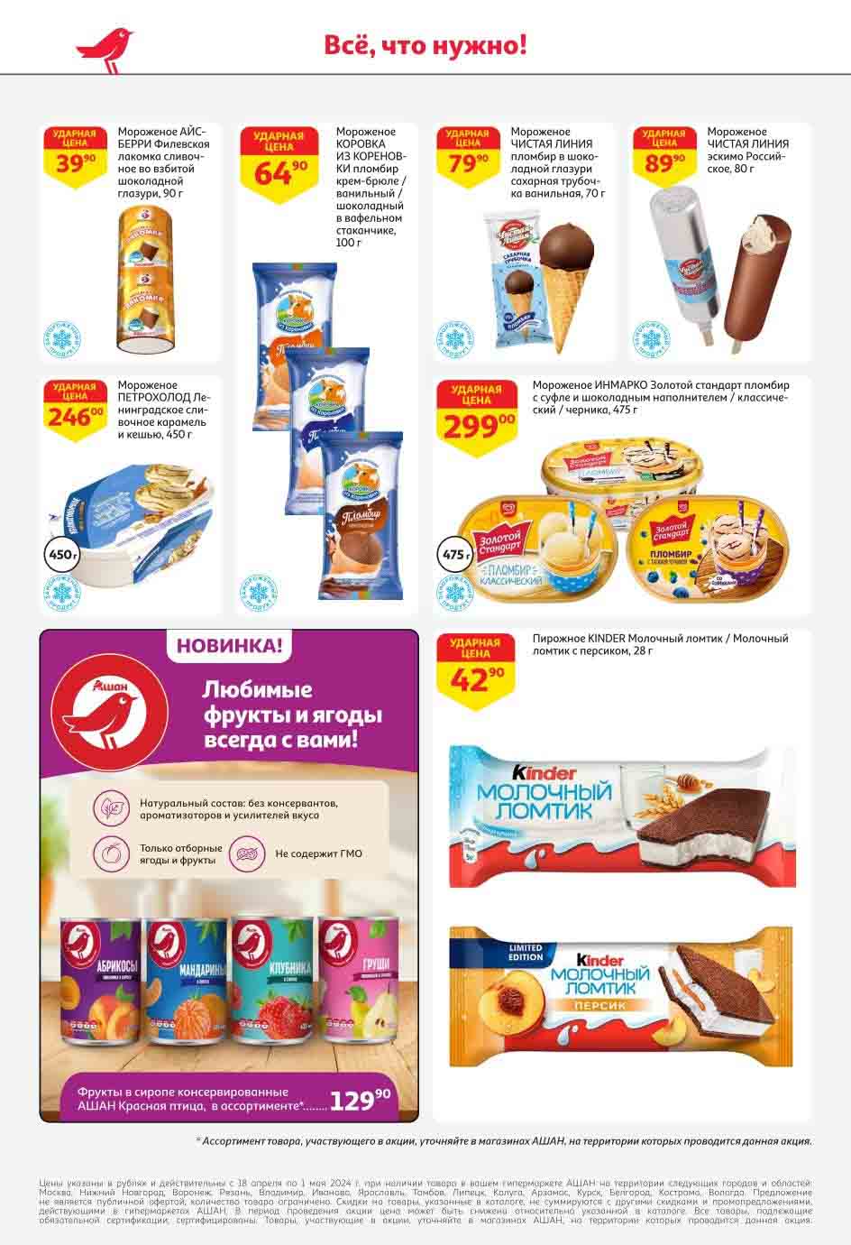 На страницах каталога Ашан вы найдете все свои любимые продукты, которые сейчас предлагаются в супермаркете. Не пропустите последние специальные предложения и сэкономьте на покупках. Предложение действительно при наличии товара на прилавках. Скидки на товары, указанные в каталоге, не суммируются с другими скидками. Изображения товаров могут незначительно отличаться от представленных на полках. Цены по акции Ашан действуют в городах: Москва. Балашиха. Химки. Подольск. Королев. Мытищи. Люберцы. Электросталь. Коломна. Одинцово. Железнодорожный, Серпухов, Орехово-Зуево. Красногорск, Щелково, Сергиев Посад, Пушкино. Жуковский, Ногинск, Раменское и многих других населенных пунктах Московского региона.