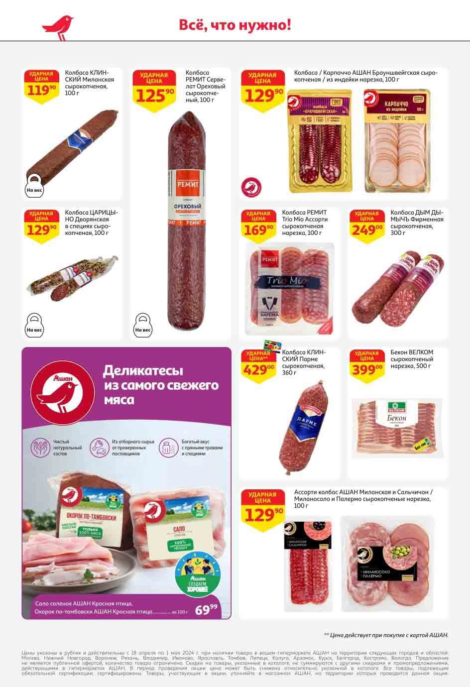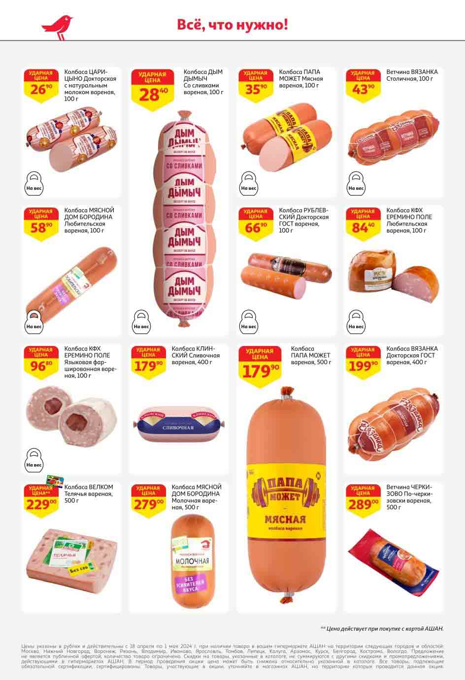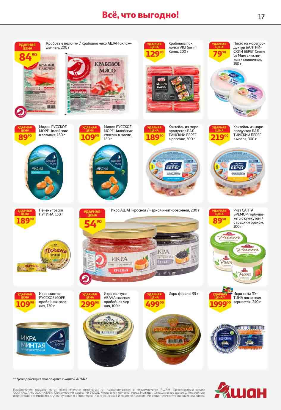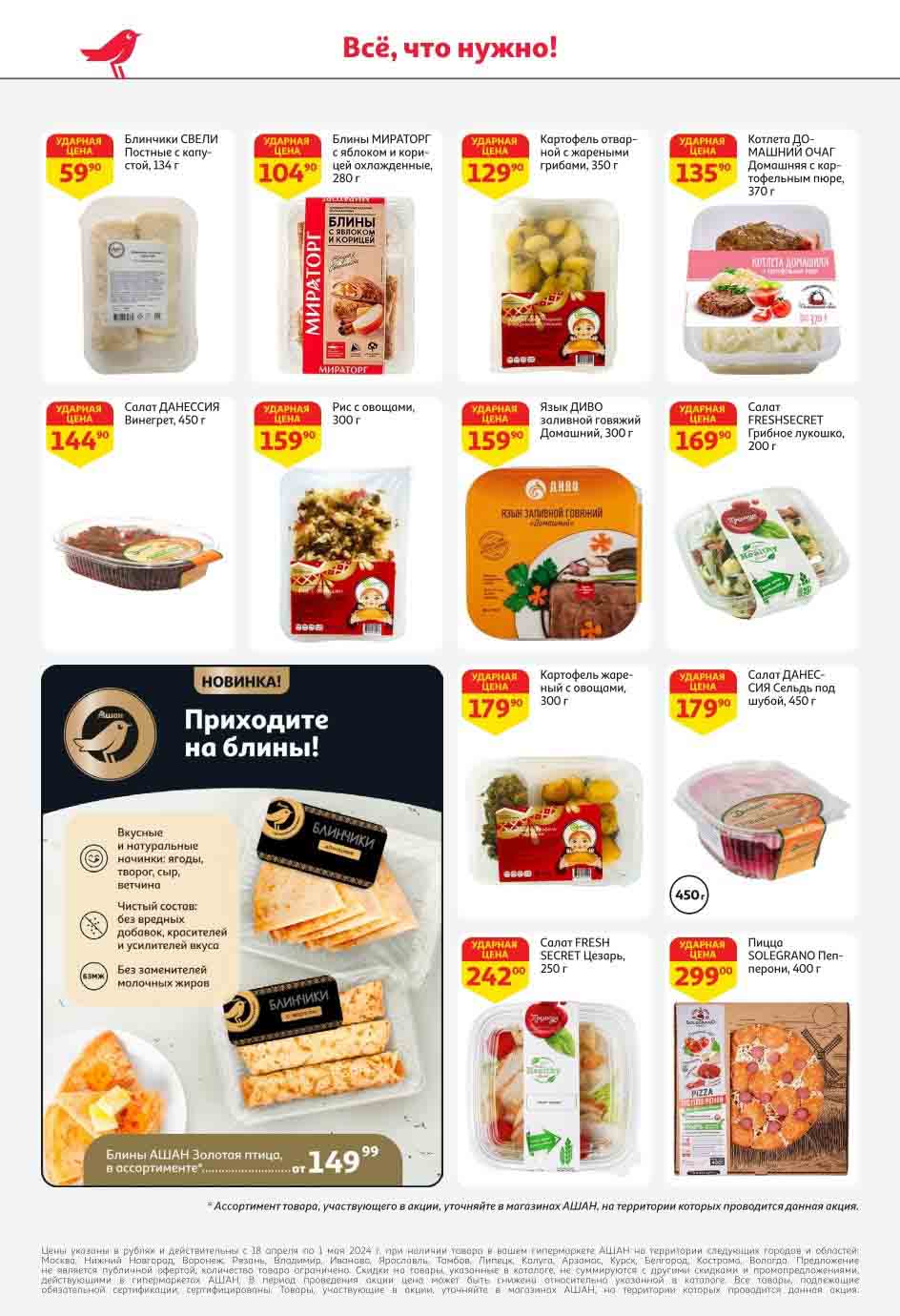 На страницах каталога Ашан вы найдете все свои любимые продукты, которые сейчас предлагаются в супермаркете. Не пропустите последние специальные предложения и сэкономьте на покупках. Предложение действительно при наличии товара на прилавках. Скидки на товары, указанные в каталоге, не суммируются с другими скидками. Изображения товаров могут незначительно отличаться от представленных на полках. Цены по акции Ашан действуют в городах: Москва. Балашиха. Химки. Подольск. Королев. Мытищи. Люберцы. Электросталь. Коломна. Одинцово. Железнодорожный, Серпухов, Орехово-Зуево. Красногорск, Щелково, Сергиев Посад, Пушкино. Жуковский, Ногинск, Раменское и многих других населенных пунктах Московского региона.