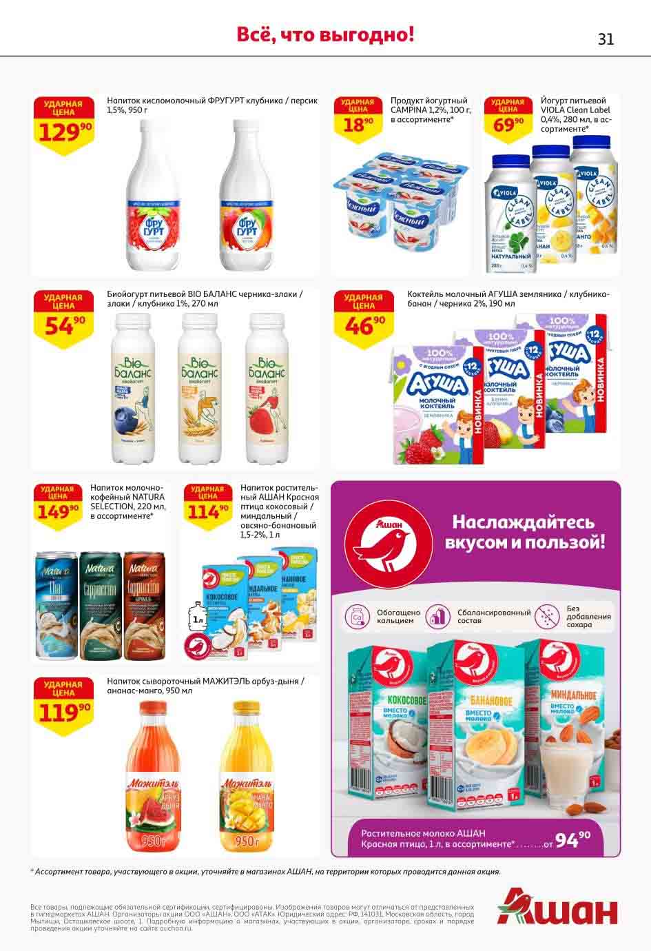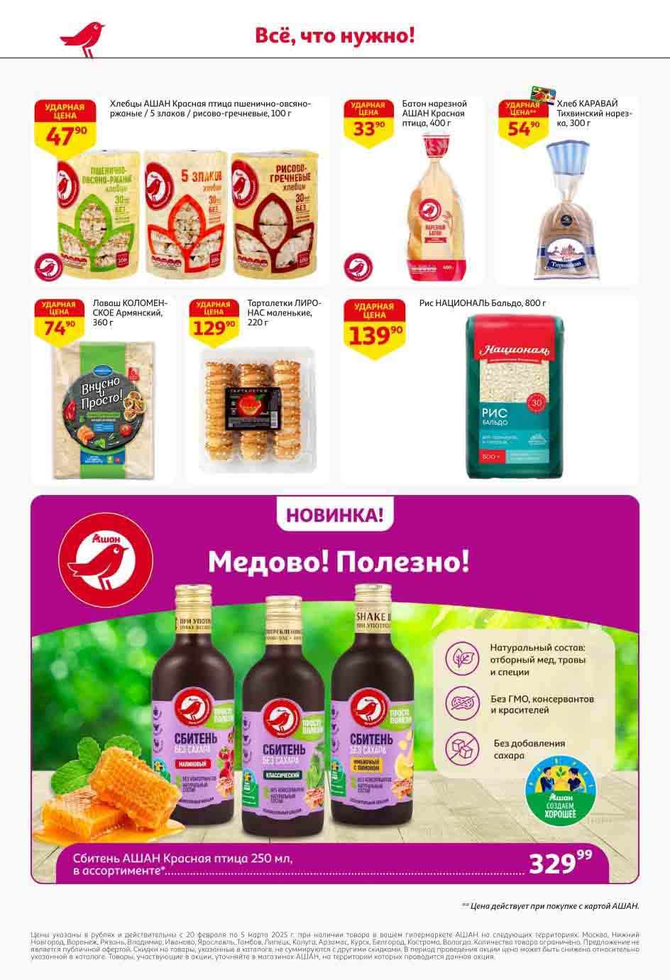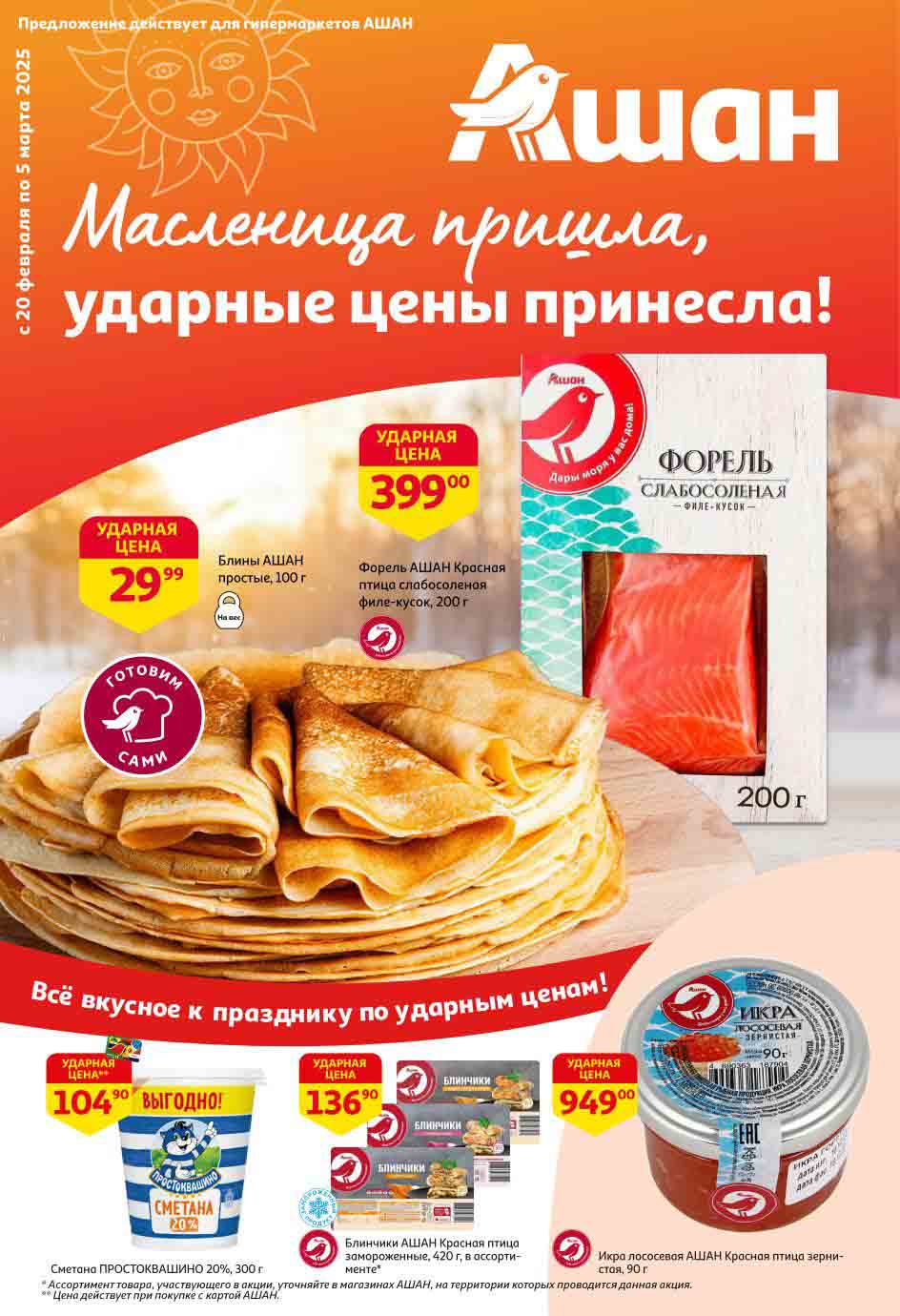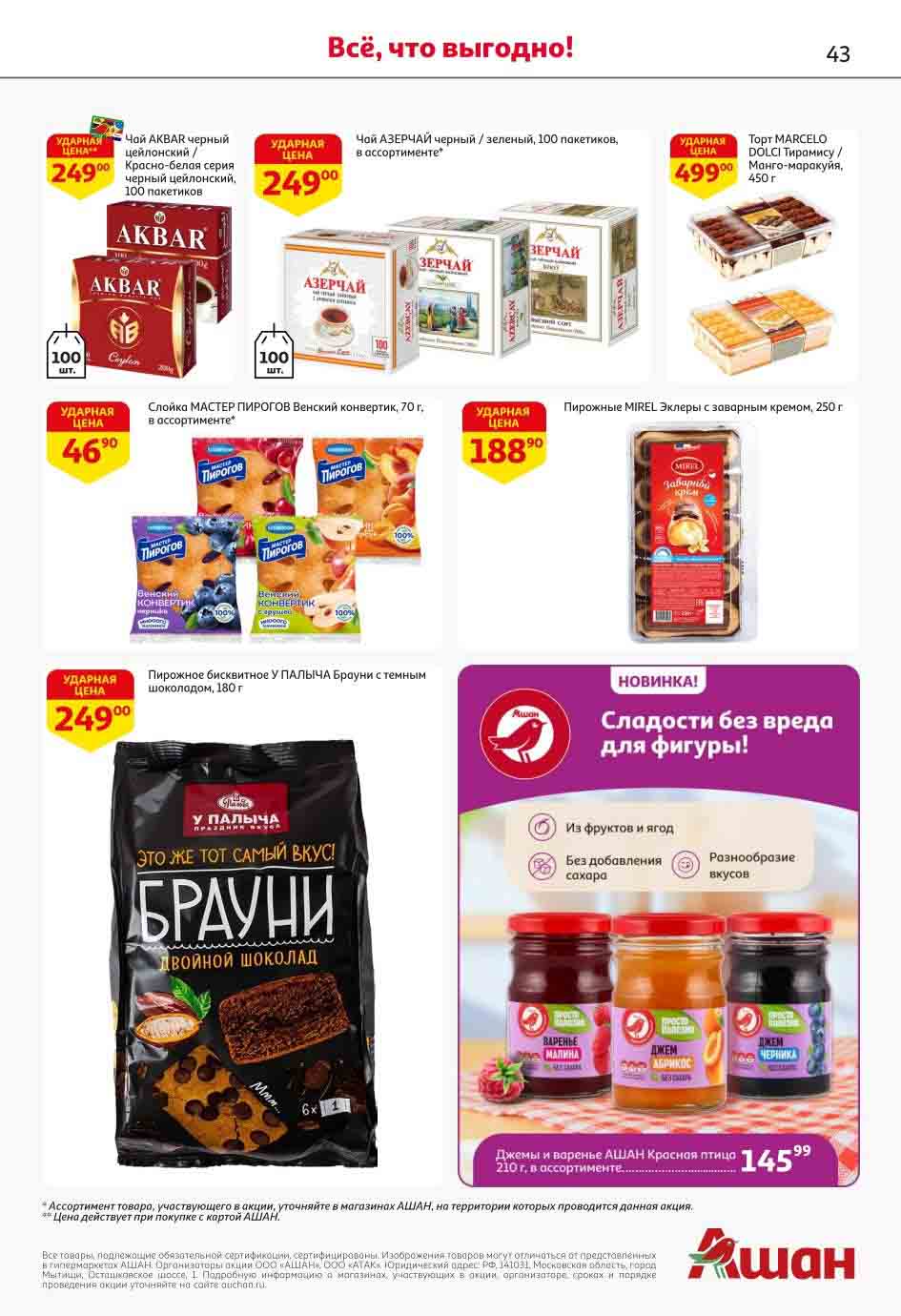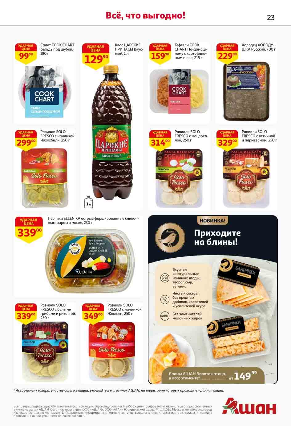 На страницах каталога Ашан вы найдете все свои любимые продукты, которые сейчас предлагаются в супермаркете. Не пропустите последние специальные предложения и сэкономьте на покупках. Предложение действительно при наличии товара на прилавках. Скидки на товары, указанные в каталоге, не суммируются с другими скидками. Изображения товаров могут незначительно отличаться от представленных на полках. Цены по акции Ашан действуют в городах: Москва. Балашиха. Химки. Подольск. Королев. Мытищи. Люберцы. Электросталь. Коломна. Одинцово. Железнодорожный, Серпухов, Орехово-Зуево. Красногорск, Щелково, Сергиев Посад, Пушкино. Жуковский, Ногинск, Раменское и многих других населенных пунктах Московского региона.