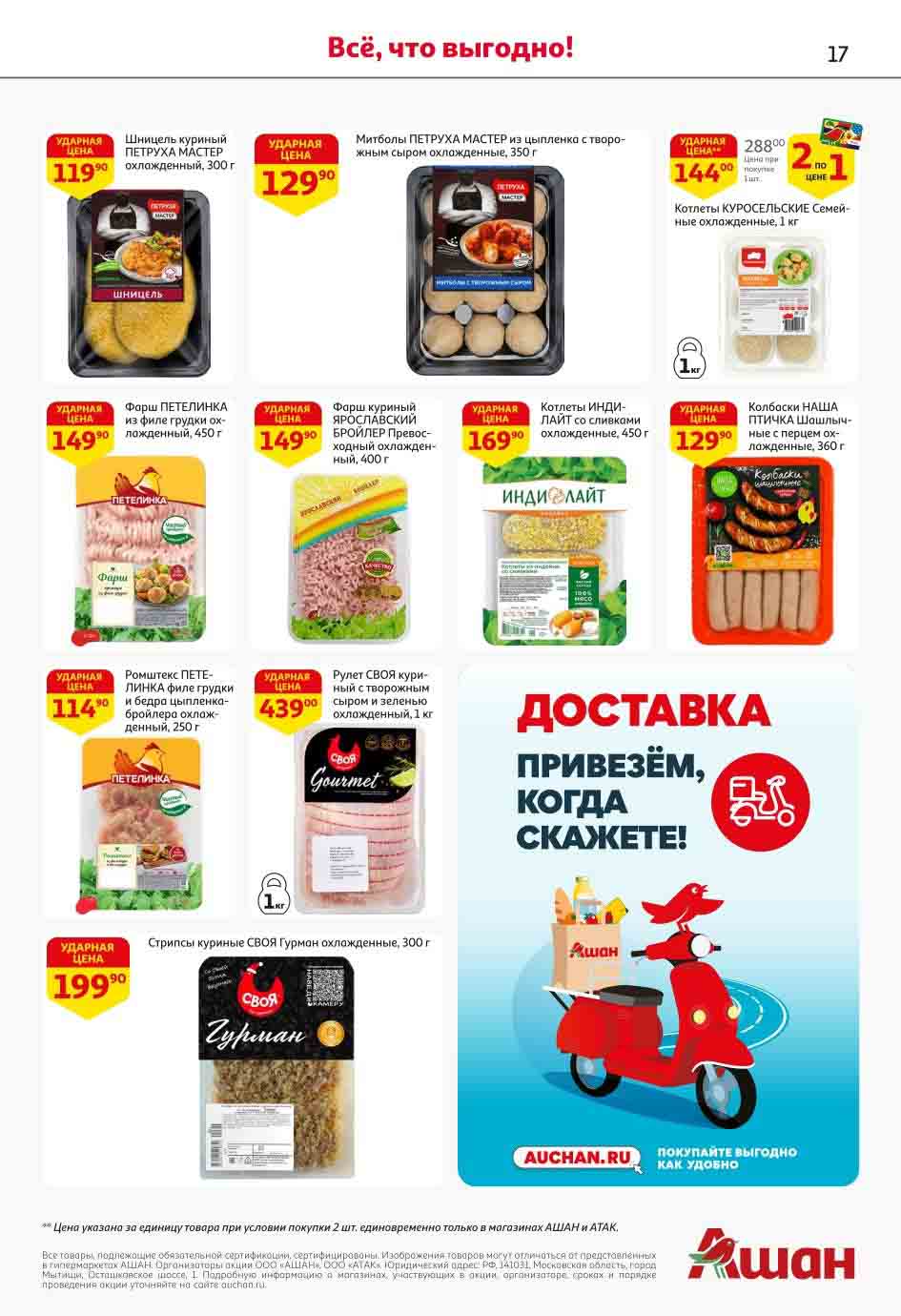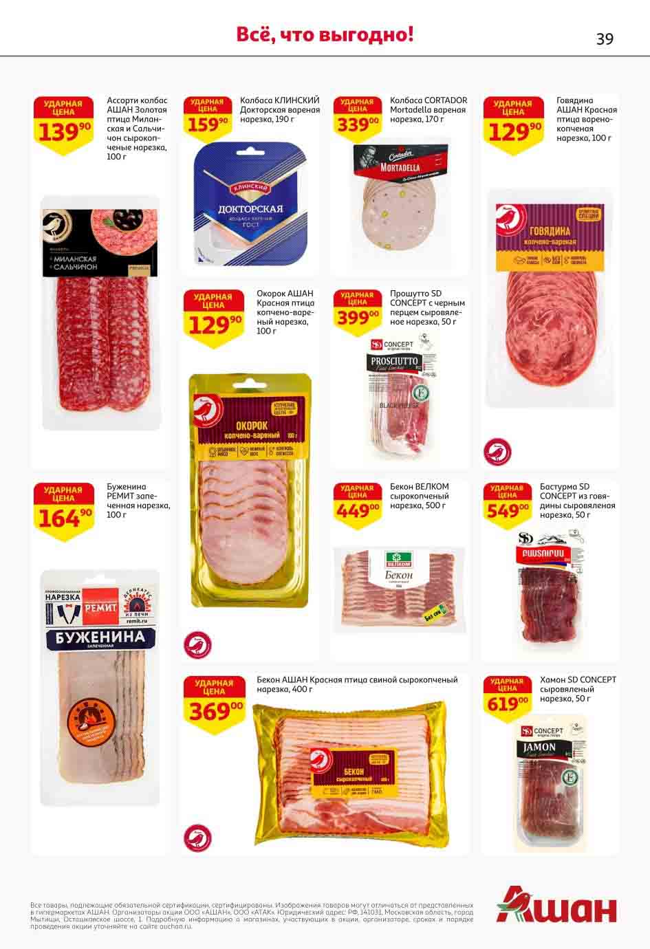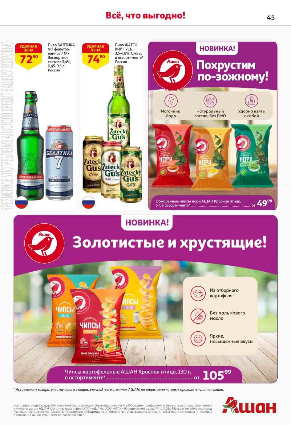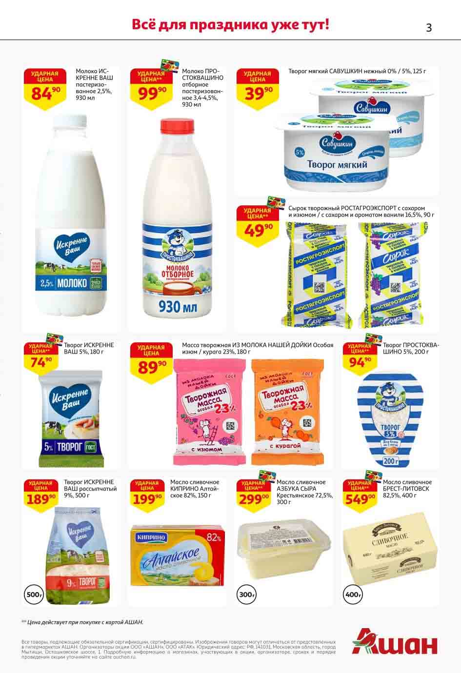 На страницах каталога Ашан вы найдете все свои любимые продукты, которые сейчас предлагаются в супермаркете. Не пропустите последние специальные предложения и сэкономьте на покупках. Предложение действительно при наличии товара на прилавках. Скидки на товары, указанные в каталоге, не суммируются с другими скидками. Изображения товаров могут незначительно отличаться от представленных на полках. Цены по акции Ашан действуют в городах: Москва. Балашиха. Химки. Подольск. Королев. Мытищи. Люберцы. Электросталь. Коломна. Одинцово. Железнодорожный, Серпухов, Орехово-Зуево. Красногорск, Щелково, Сергиев Посад, Пушкино. Жуковский, Ногинск, Раменское и многих других населенных пунктах Московского региона.
